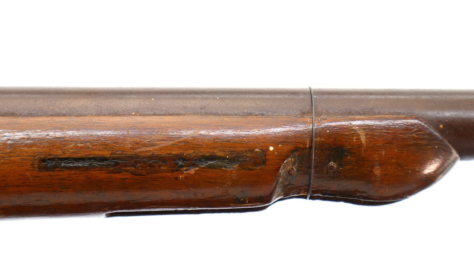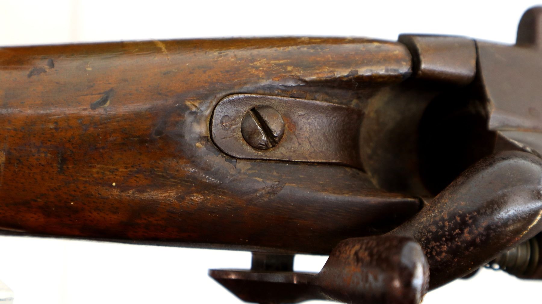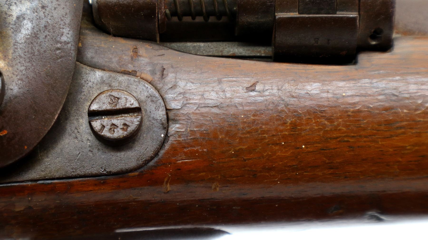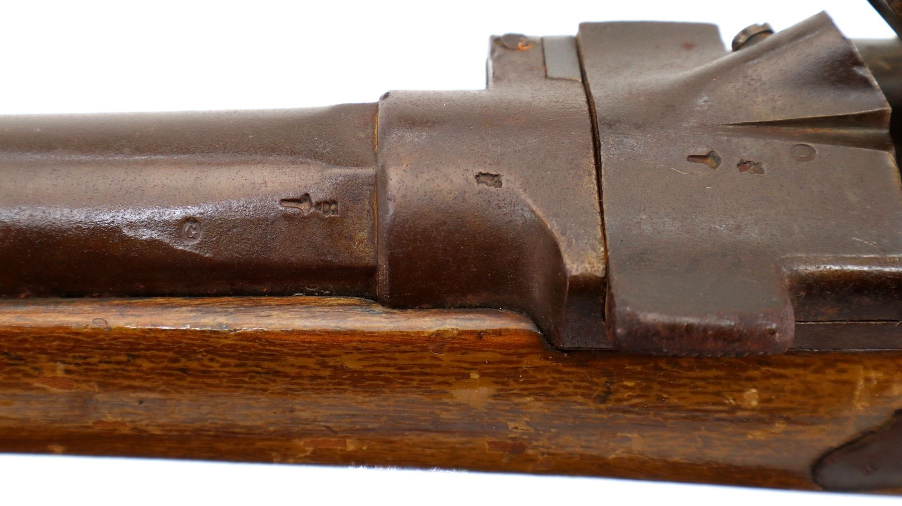 Wear: Metal finish turning brown with pitting, rust, scratches, handling marks and wear. Stock shows marks, scratches and wear.