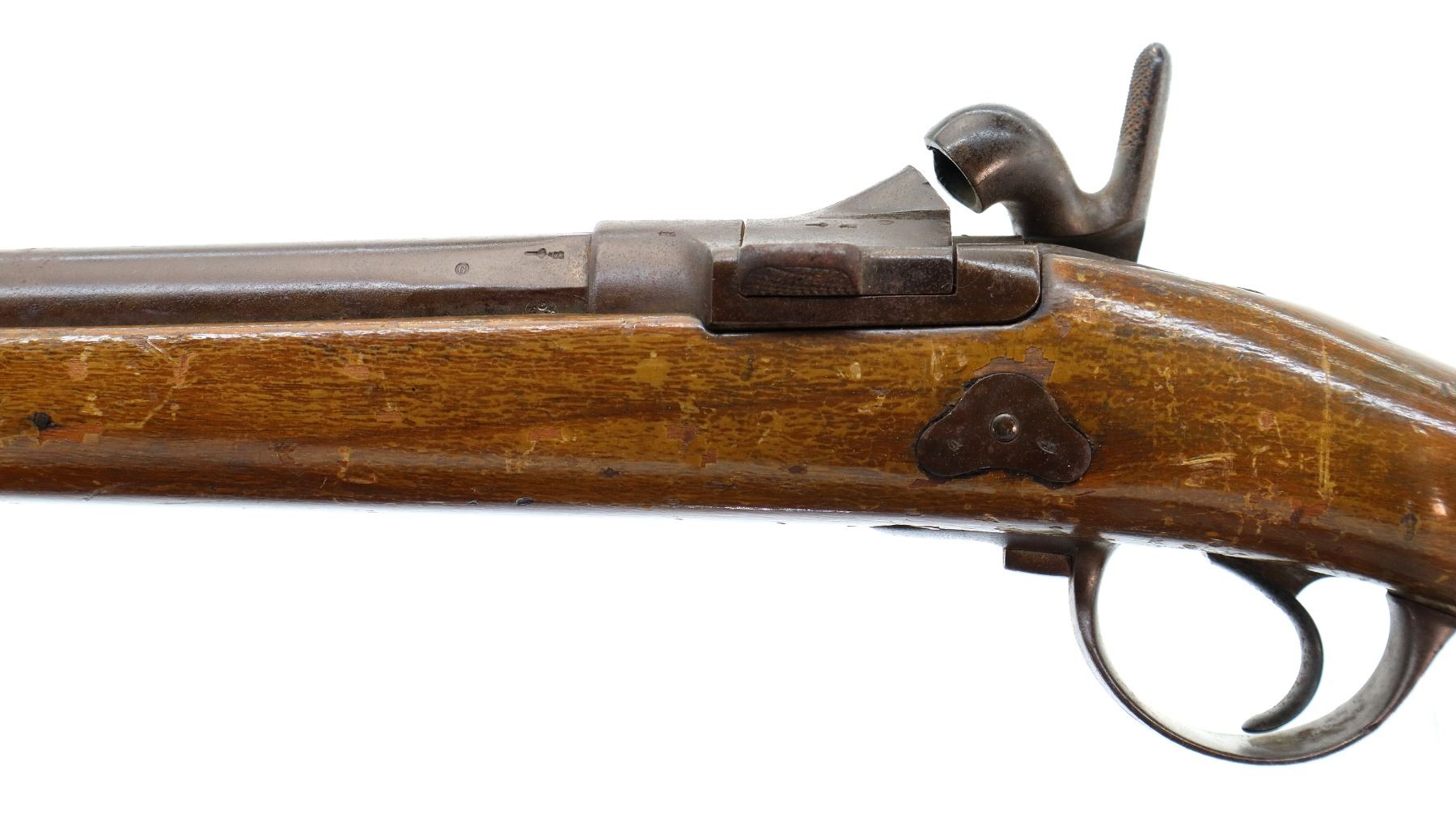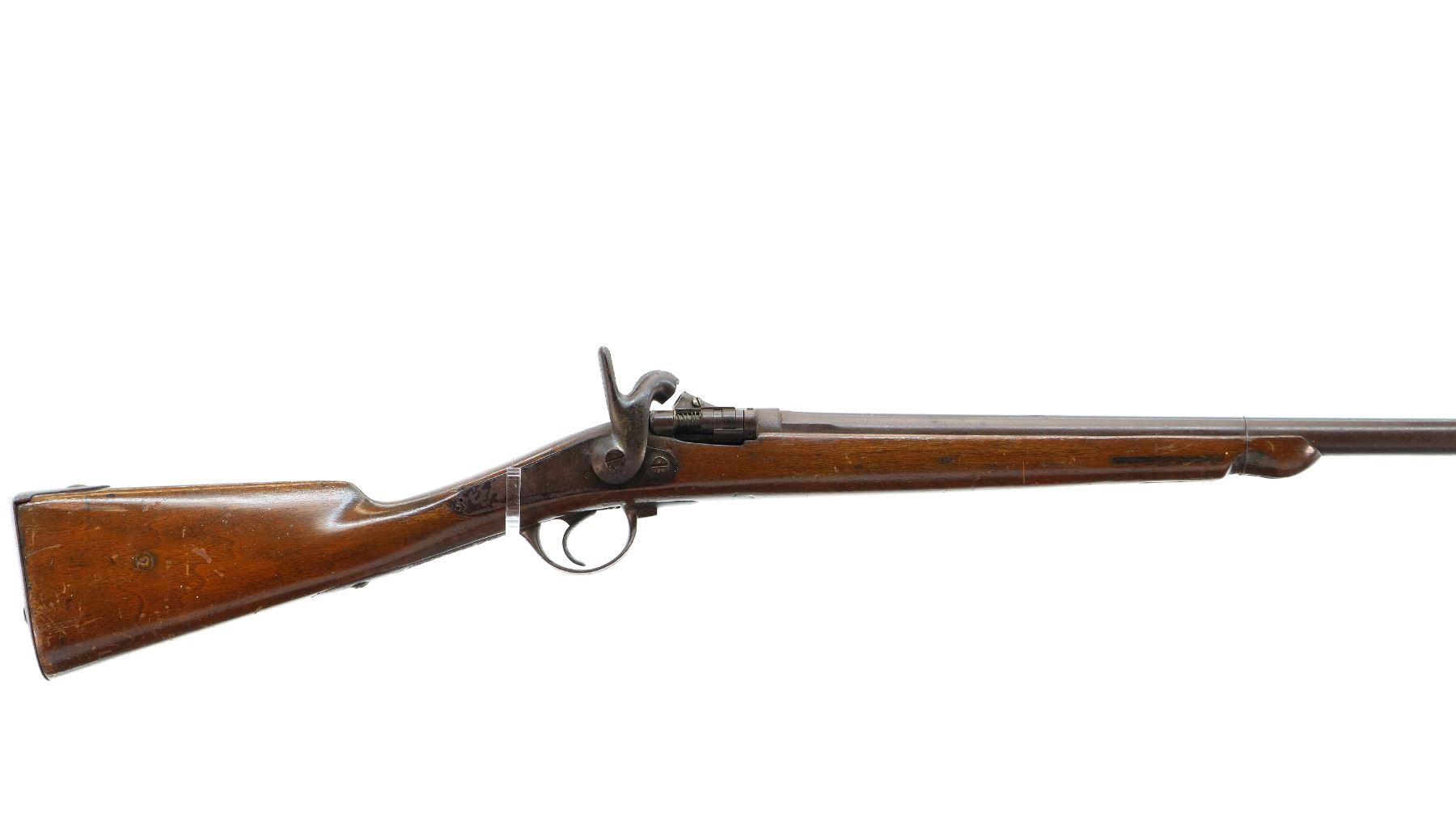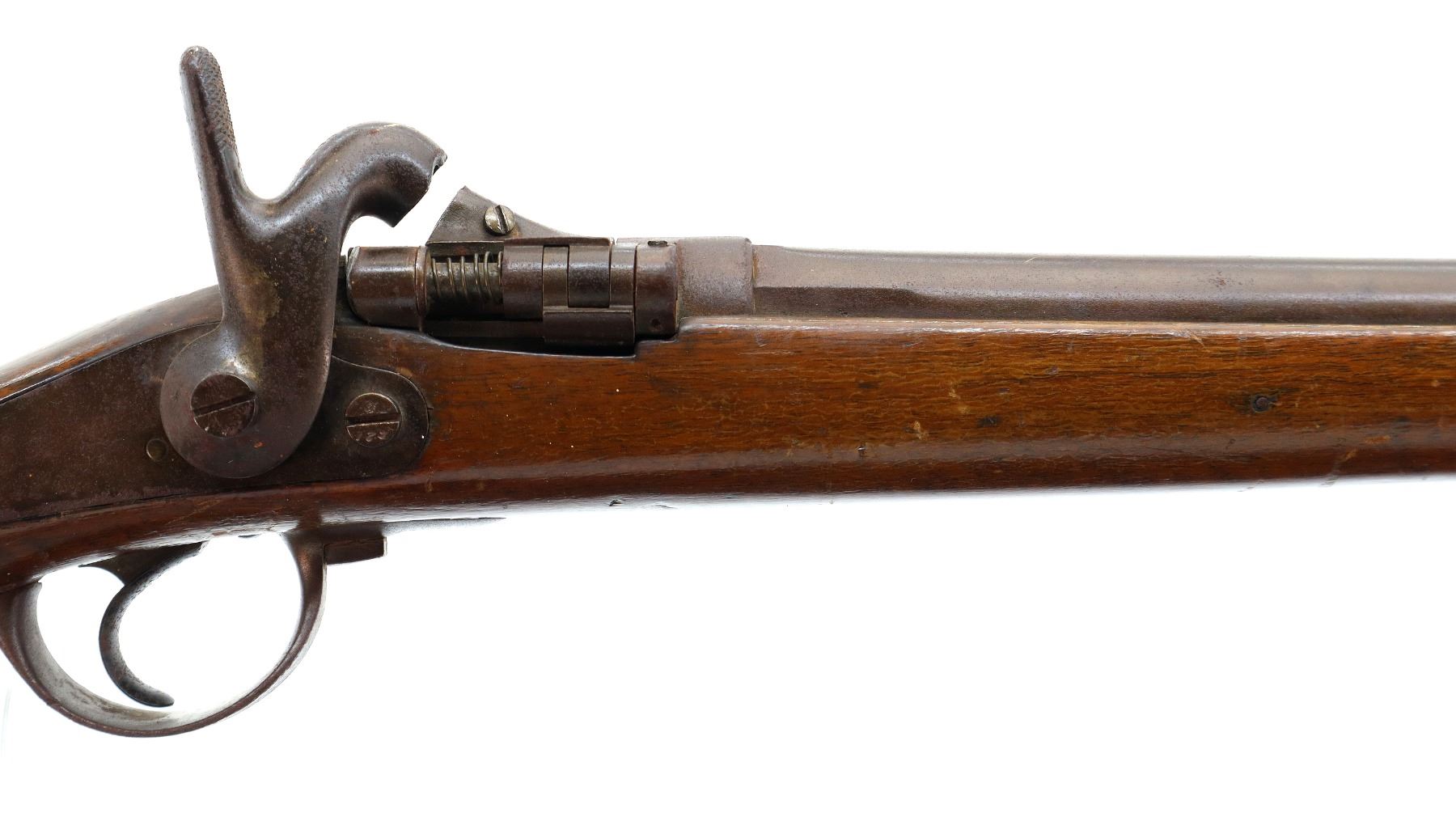 Main Description: Brass bead, tapered round barrel, breech block missing firing pin assembly, checkered spur hammer and back action lock that functions, extractor. One piece sporterized wood stock, forend wrapped with wire, straight grip cracked behind lock, smooth steel butt plate.