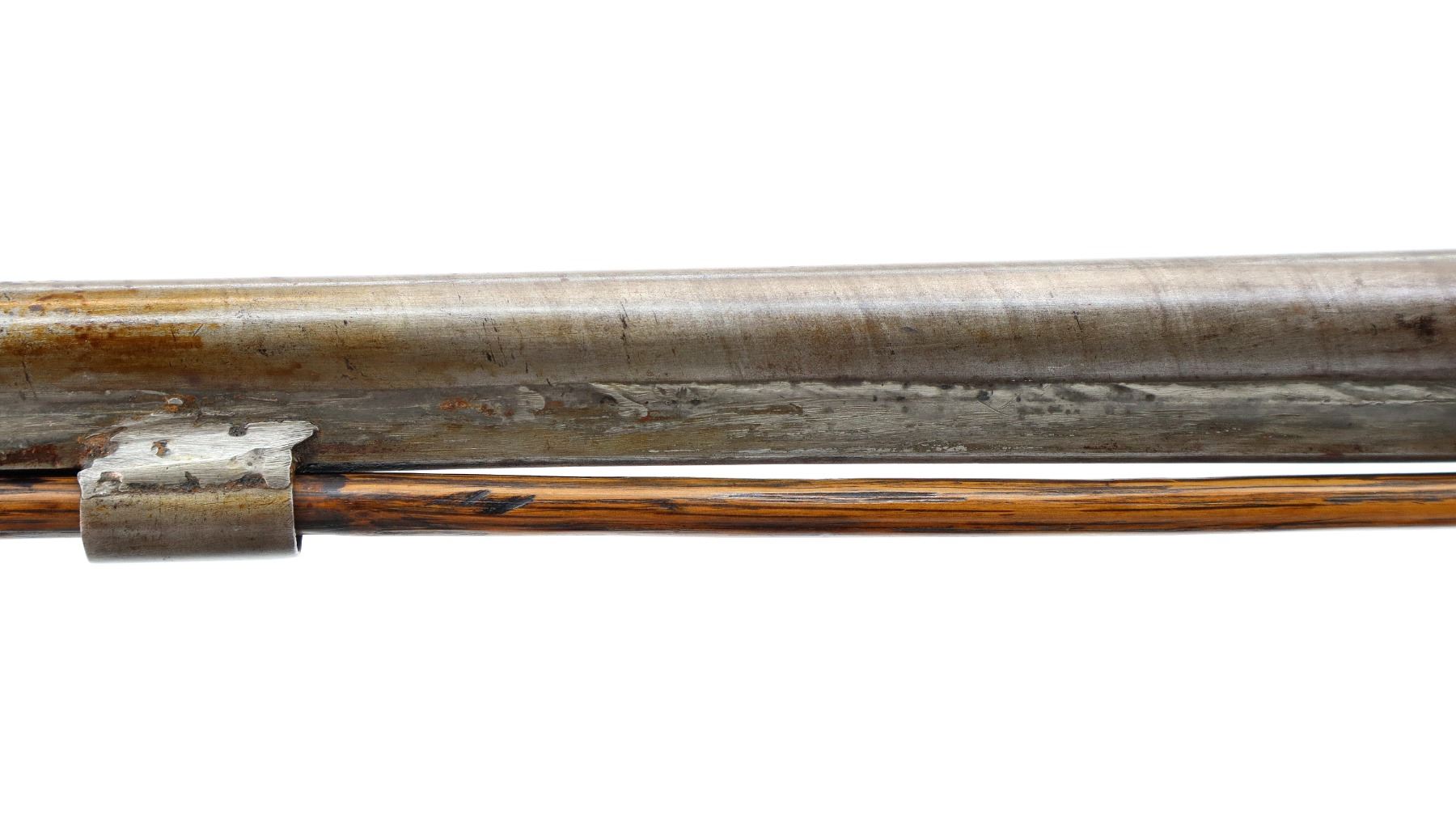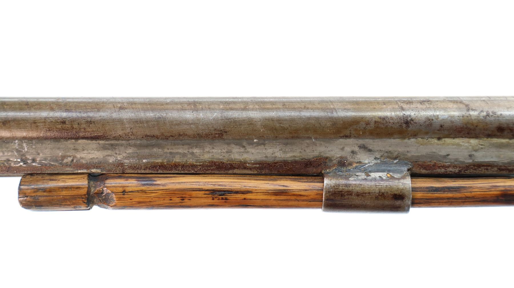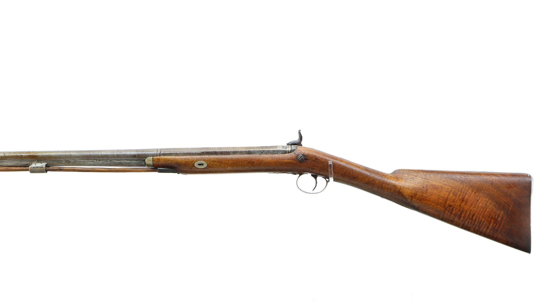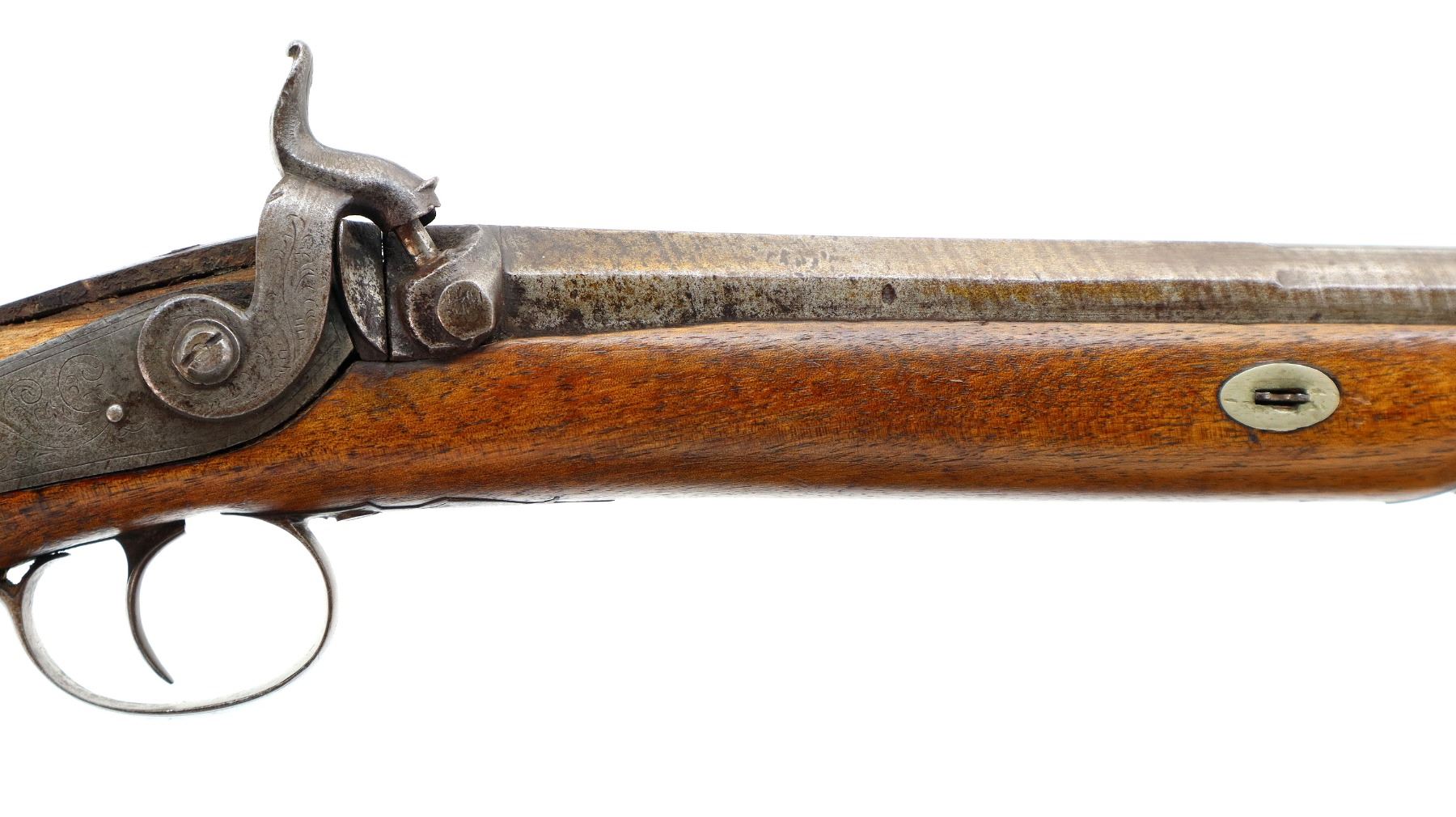 Main Description: Brass bead, Damascus barrel, 1/4 octagon and 2/3rd round barrel, engraved tang and back action lock with checkered spur hammer that functions. One piece half length wood stock, broken forearm wedge, checkered straight grip with vanity plate, stock chipped, cracked and broken behind lock, tang and barrel, smooth steel butt plate, replaced wood ramrod, ramrod pipes have been soldered on.