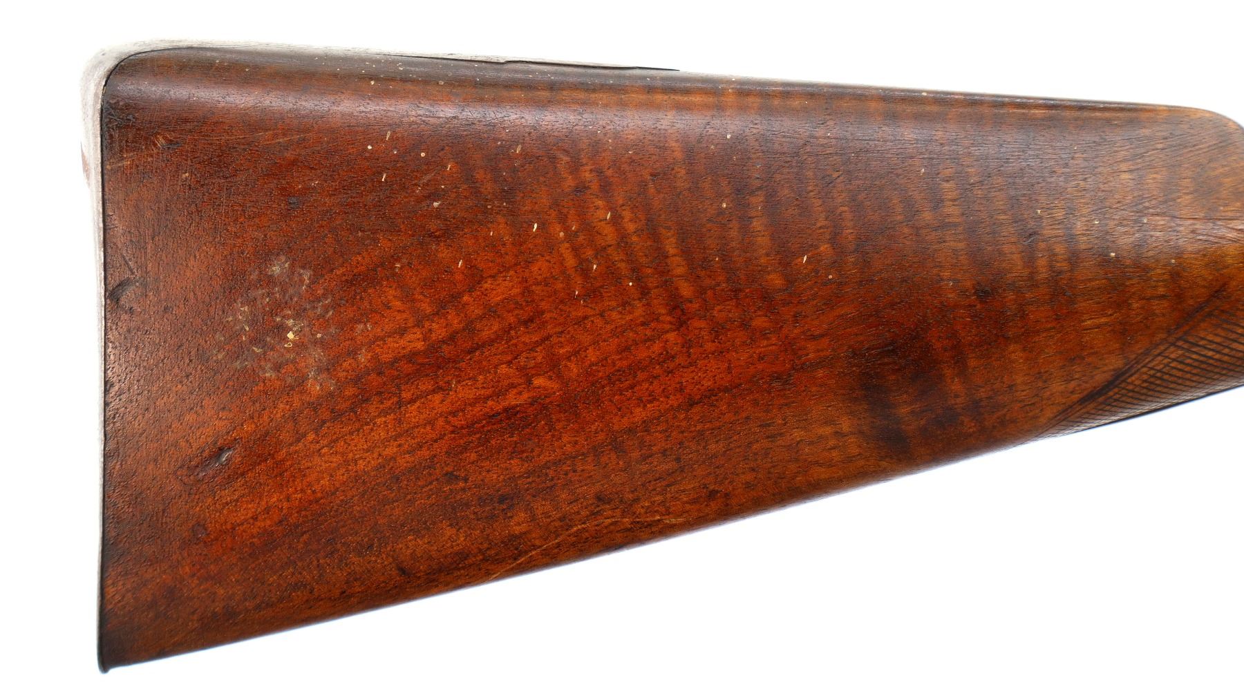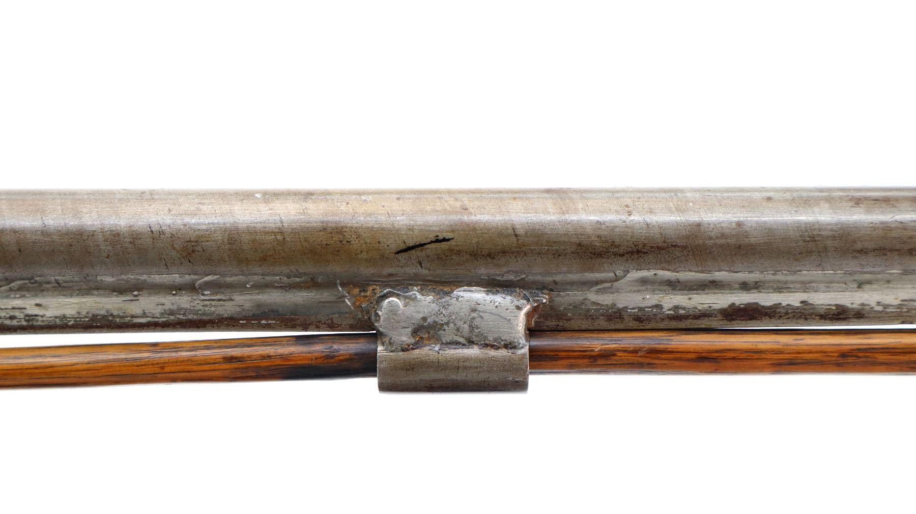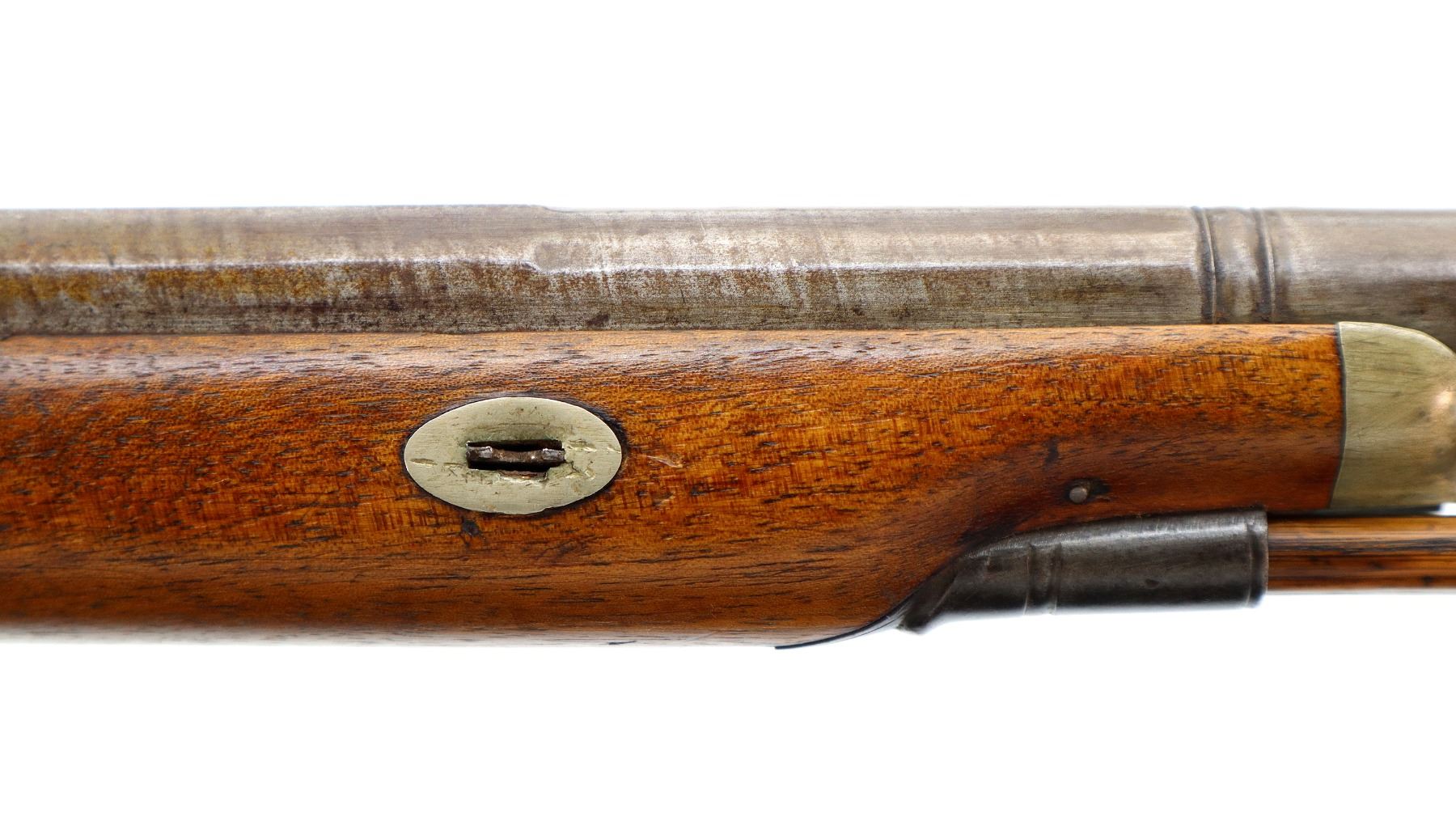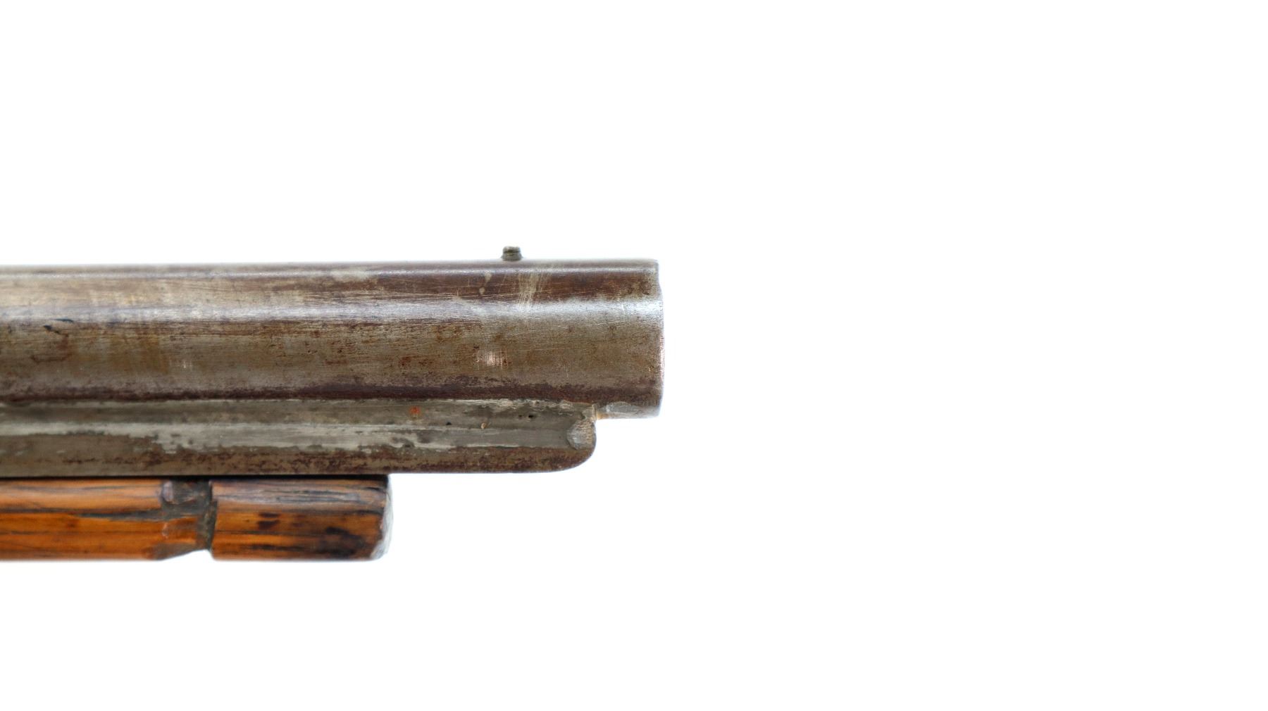Main Description: Brass bead, Damascus barrel, 1/4 octagon and 2/3rd round barrel, engraved tang and back action lock with checkered spur hammer that functions. One piece half length wood stock, broken forearm wedge, checkered straight grip with vanity plate, stock chipped, cracked and broken behind lock, tang and barrel, smooth steel butt plate, replaced wood ramrod, ramrod pipes have been soldered on.