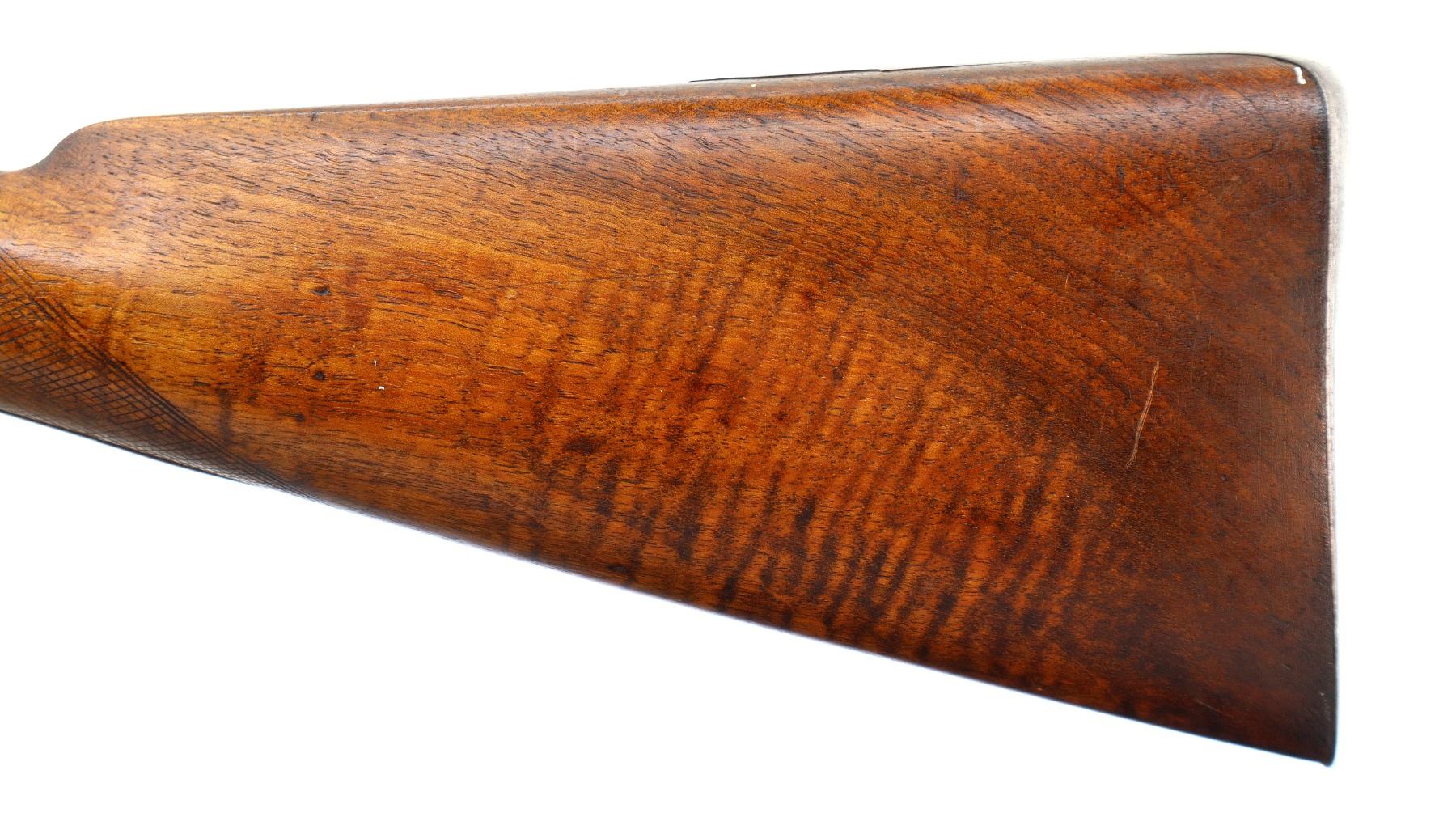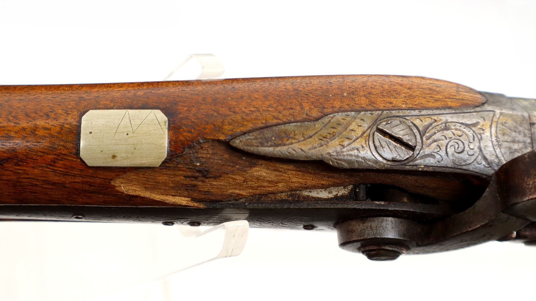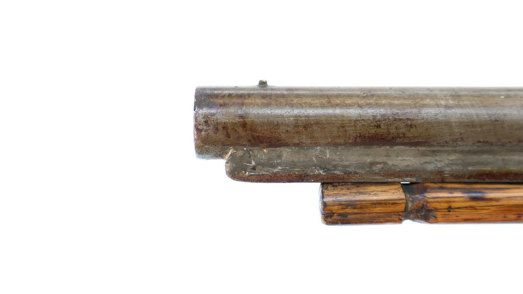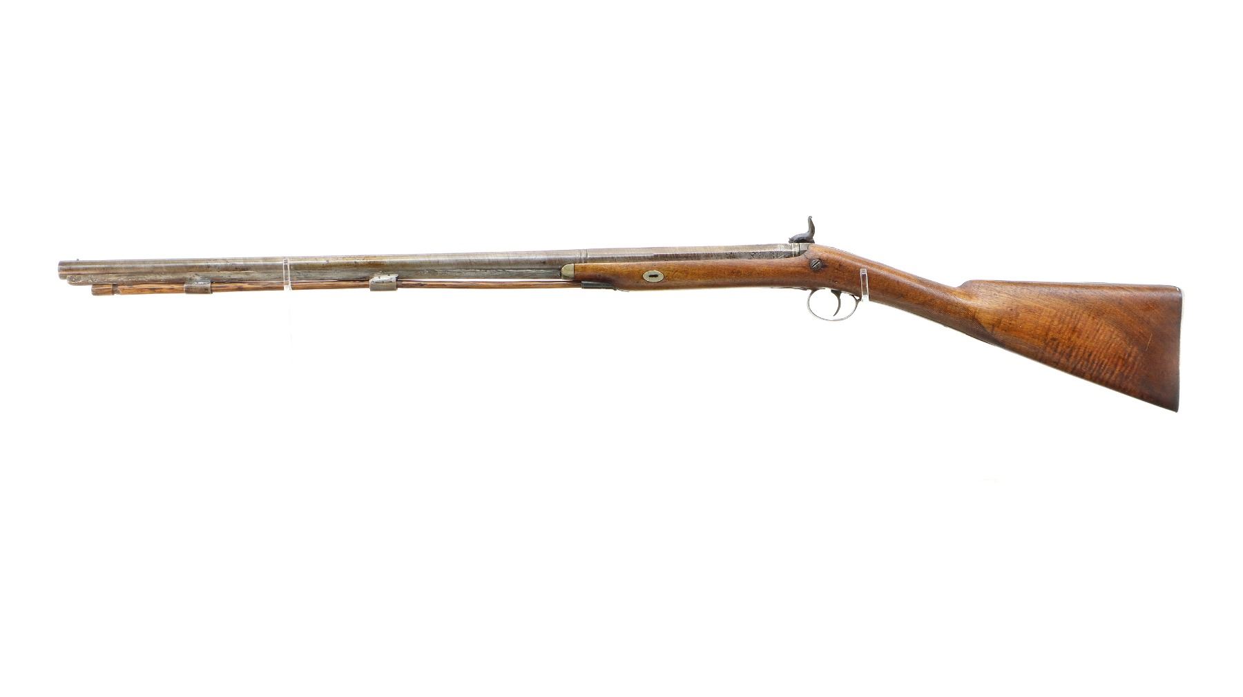 Main Description: Brass bead, Damascus barrel, 1/4 octagon and 2/3rd round barrel, engraved tang and back action lock with checkered spur hammer that functions. One piece half length wood stock, broken forearm wedge, checkered straight grip with vanity plate, stock chipped, cracked and broken behind lock, tang and barrel, smooth steel butt plate, replaced wood ramrod, ramrod pipes have been soldered on.