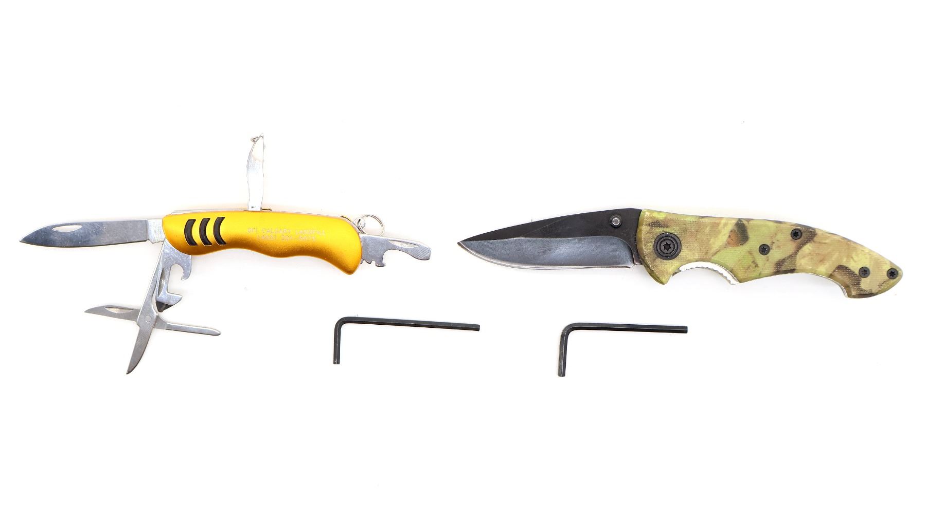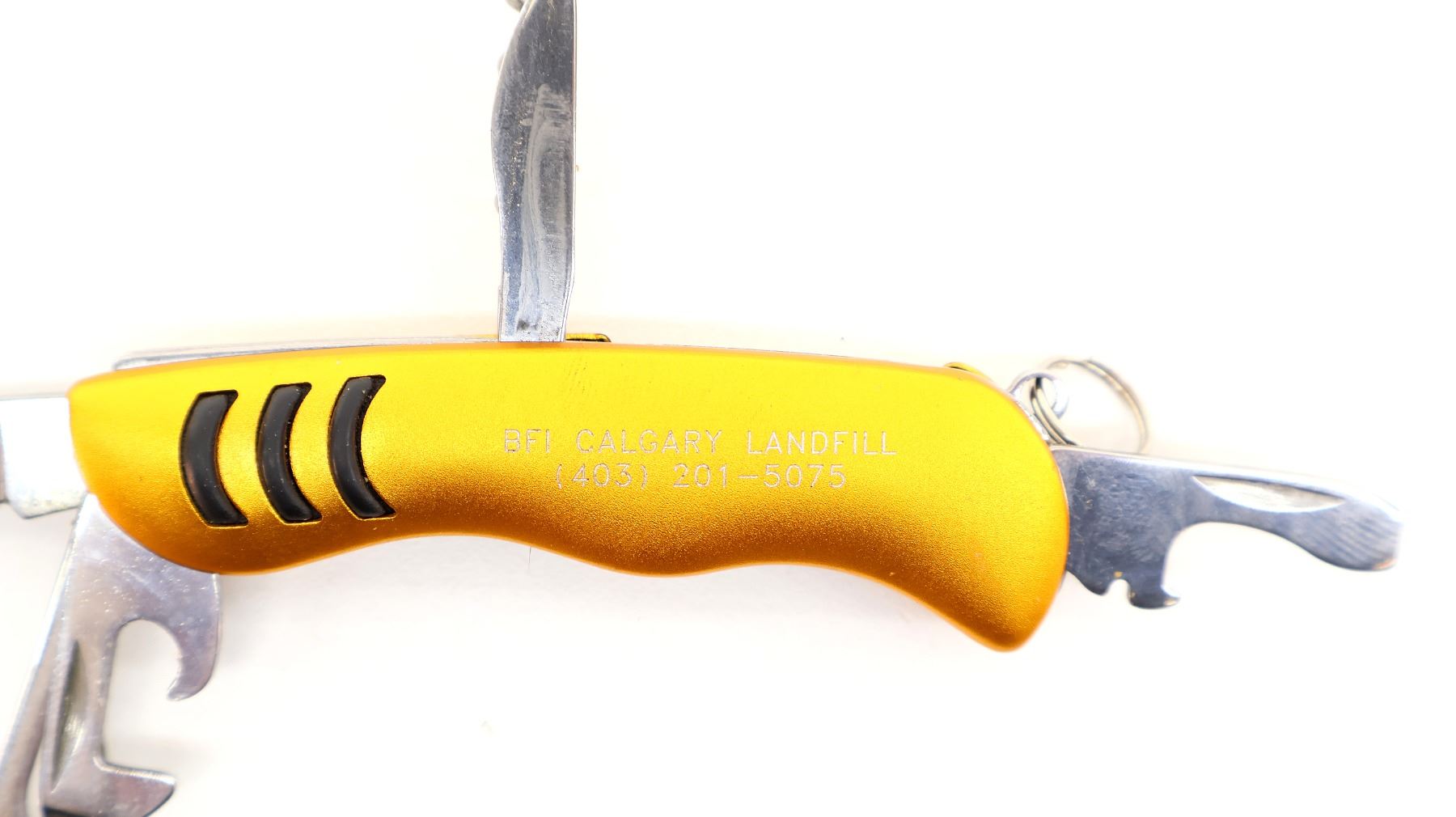 LOT INCLUDES; (1) UNKNOWN CAMO FOLDING KNIFE, STAINLESS STEEL BLADE, MARKED "CCO", "STAINLESS", ETC., POLYMER HANDLE, UNMARKED, SHOWS WEAR & TEAR / USE MARKS, BLADE OVERALL LENGTH APPROX. 2.75", OVERALL LENGTH APPROX. 6.5" & (1) BFI CALGARY LANDFILL MULTI-TOOL POCKET KNIFE, INCLUDES; BLADE, SCISSORS, CORKSCREW, ETC., STAINLESS STEEL BLADE, MARKED "STAINLESS", ETC., METAL HANDLE, MARKED "BFI CALGARY LANDFILL", ETC., SHOWS WEAR & TEAR / USE MARKS, BLADE OVERALL LENGTH APPROX. 2.25", OVERALL LENGTH APPROX. 2 7/8", ETC. SEE PHOTOS.