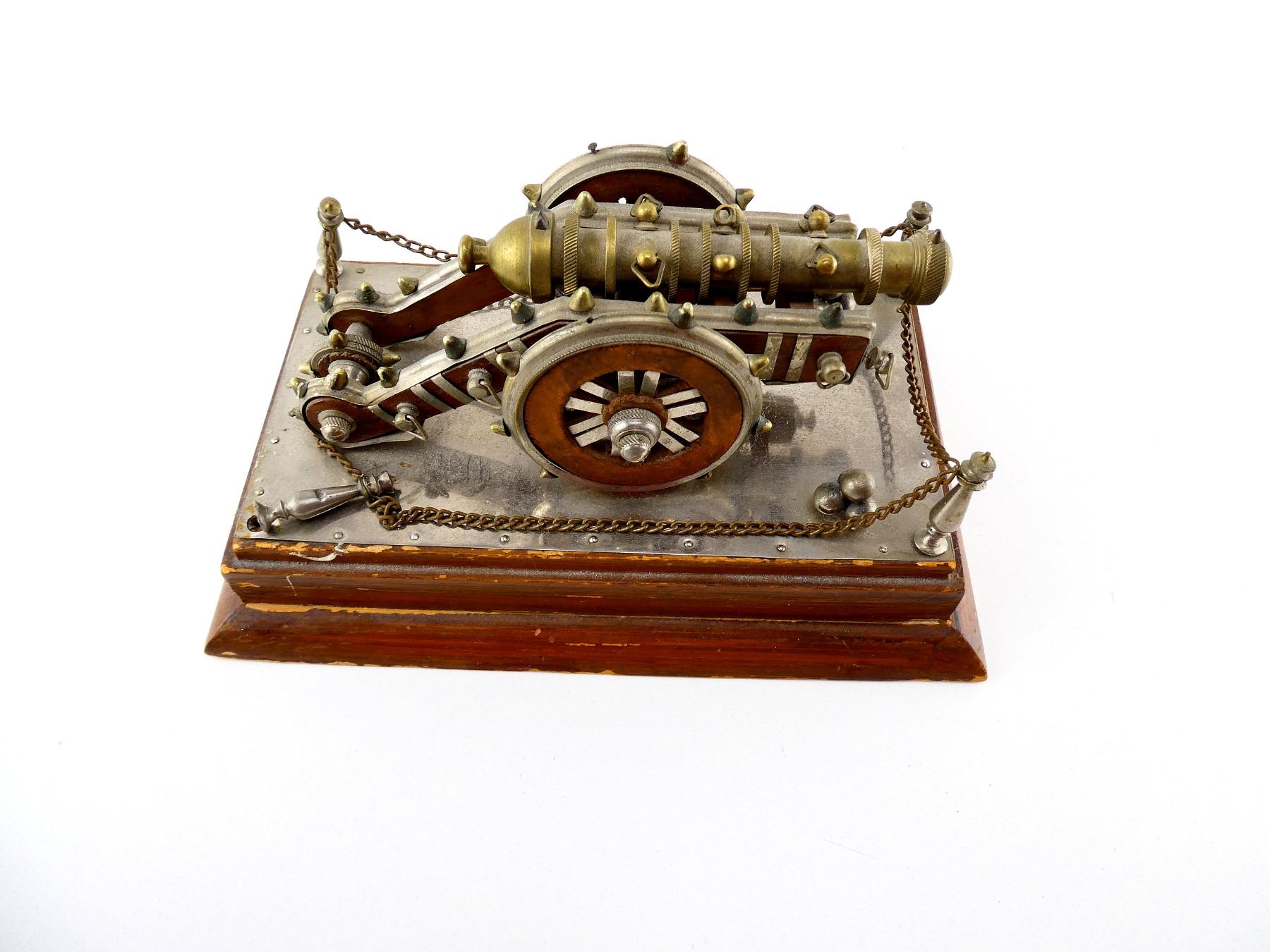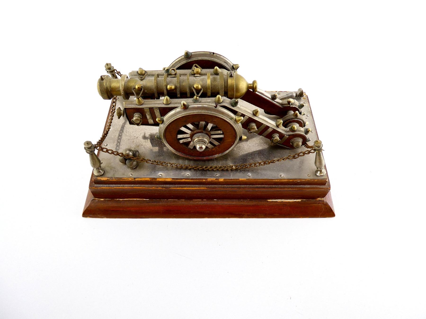 (1) WOOD / BRASS / METAL CONSTRUCTED CANNON, CANNON FIXED IN PLACE, WHEELS FIXED IN PLACE, WOODEN BASE, POST & CHAIN BORDER SOME POSTS BEND / NO LONGER ATTACHED, NO VISIBLE MARKINGS, WITH BASE APPROX. 8" X 4 1/8" X 4". SEE PHOTOS.