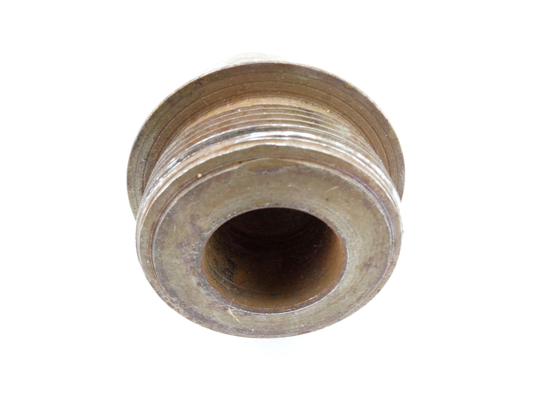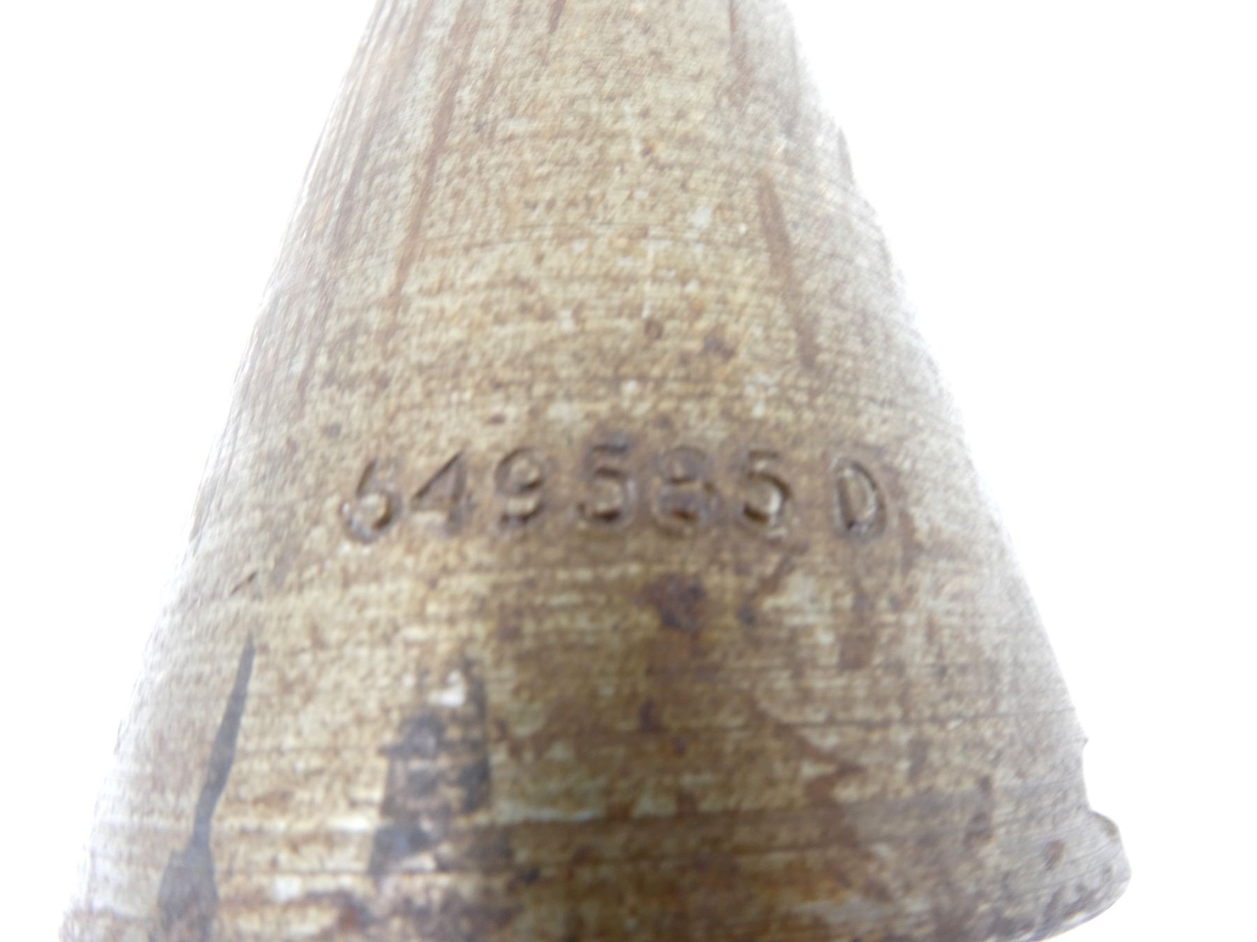 (1) STEEL FUZE TIP MARKED: "549585 D", THREADING DIA. APPROX. 2" & OVERALL LENGTH APPROX. 4.5". SEE PHOTOS.