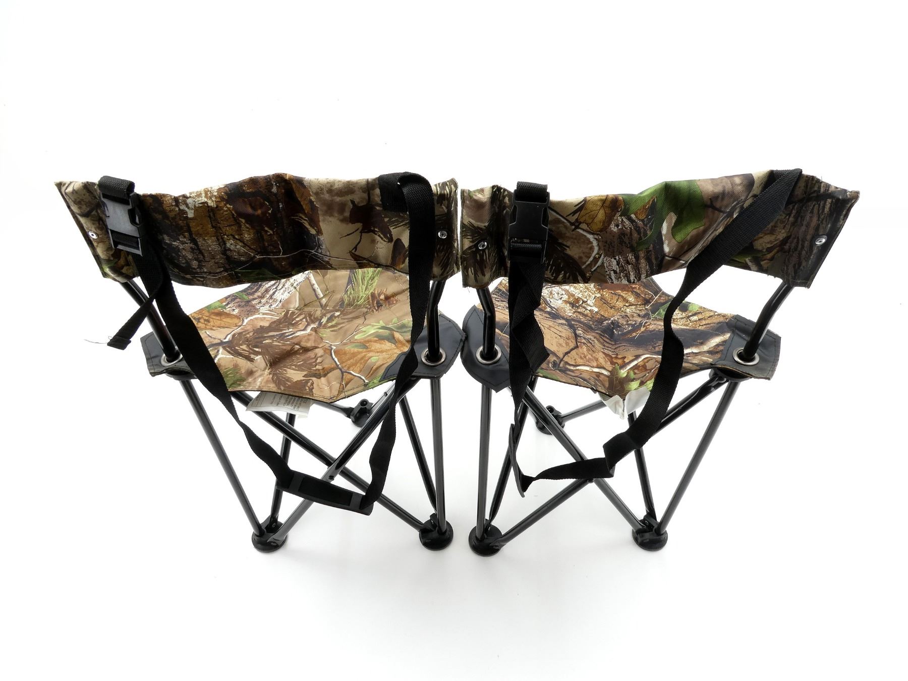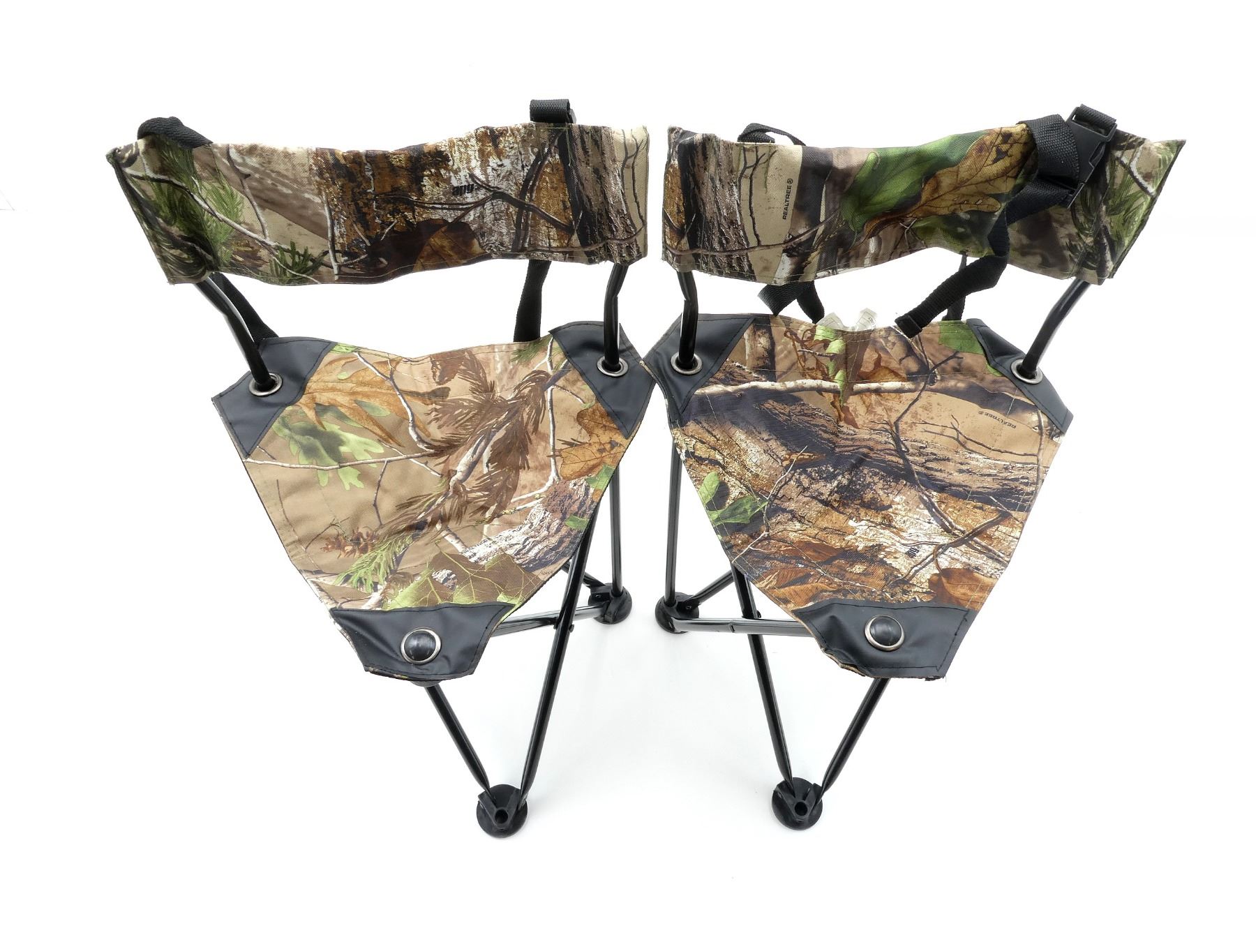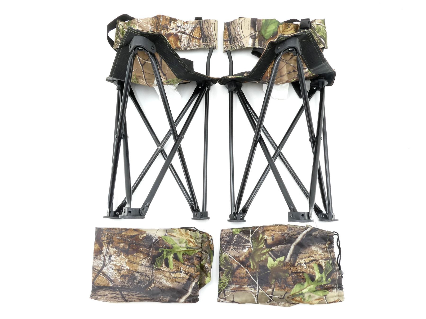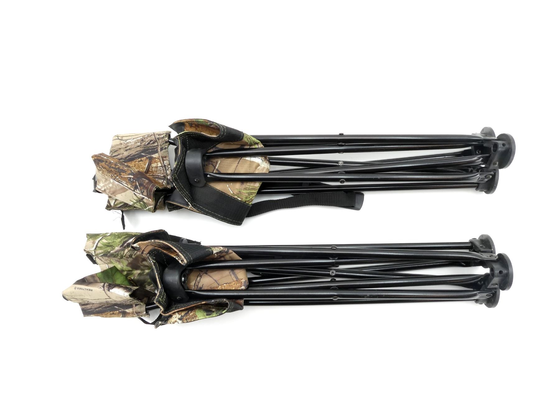 LOT INCLUDES; (2) UNKNOWN FOLDING TRIPOD SEATS, WITH CARRYING BAG, REALTREE CAMOUFLAGE, APPROX. 14" X 13.5" X 18". SEE PHOTOS.