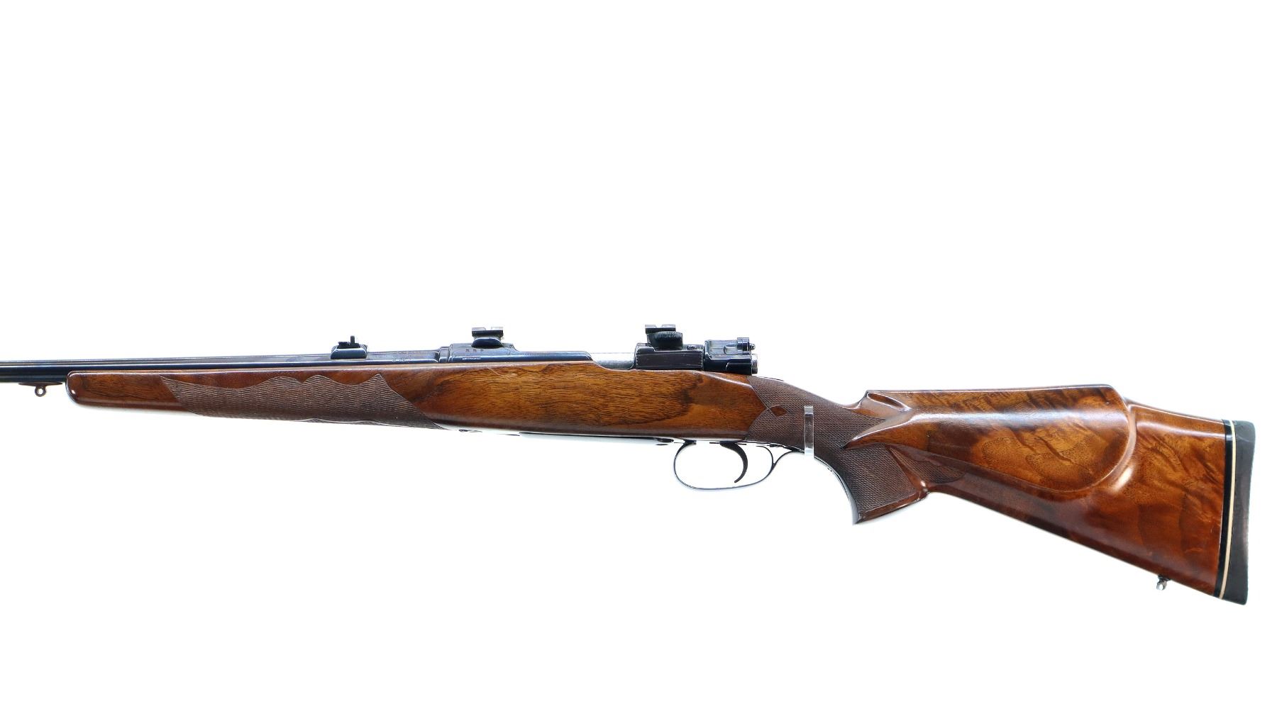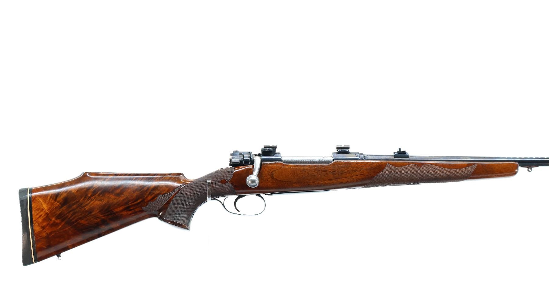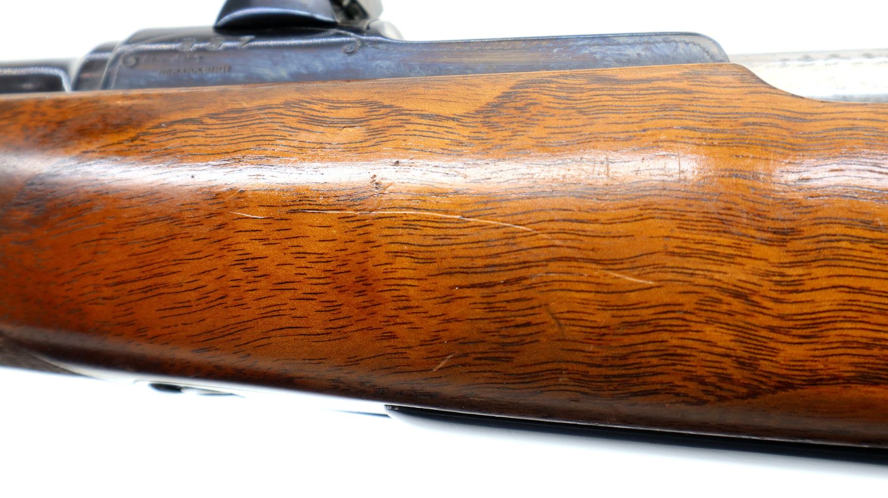 Main Description: Blade front sight with ramp, adjustable u notched rear sight with one fixed and one folding blade, metal has been polished and reblued, receiver has QD claw mount bases with custom removable Weaver style bases installed, jewelled bolt with low scope handle, safety and checkered flat bottomed knob. One piece wood stock, checkered forearm and pistol grip, cheek rest, black rubber recoil pad, 13" LOP, swivel studs.