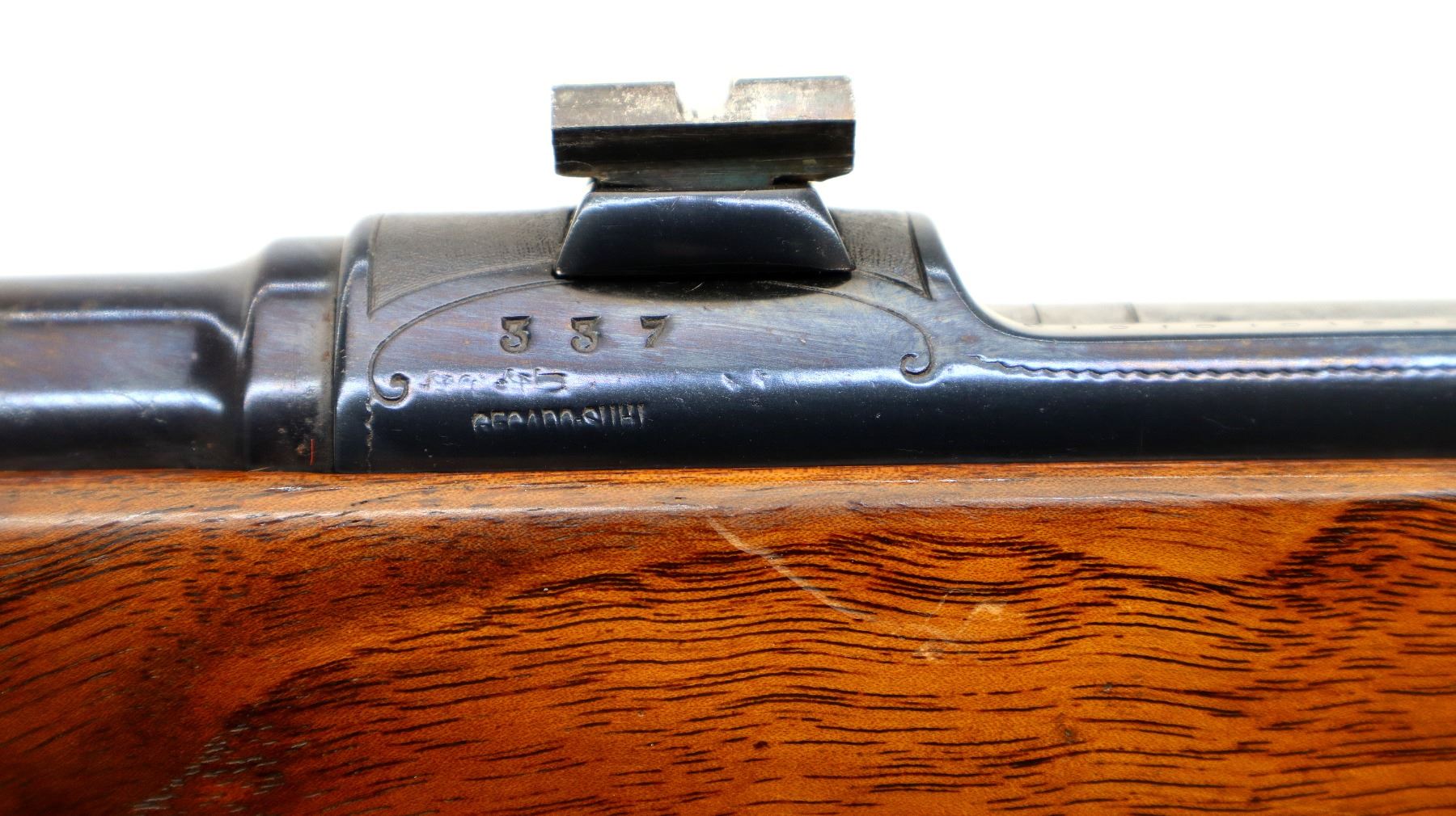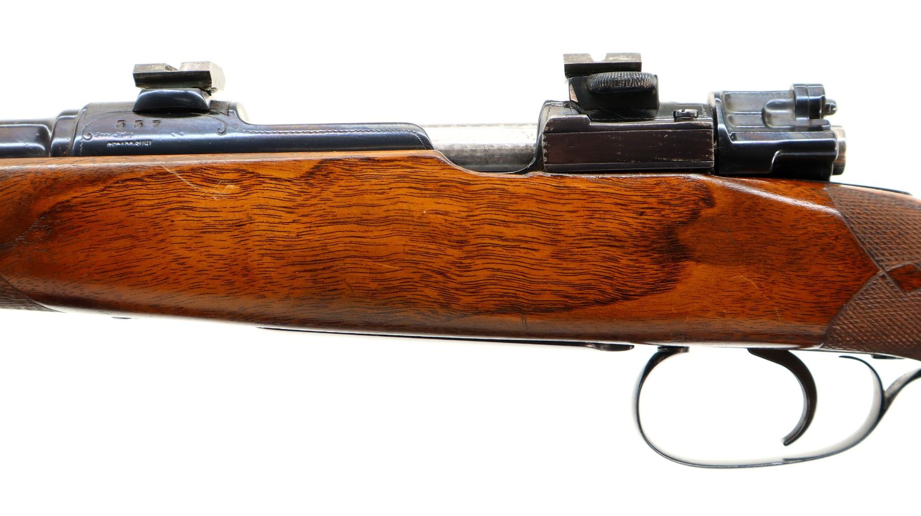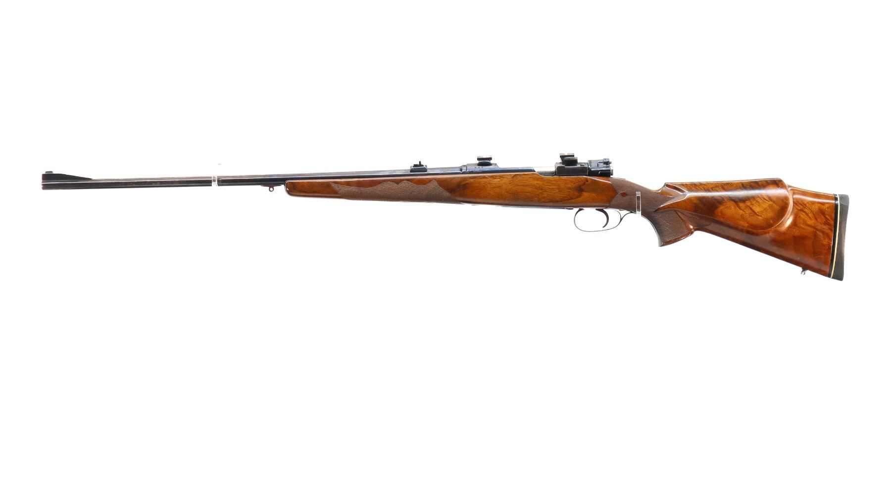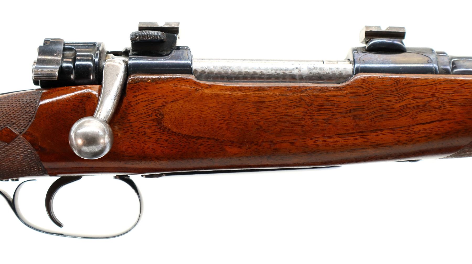 Main Description: Blade front sight with ramp, adjustable u notched rear sight with one fixed and one folding blade, metal has been polished and reblued, receiver has QD claw mount bases with custom removable Weaver style bases installed, jewelled bolt with low scope handle, safety and checkered flat bottomed knob. One piece wood stock, checkered forearm and pistol grip, cheek rest, black rubber recoil pad, 13" LOP, swivel studs.