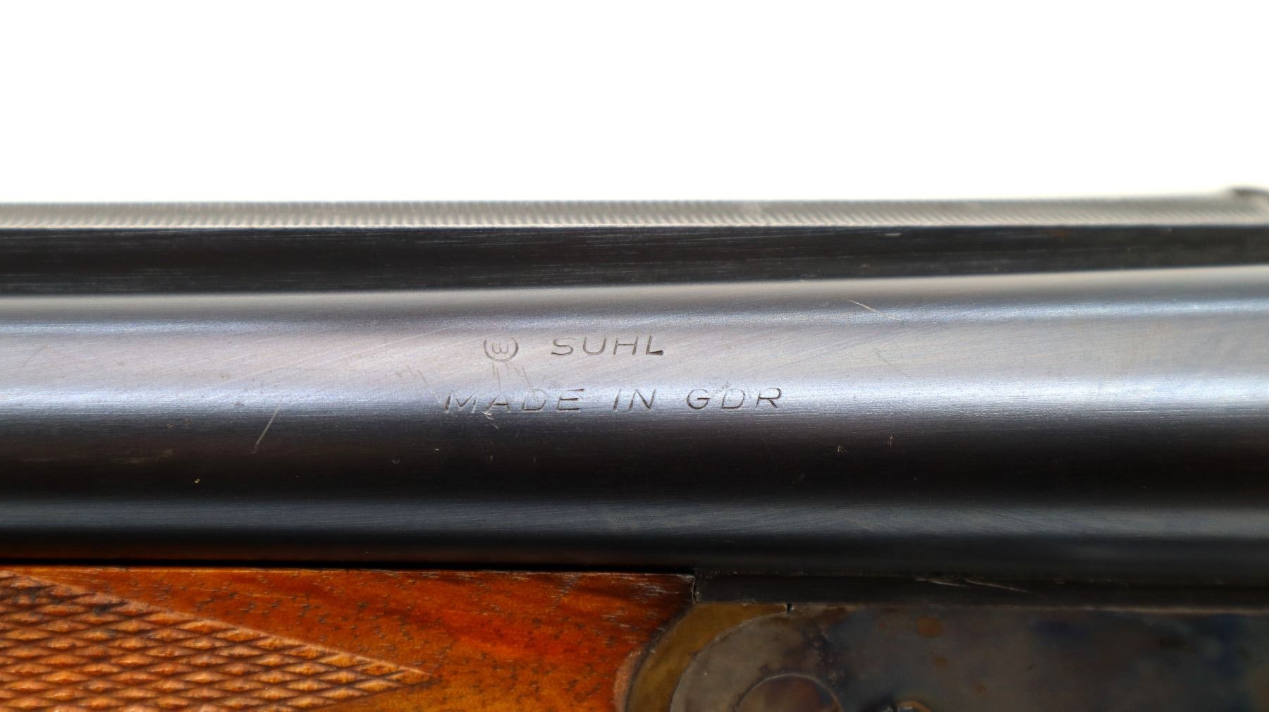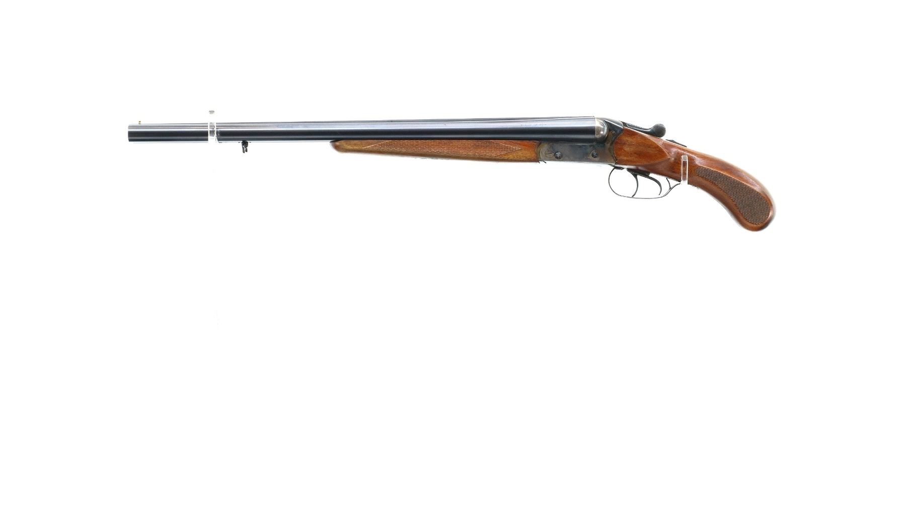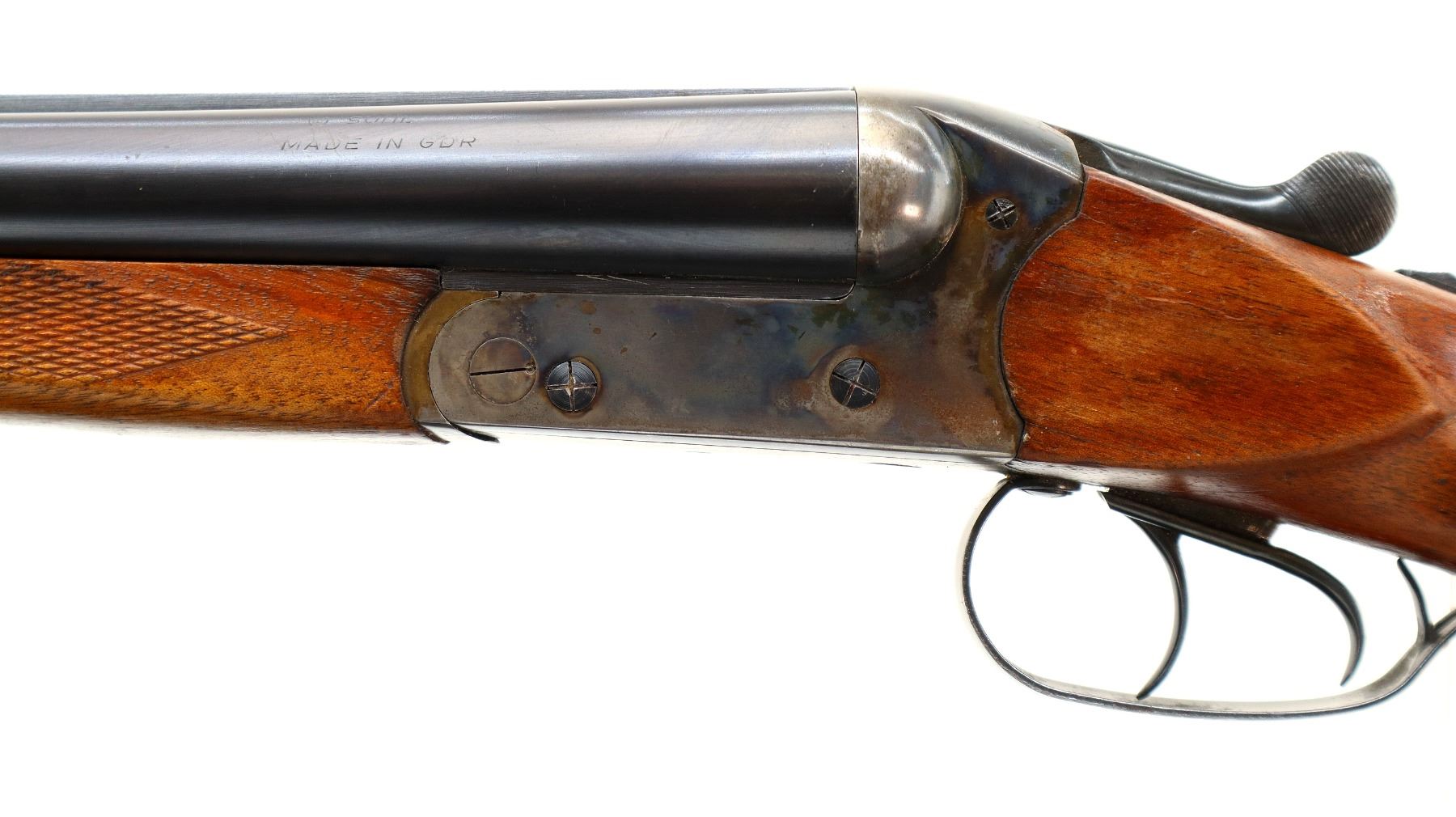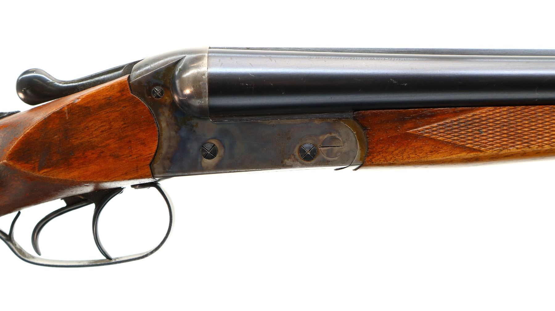 Main Description: Brass bead, blued barrels with raised rib, colour case hardened receiver, automatic safety, double triggers. Two piece wood stocks, checkered forearm and pistol grip cracked and repaired beside trigger guard, front sling swivel only.
