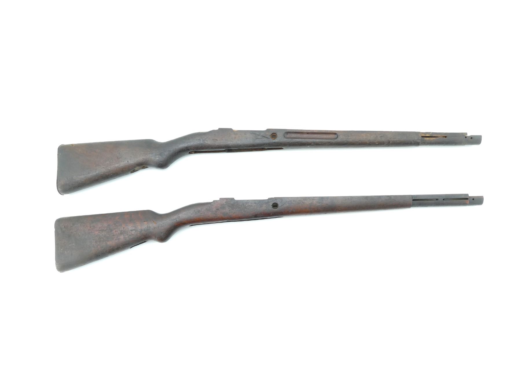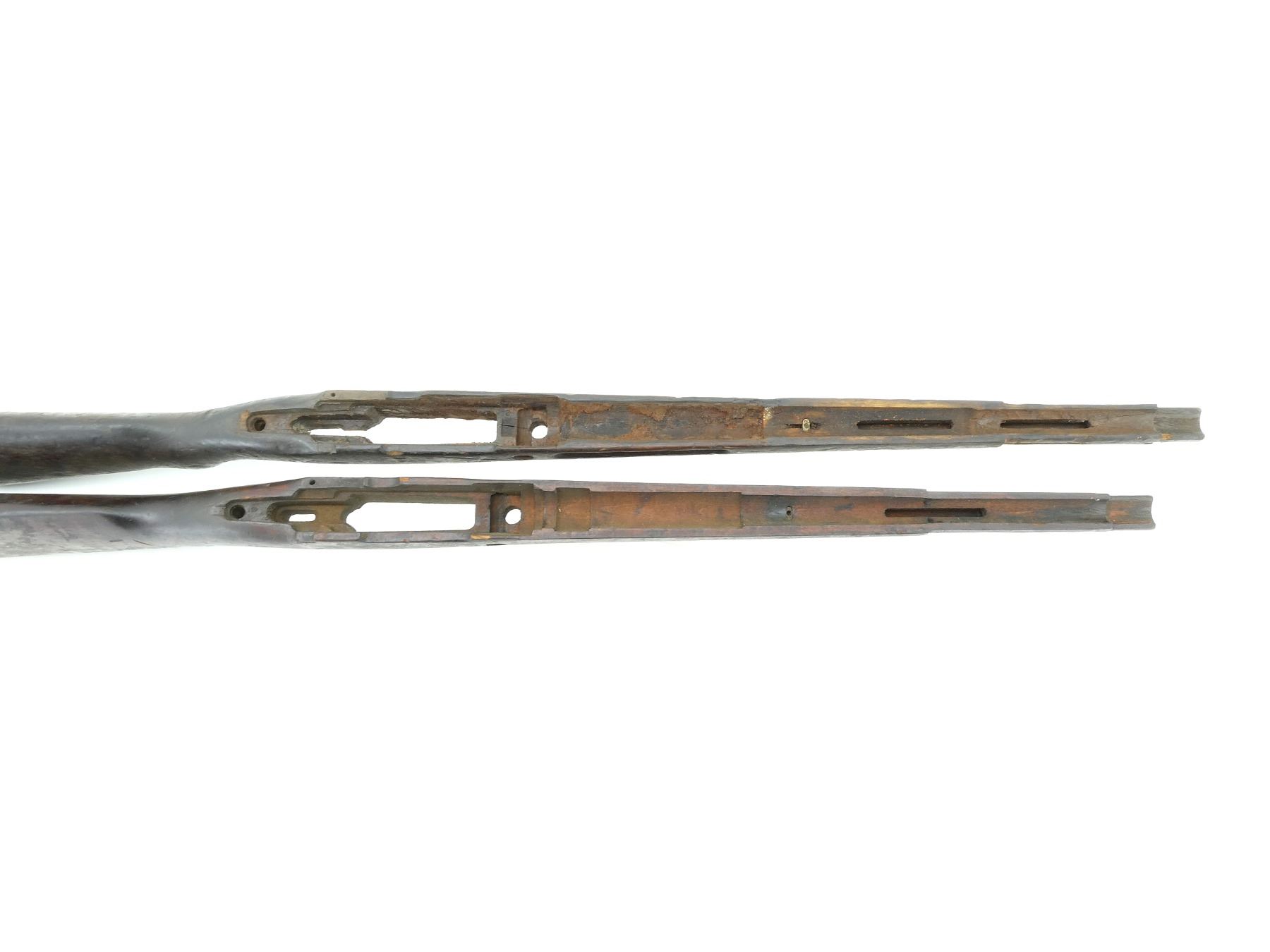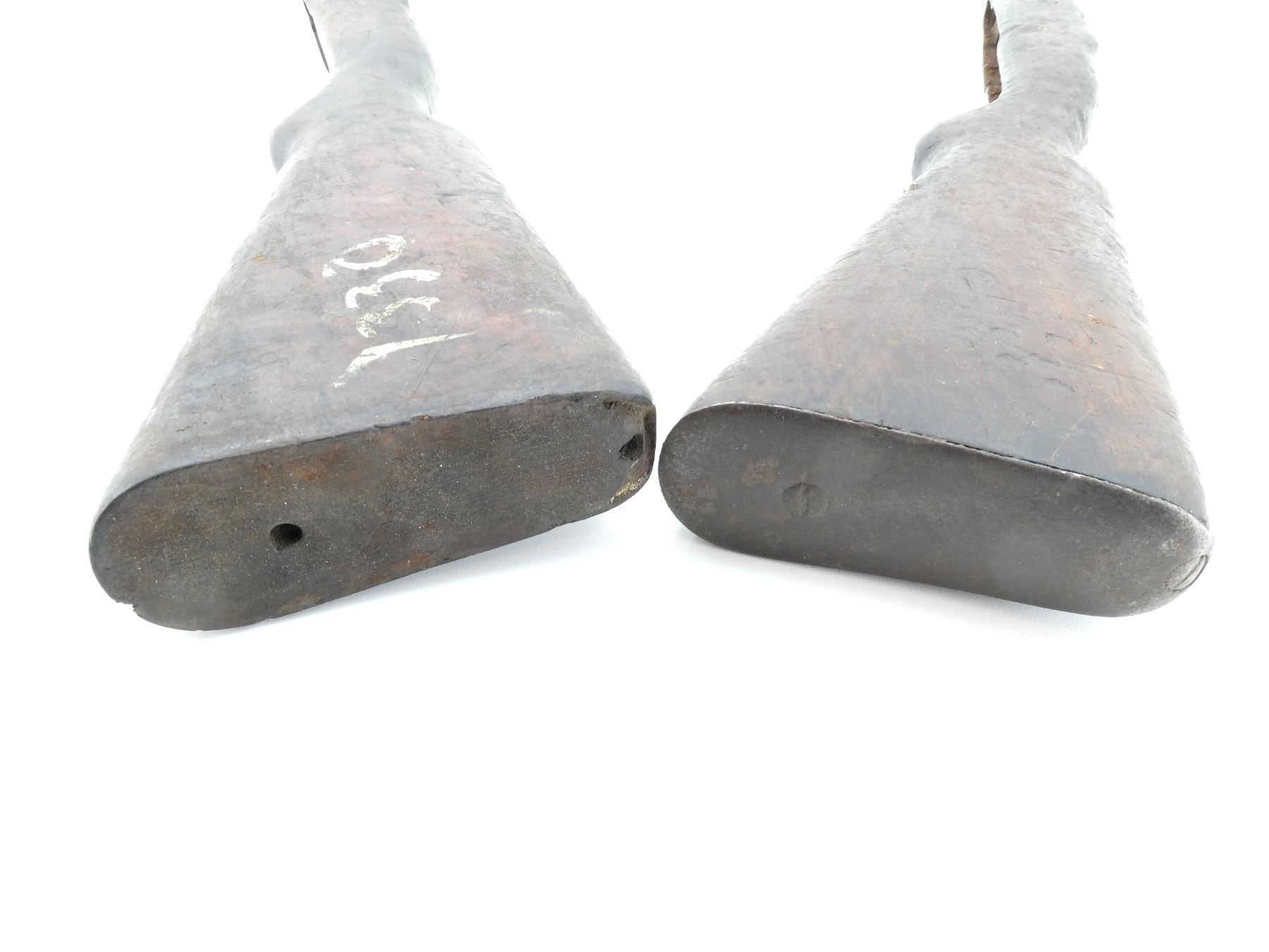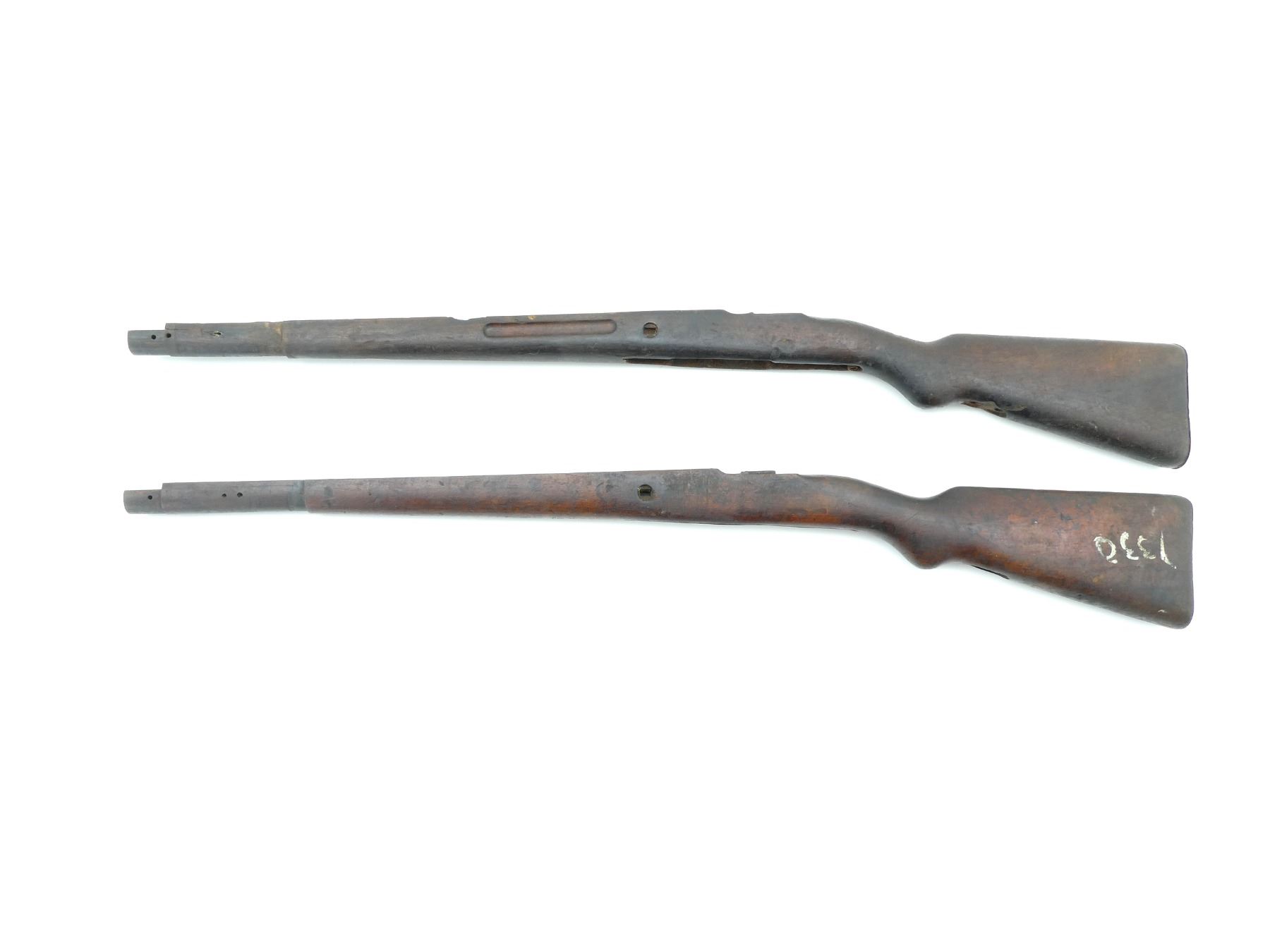 LOT INCLUDES; (2) WOODEN STOCKS, SMOOTH, INDISTINCT MARKINGS, 1 MISSING BUTT PLATE, MAY HAVE SMALL CRACKS & CHIPS, OVERALL LENGTH APPROX. 37" & 38". MAY REQUIRE FITTING. SEE PHOTOS.