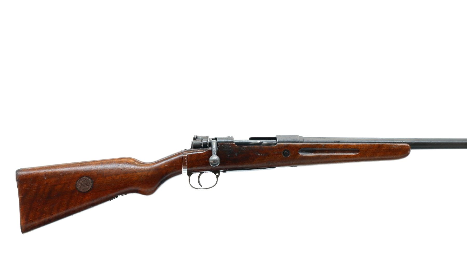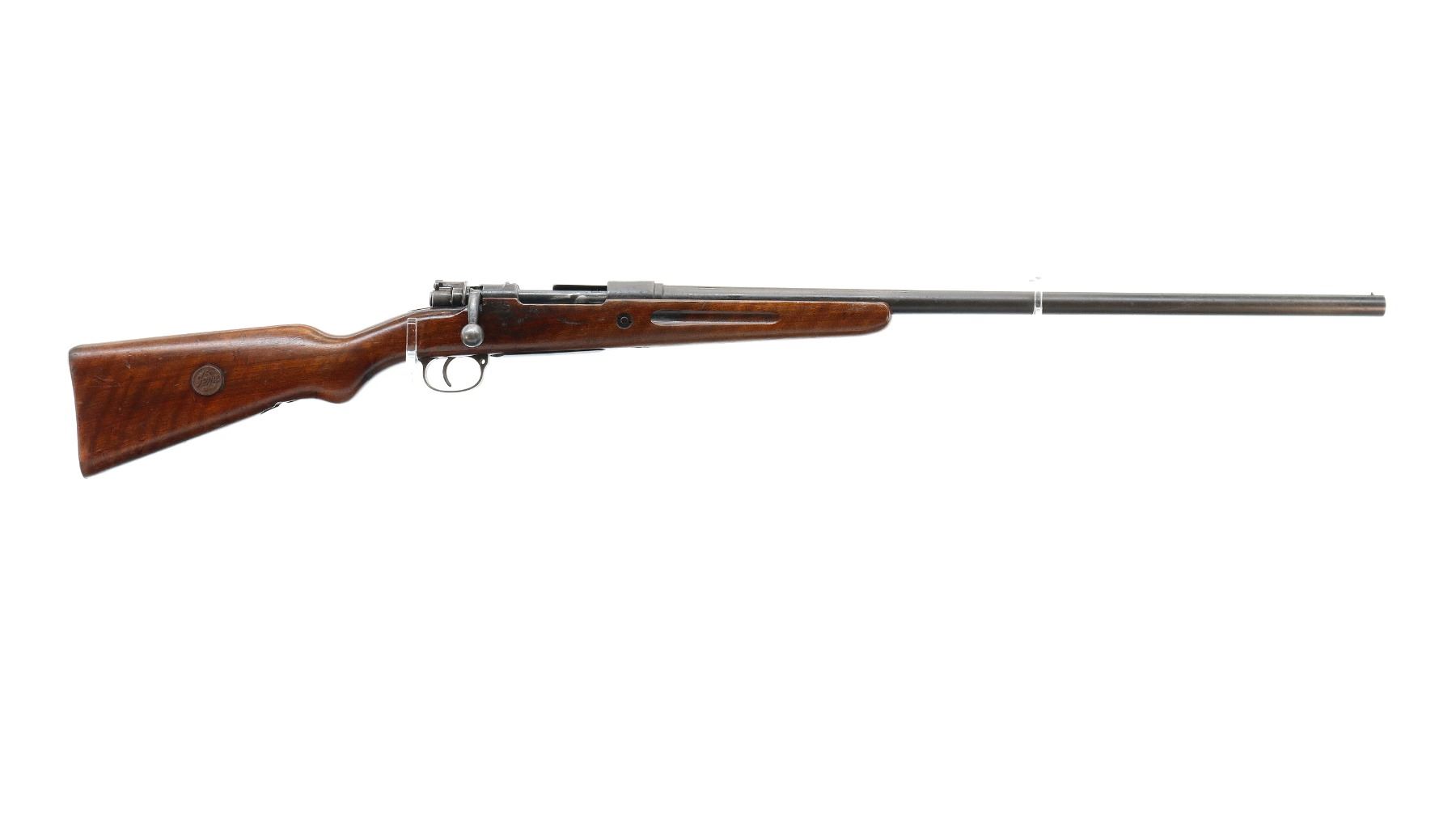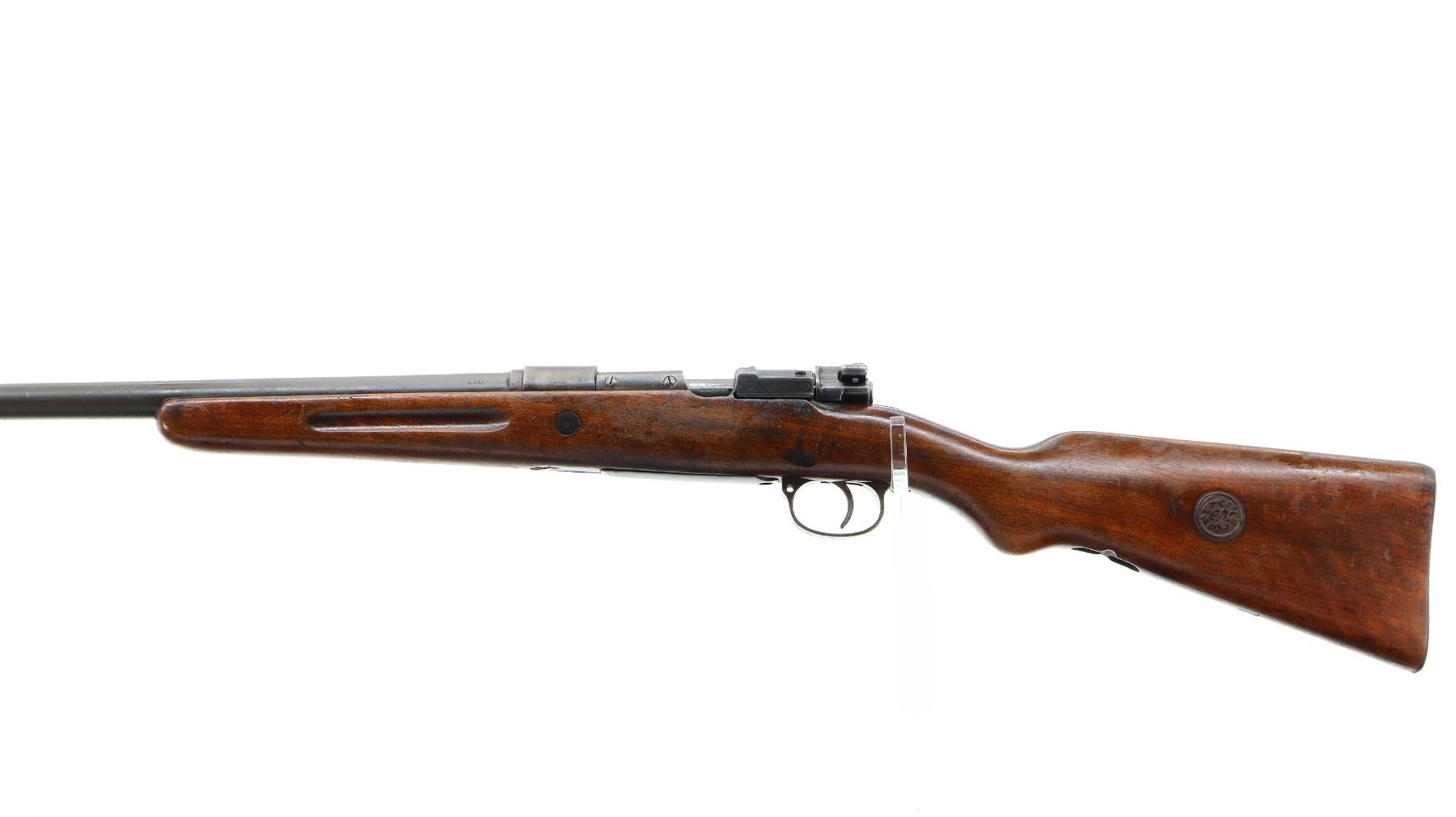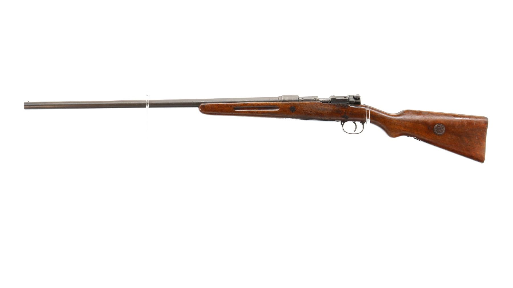Main Description: Silver bead, blued finish, round barrel, turned down bolt handle, extractor is present. One piece sporterized wood stock, finger grooved forearm, pistol grip, smooth steel butt plate, medallions on both sides of stock, missing rear swivel holes are present. No front swivel.
