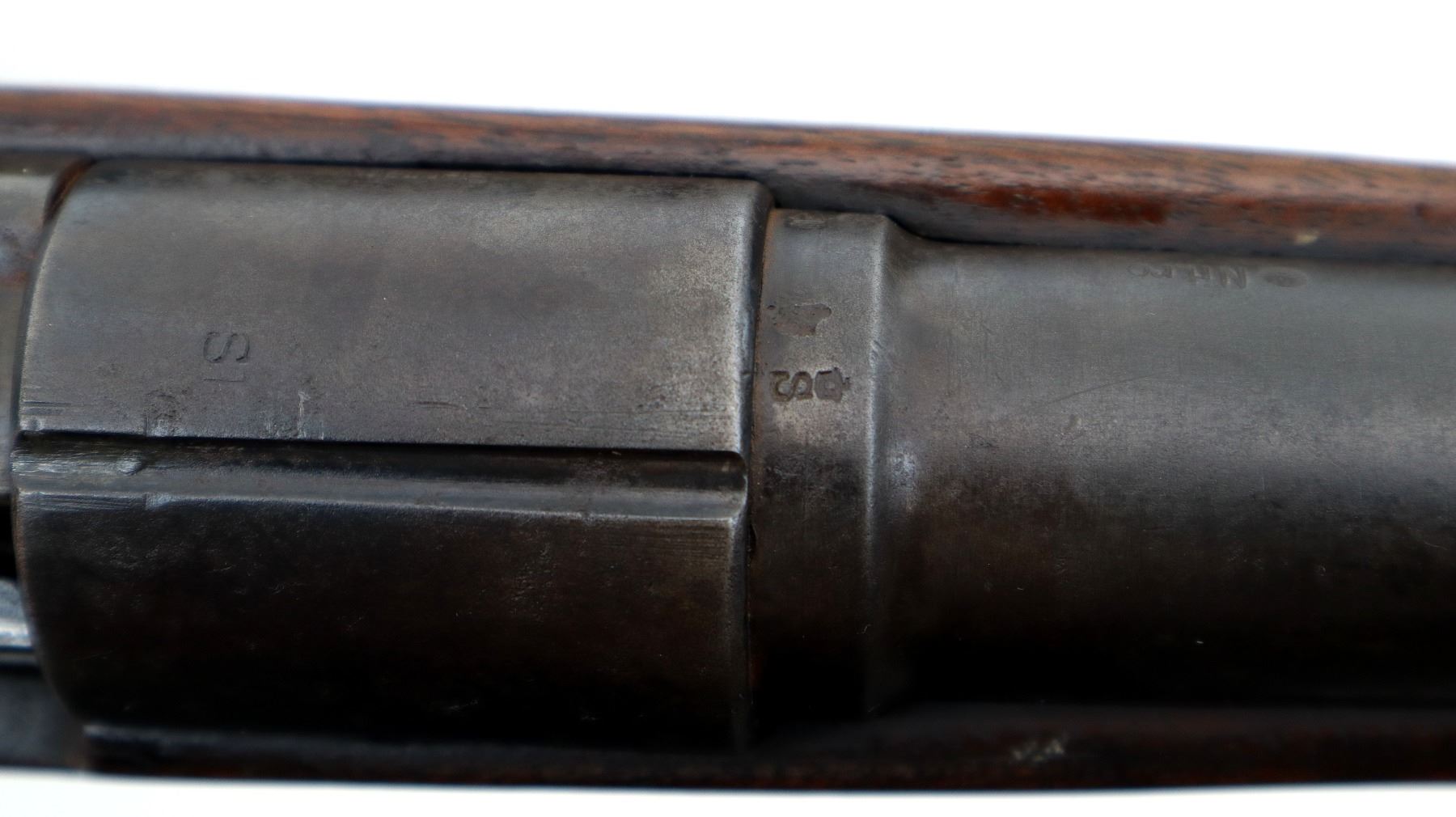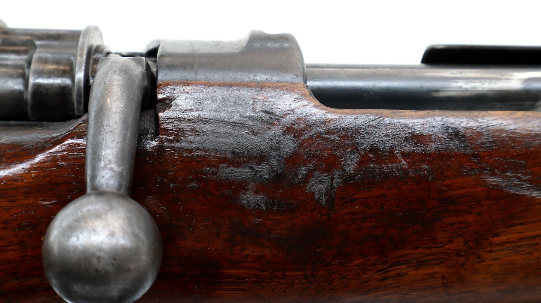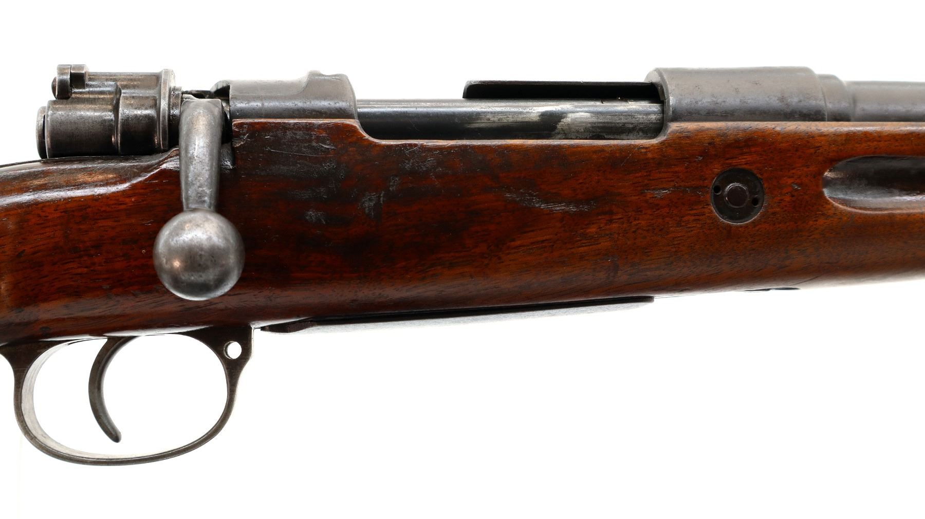 Main Description: Silver bead, blued finish, round barrel, turned down bolt handle, extractor is present. One piece sporterized wood stock, finger grooved forearm, pistol grip, smooth steel butt plate, medallions on both sides of stock, missing rear swivel holes are present. No front swivel.