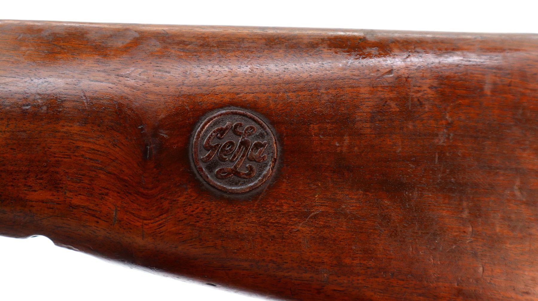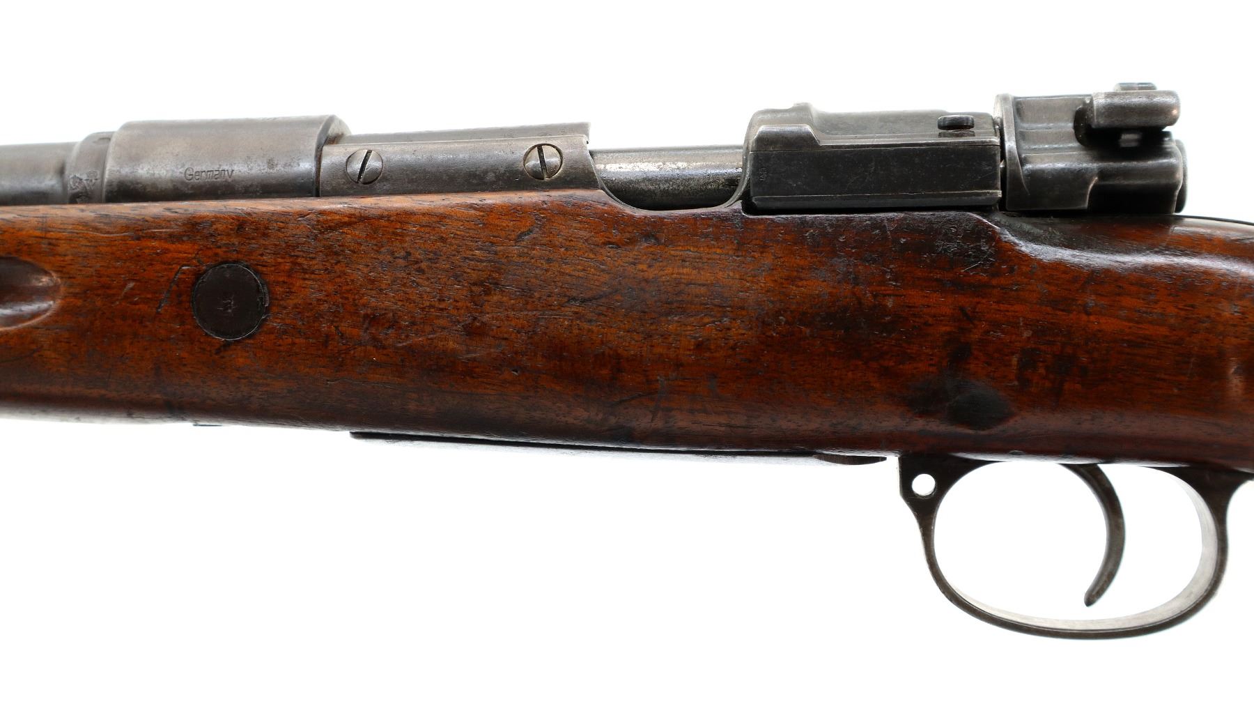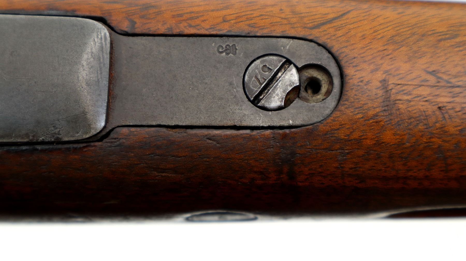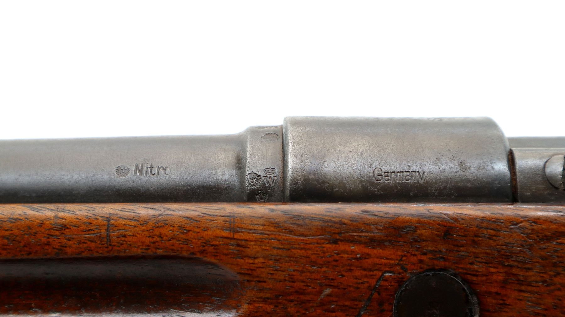Main Description: Silver bead, blued finish, round barrel, turned down bolt handle, extractor is present. One piece sporterized wood stock, finger grooved forearm, pistol grip, smooth steel butt plate, medallions on both sides of stock, missing rear swivel holes are present. No front swivel.