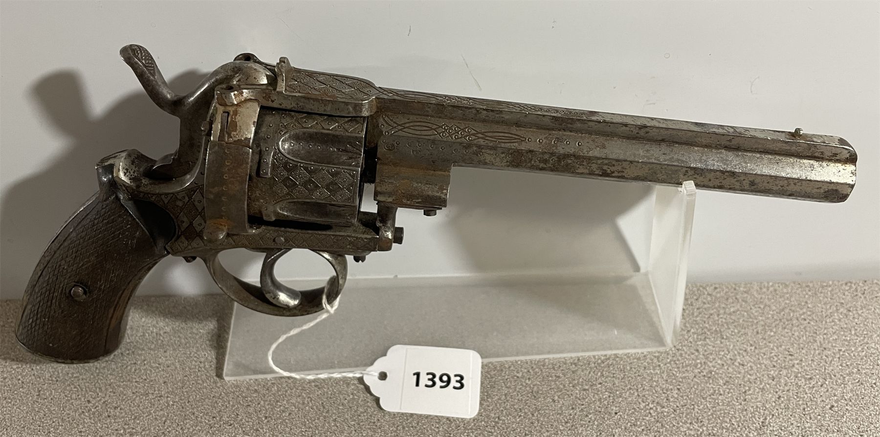 CONDITION: F OVERALL. INDEXES MOSTLY. MISSING EJECTOR ROD. SPECS: 144 MM OCTAGON BARREL. FACTORY ENGRAVED. EXTRAS: NONE. S/N: NONE.