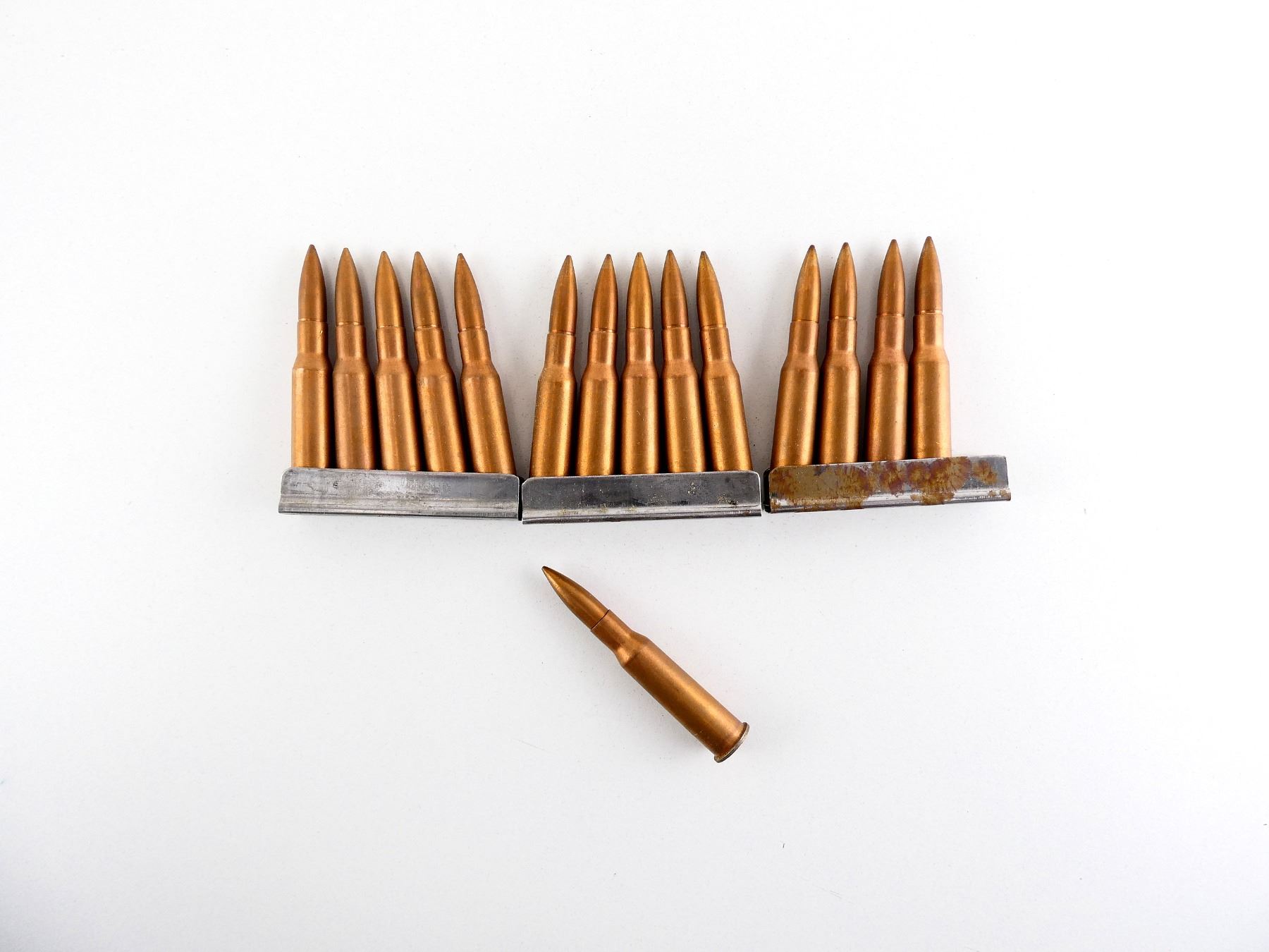 LOT INCLUDES; APPROX. (15) RNDS, FMJ, COPPER WASHED, (3) MOSIN NAGANT STRIPPER CLIPS.