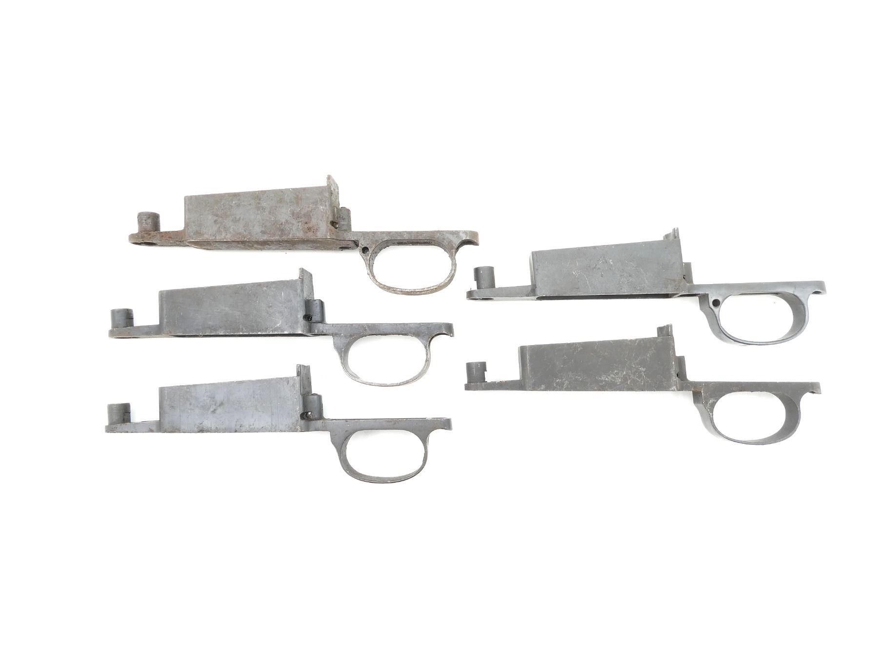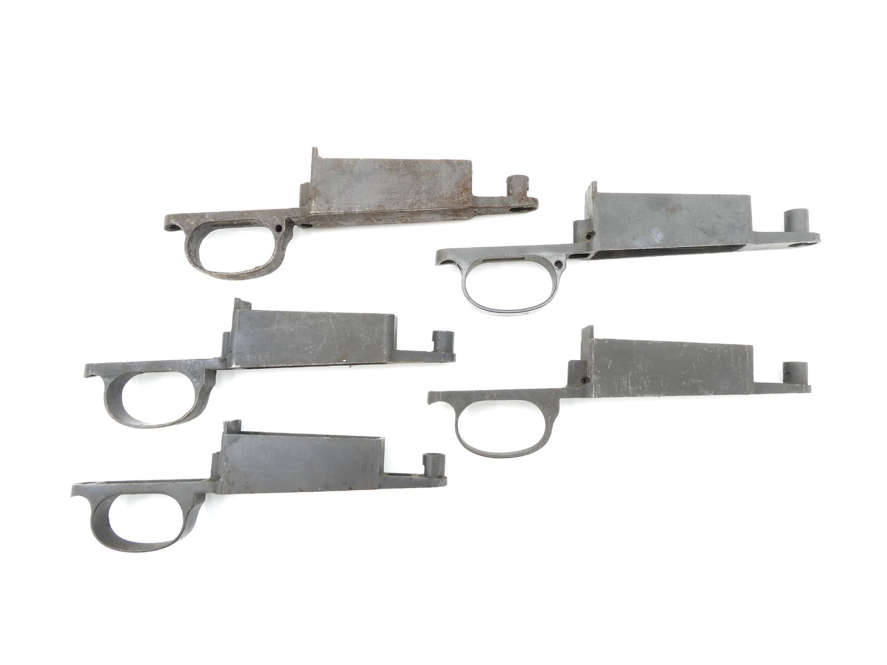 LOT INCLUDES; (5) TRIGGER GUARDS, BLUED STEEL CONSTRUCTION, VARIOUS MARKINGS, OVERALL LENGTH APPROX. 8.5". MAY REQUIRE FITTING. SEE PHOTOS.