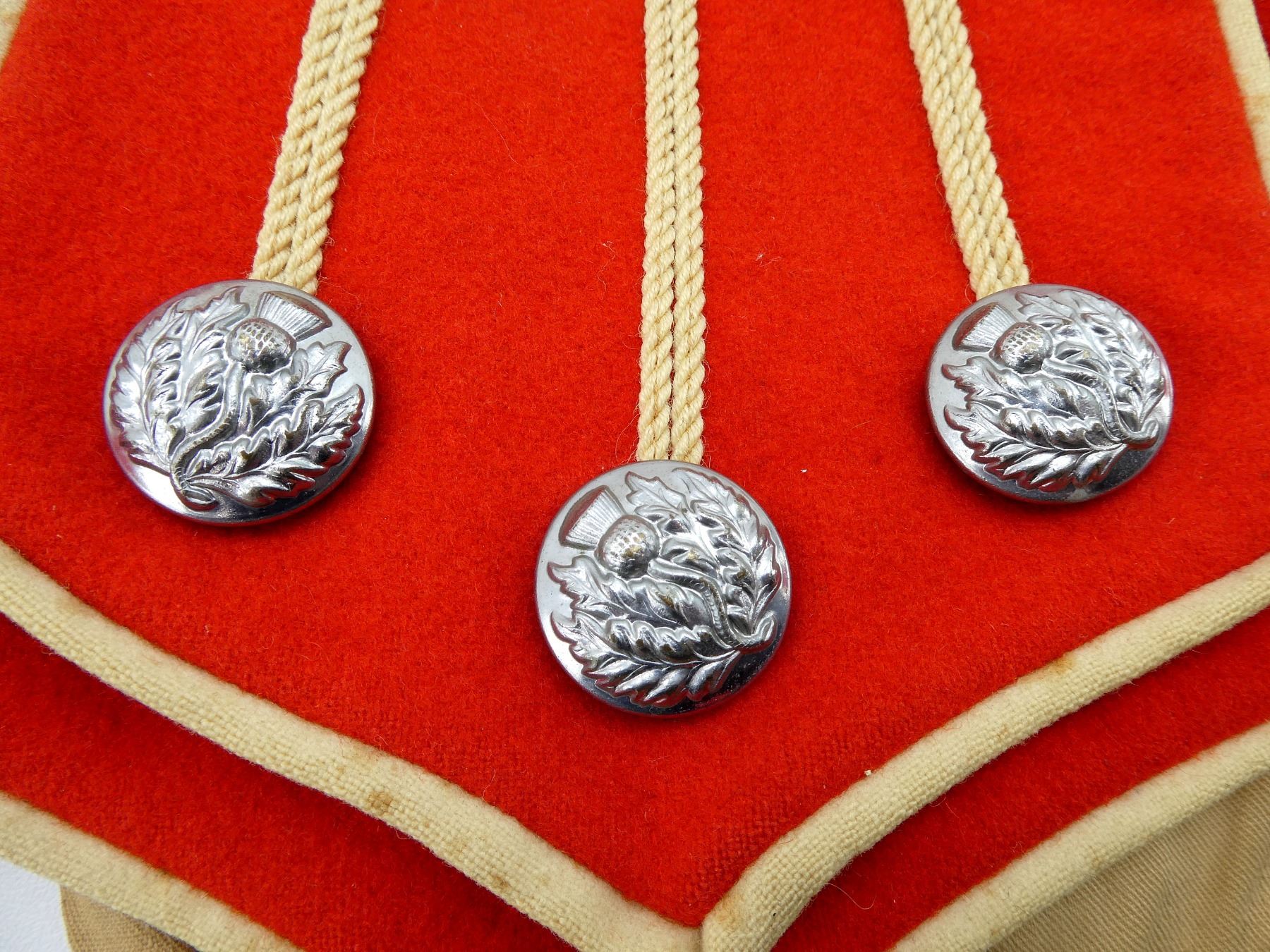 (1) SCARLET RED WOOL TUNIC, SILVER COLOURED BUTTONS WITH MILK THISTLE DESIGNS, BRASS DRUM BADGE ON SHOULDER, NO VISIBLE MARKINGS, BURLAP ON COLLAR IN-BETWEEN LAYERS, CLOSED COLLAR, BUTTON FRONT, SHOWS AGE / WEAR / TEAR, SHOULDER WIDTH APPROX. 17". SEE PHOTOS.
