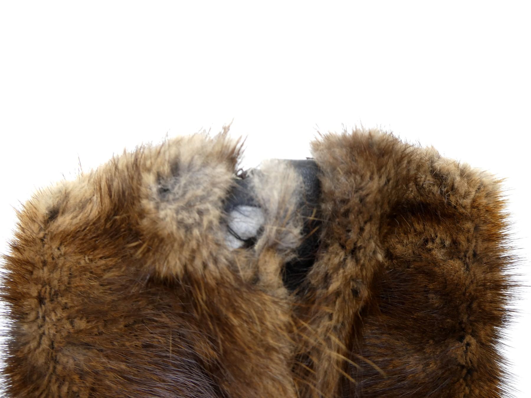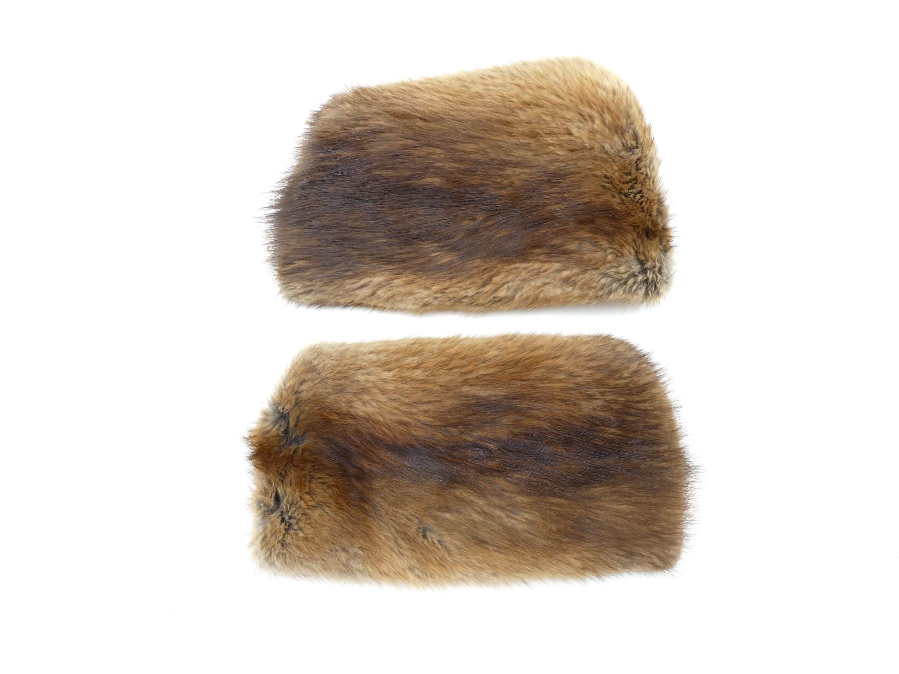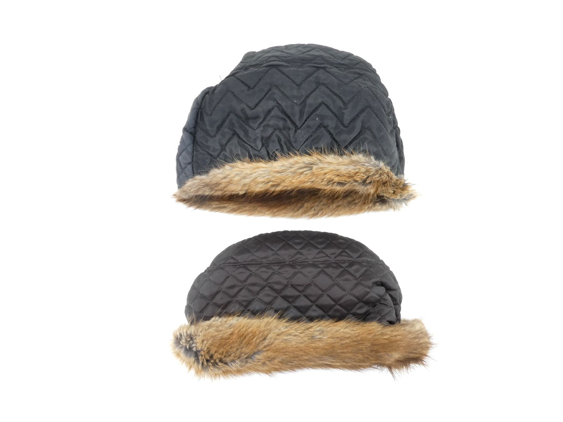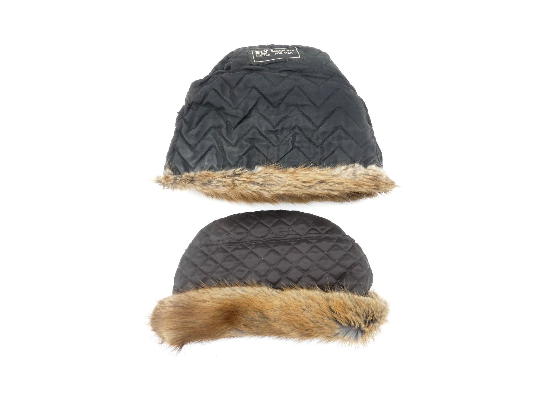 LOT INCLUDES; (2) MUSKRAT STYLE FUR WINTER HATS, ONE MARKED: "ELY LIMITED, SPECIALTIES FOR MEN", OTHER HAS NO VISIBLE MARKINGS, SIZES UNKNOWN, BOTH SHOW AGE / WEAR, ONE HAS TEARS. SEE PHOTOS.