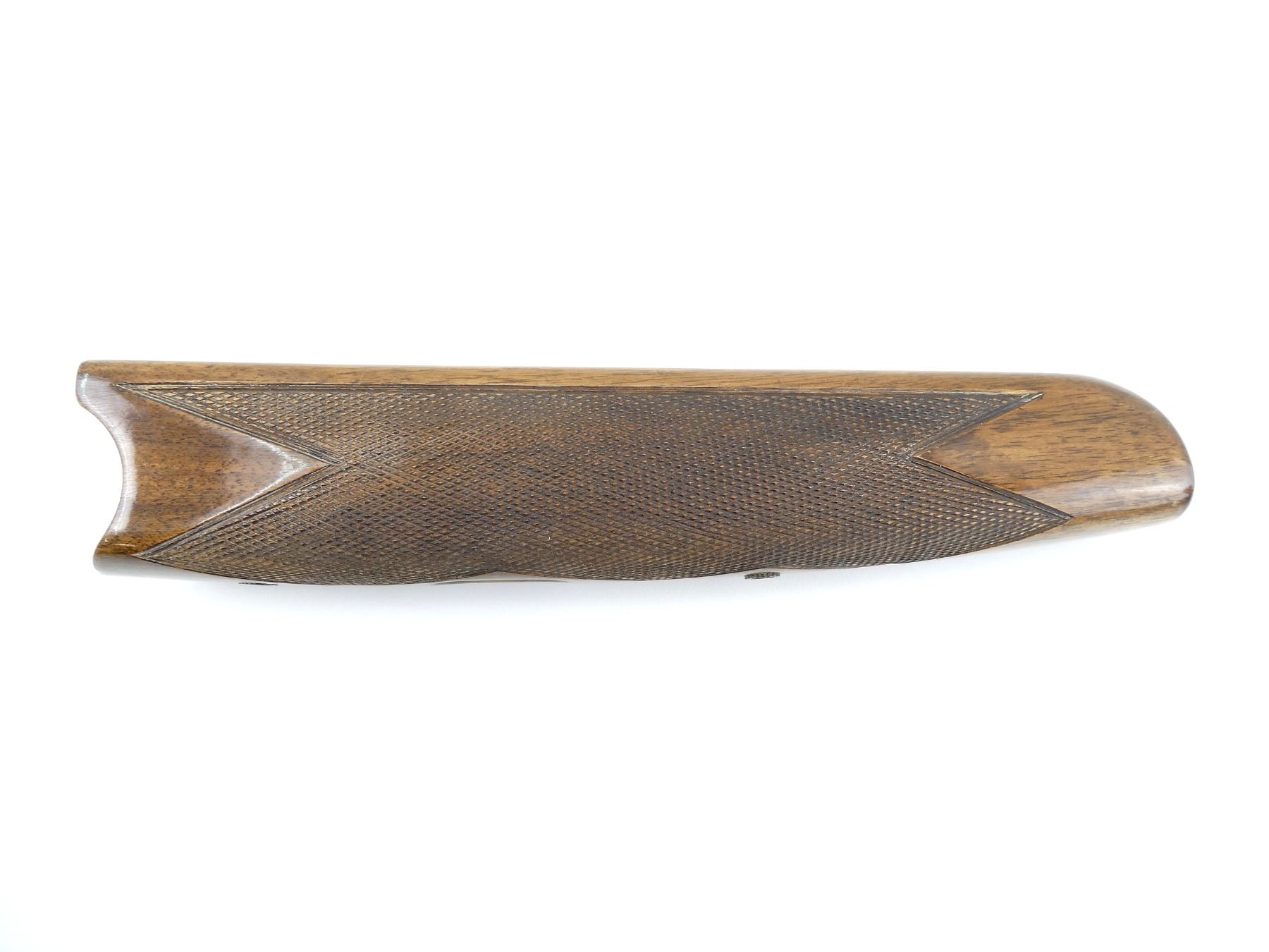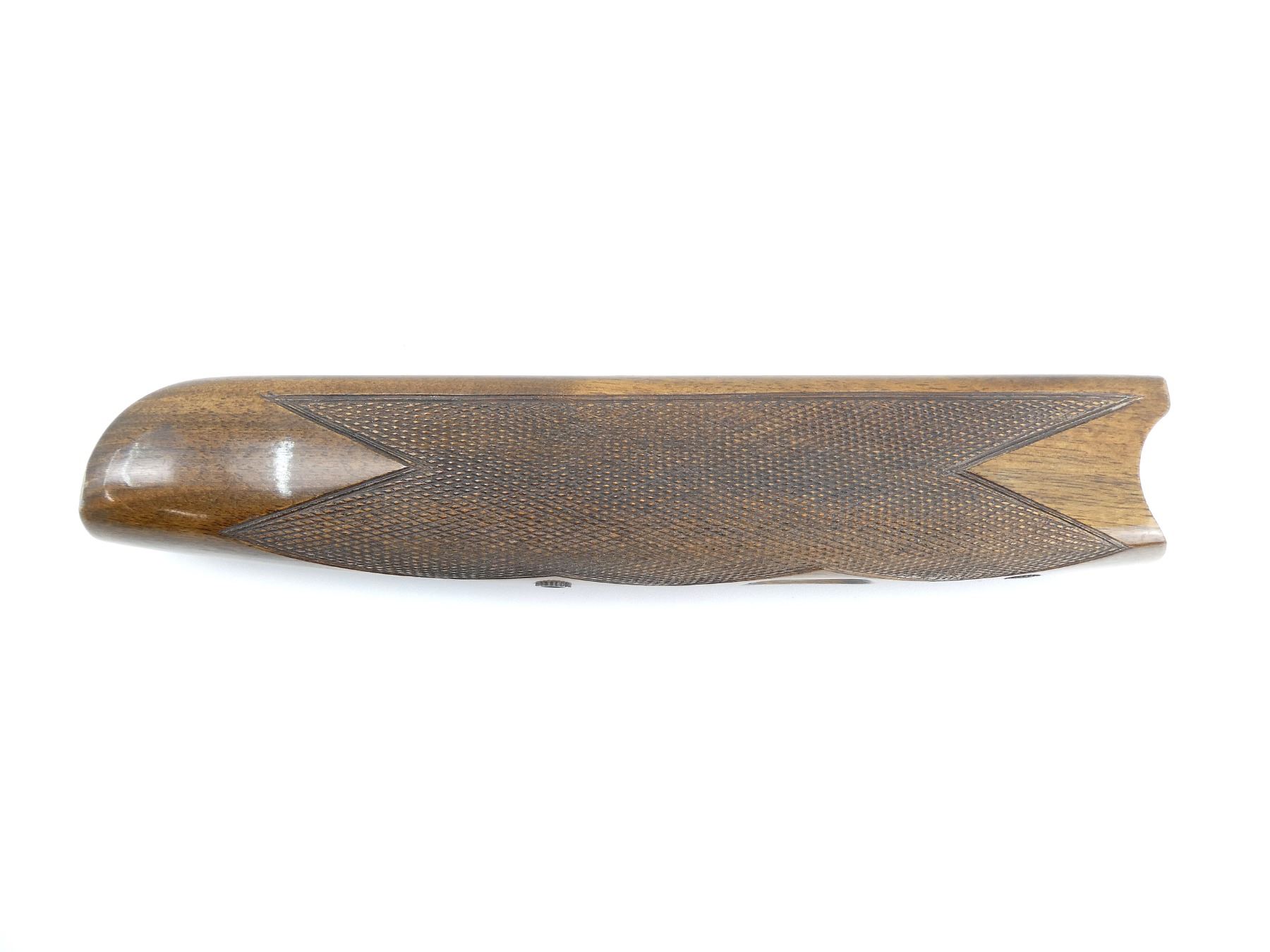 (1) WOODEN FOREND, CHECKERED, UNMARKED, CONSIGNOR STATES "O&U", CHANNEL WIDTH APPROX. 18MM, OVERALL LENGTH APPROX. 9 3/8". MAY REQUIRE FITTING. SEE PHOTOS.