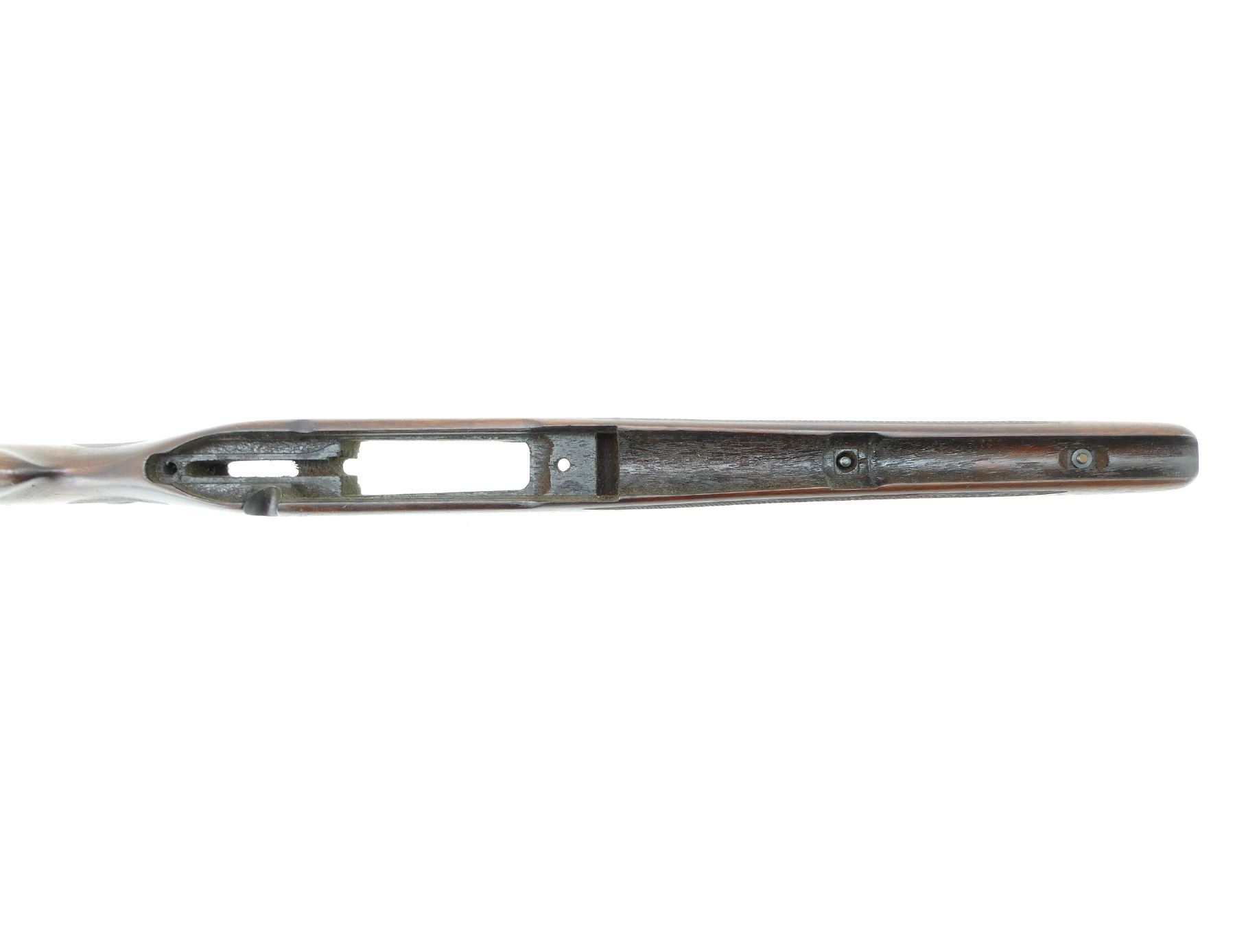 (1) WOODEN STOCK, CHECKERED, UNMARKED, OVERALL LENGTH APPROX. 32". MAY REQUIRE FITTING. SEE PHOTOS.