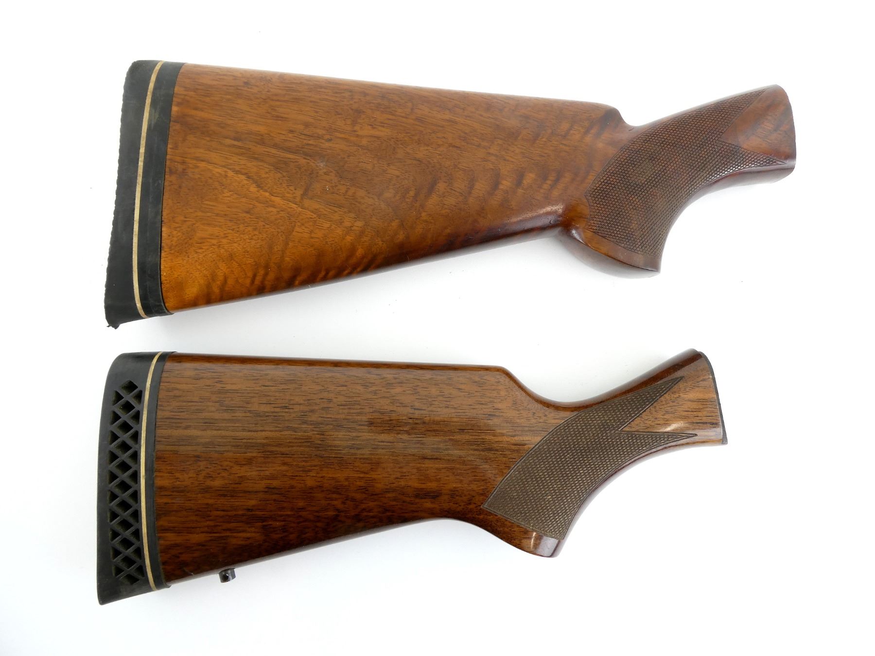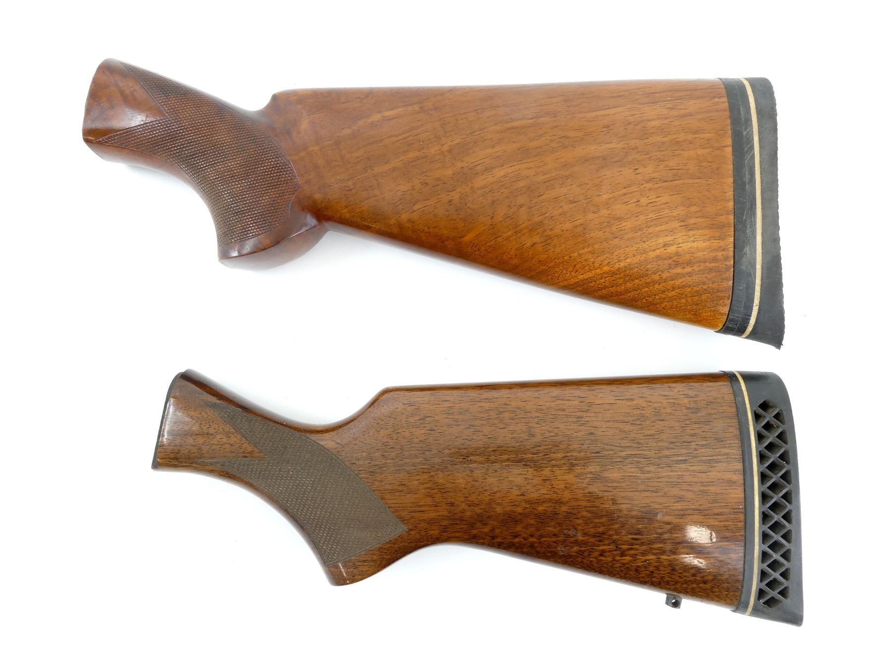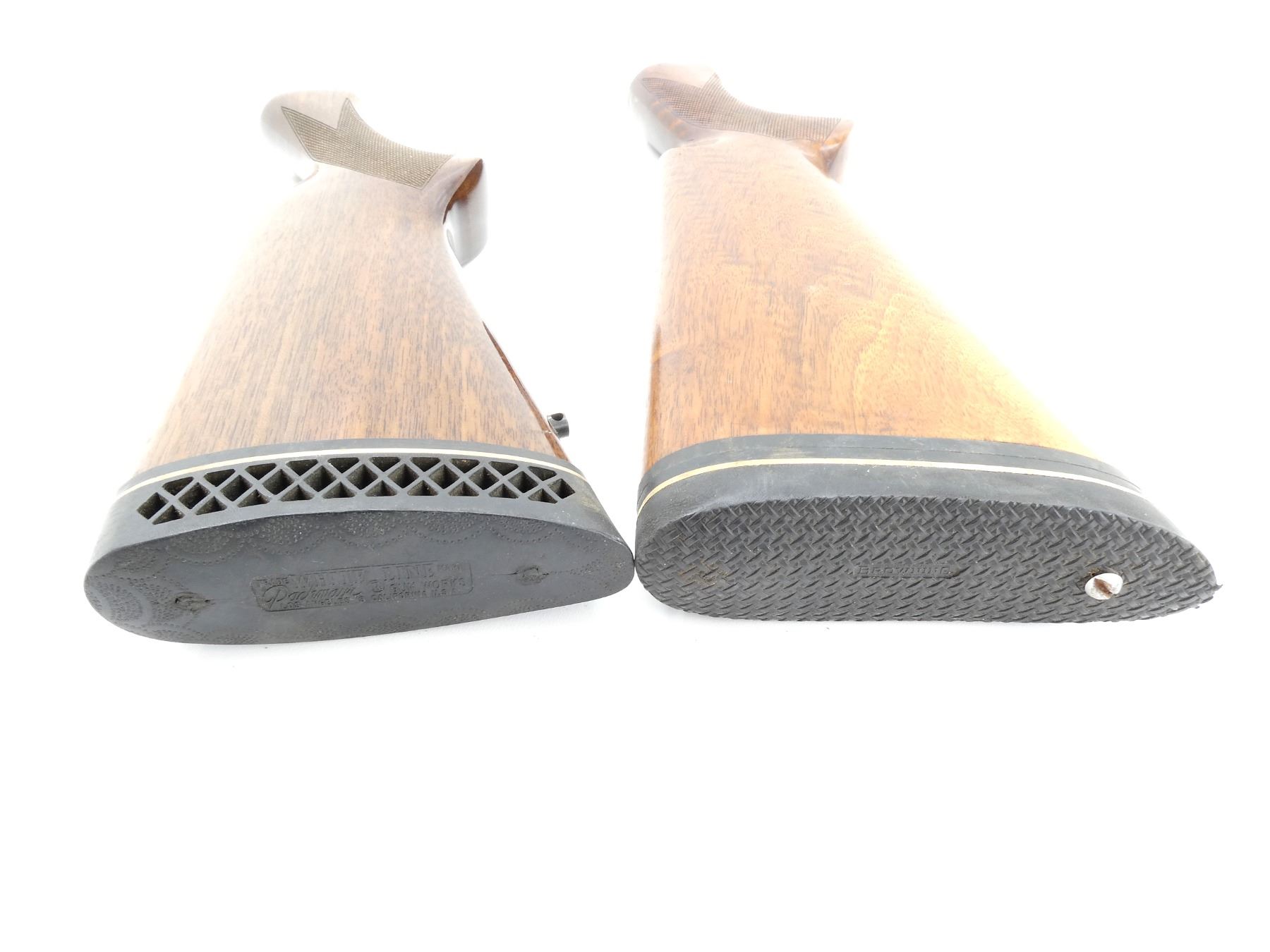LOT INCLUDES; (1) WOODEN BUTT STOCK, CHECKERED, UNMARKED, WITH PACHMAYR RECOIL PAD, OVERALL LENGTH APPROX. 12" & (1) WOODEN BUTT STOCK, CHECKERED, UNMARKED, WITH BROWNING RECOIL PAD, OVERALL LENGTH APPROX. 13 3/8". MAY REQUIRE FITTING. SEE PHOTOS.