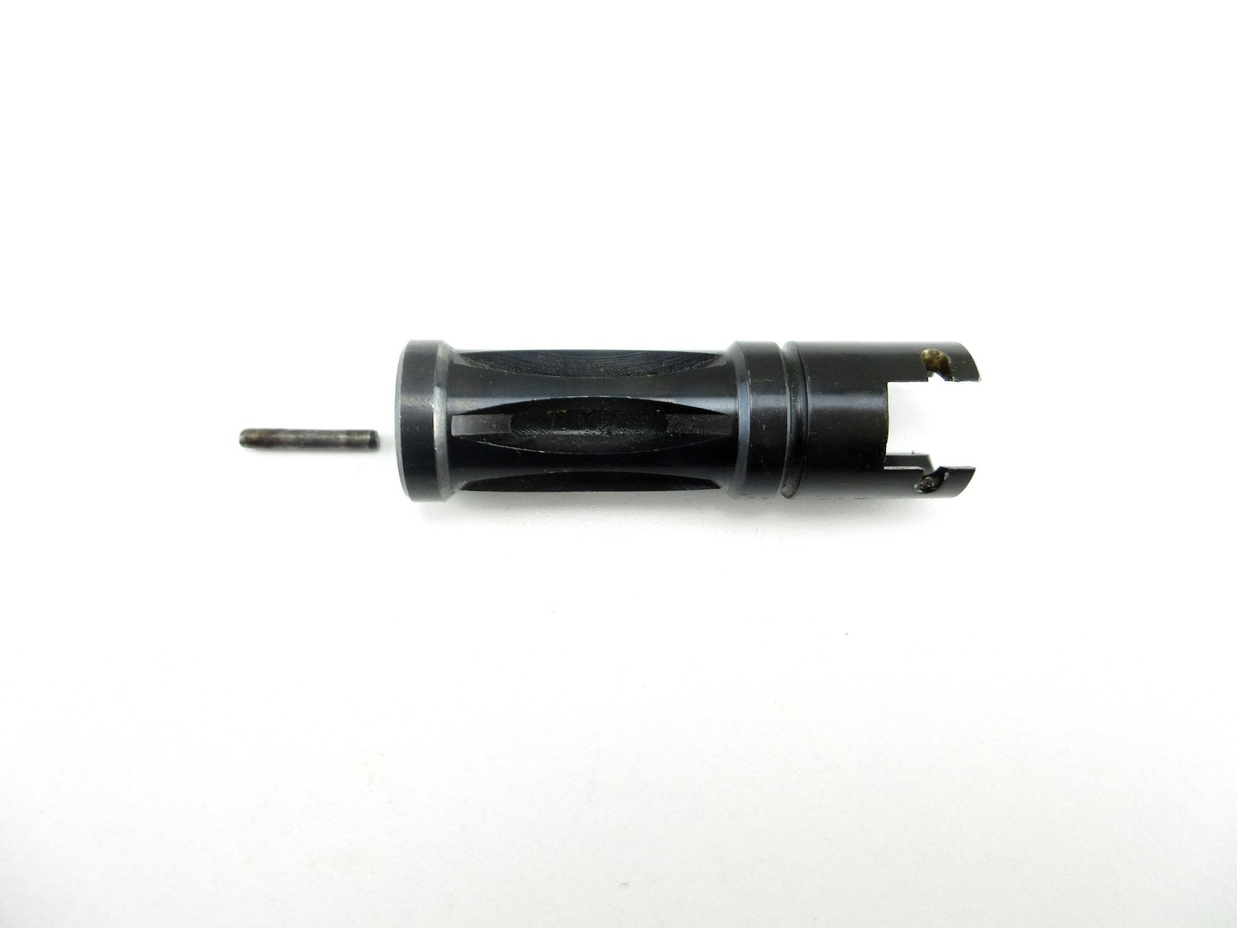 (1) FLASH HIDER, BLUED STEEL CONSTRUCTION, UNMARKED, OVERALL LENGTH APPROX. 3". MAY REQUIRE FITTING. SEE PHOTOS.