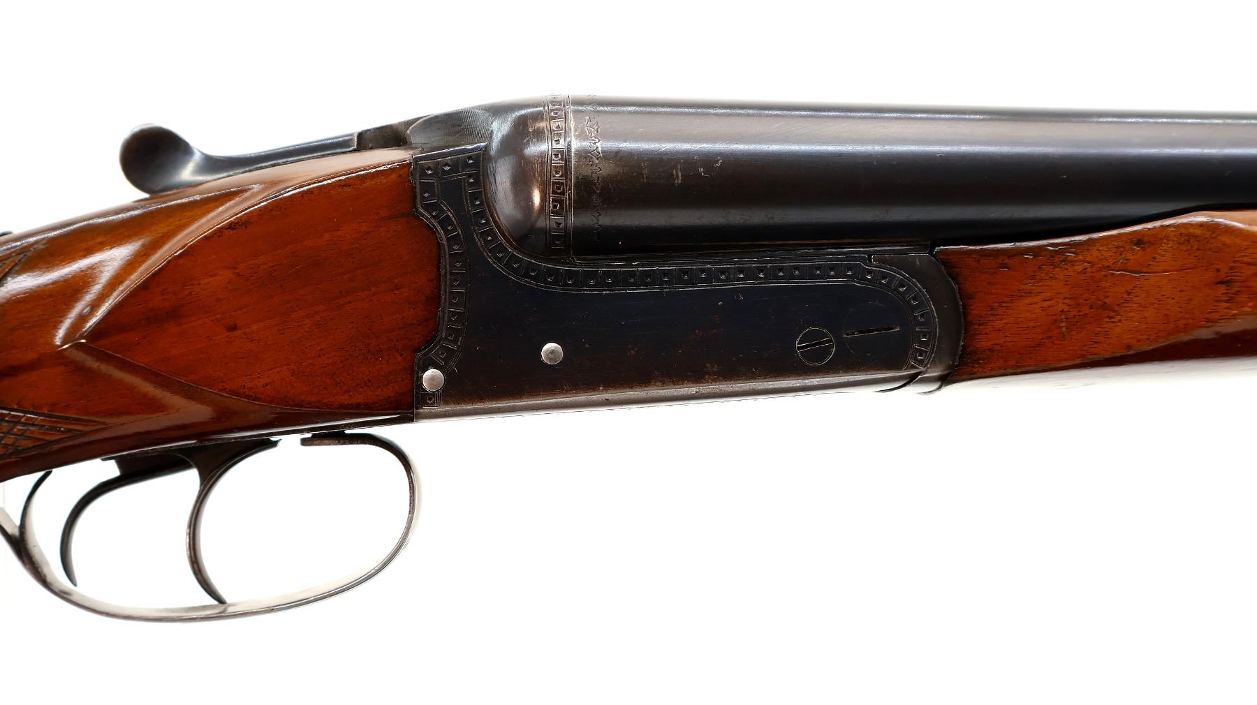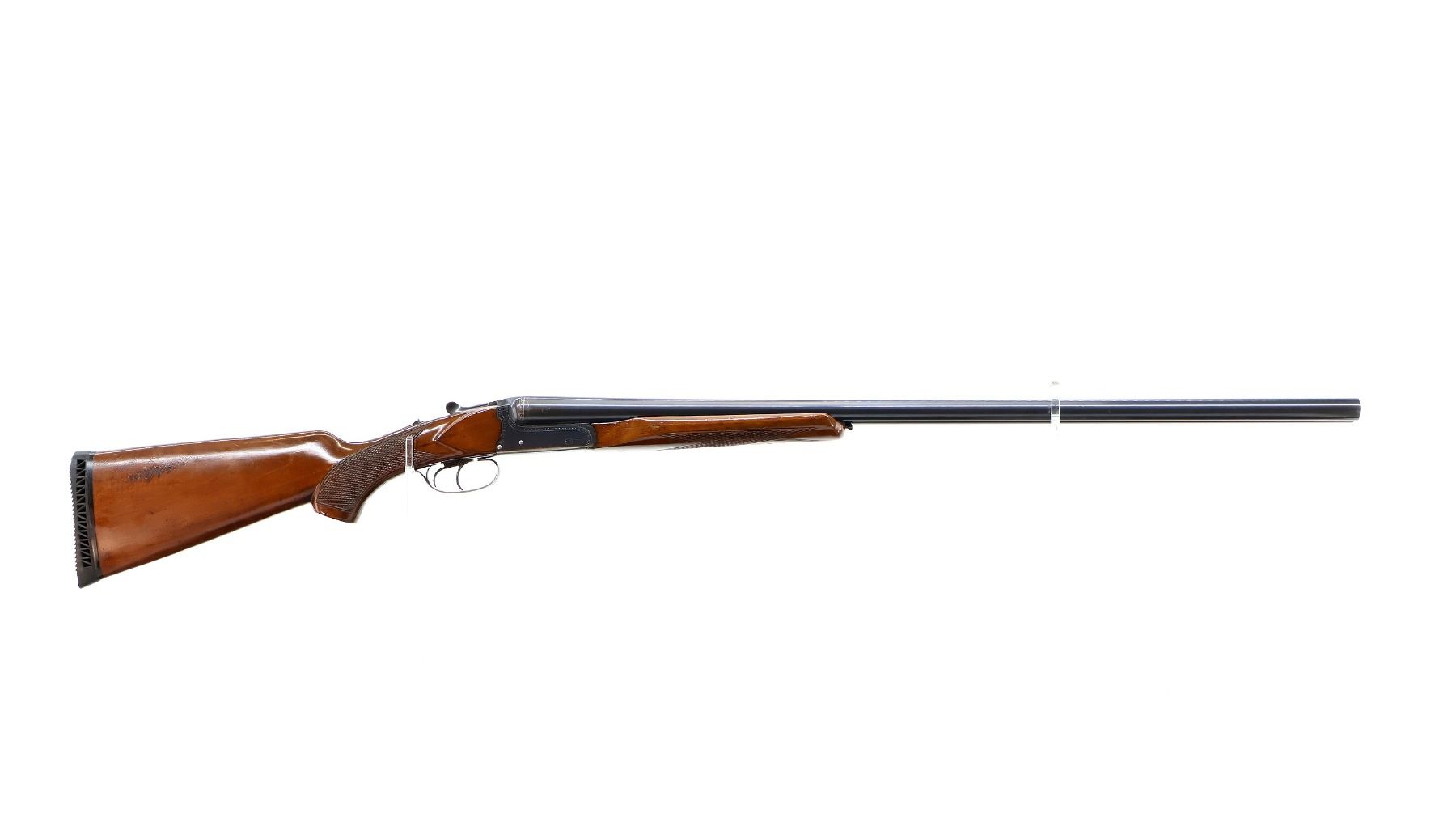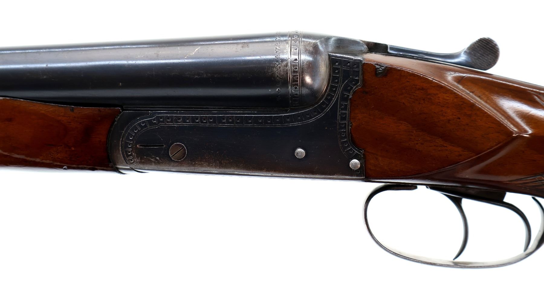 Main Description: Brass bead, blued finish, smooth rib, border engraved receiver, automatic safety, extractor, left hammer does not cock, stays in the fired position requires parts, adjustment or repair, double triggers. Two piece wood stocks, checkered Beavertail forearm and pistol grip, black vented rubber recoil pad.