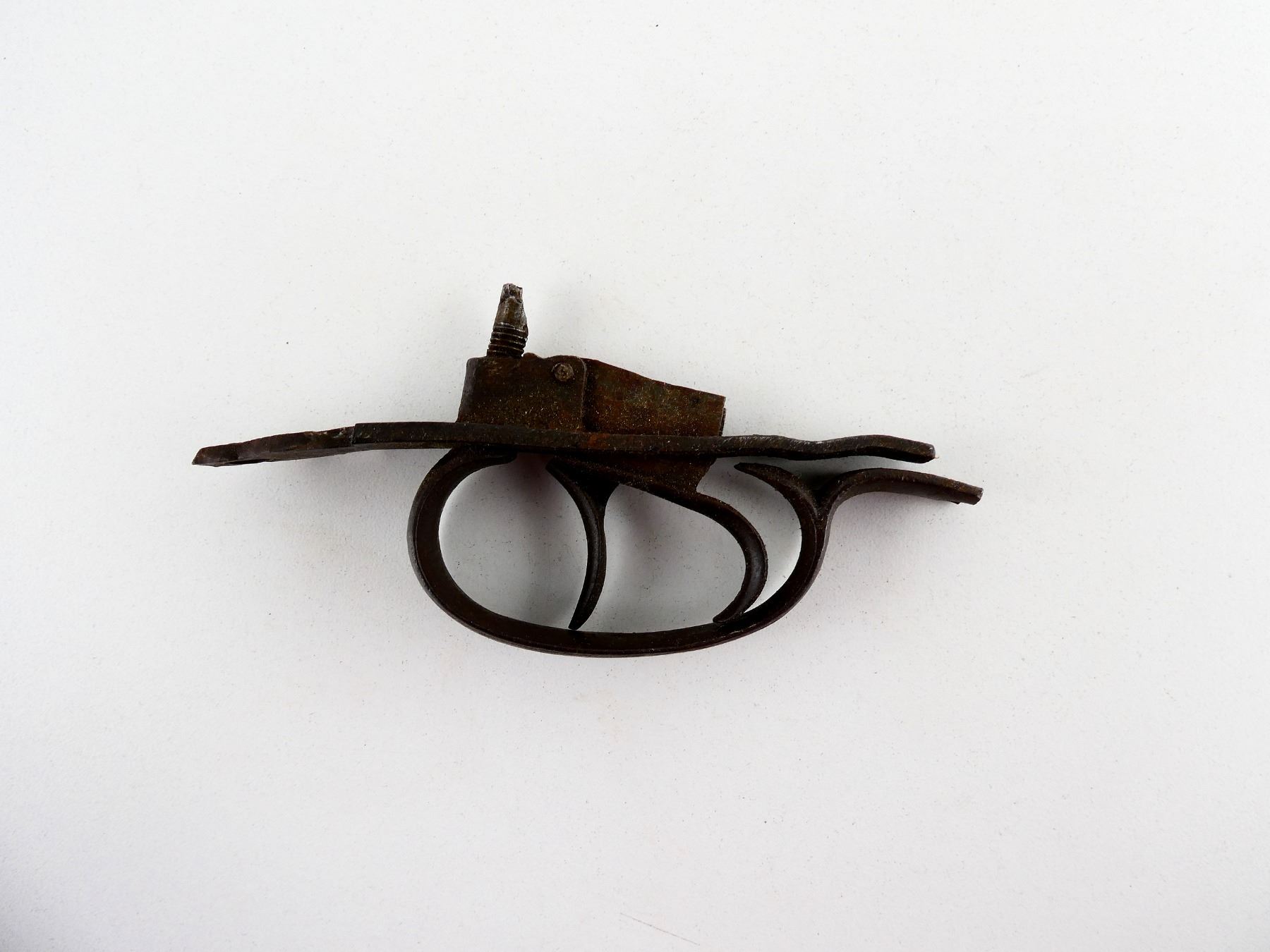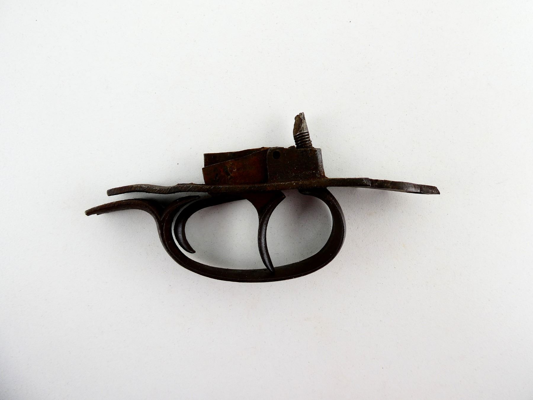 (1) TRIGGER MECH., INCOMPLETE, SHOWS RUST, OVERALL LENGTH APPROX. 5". MAY REQUIRE FITTING. SEE PHOTOS.