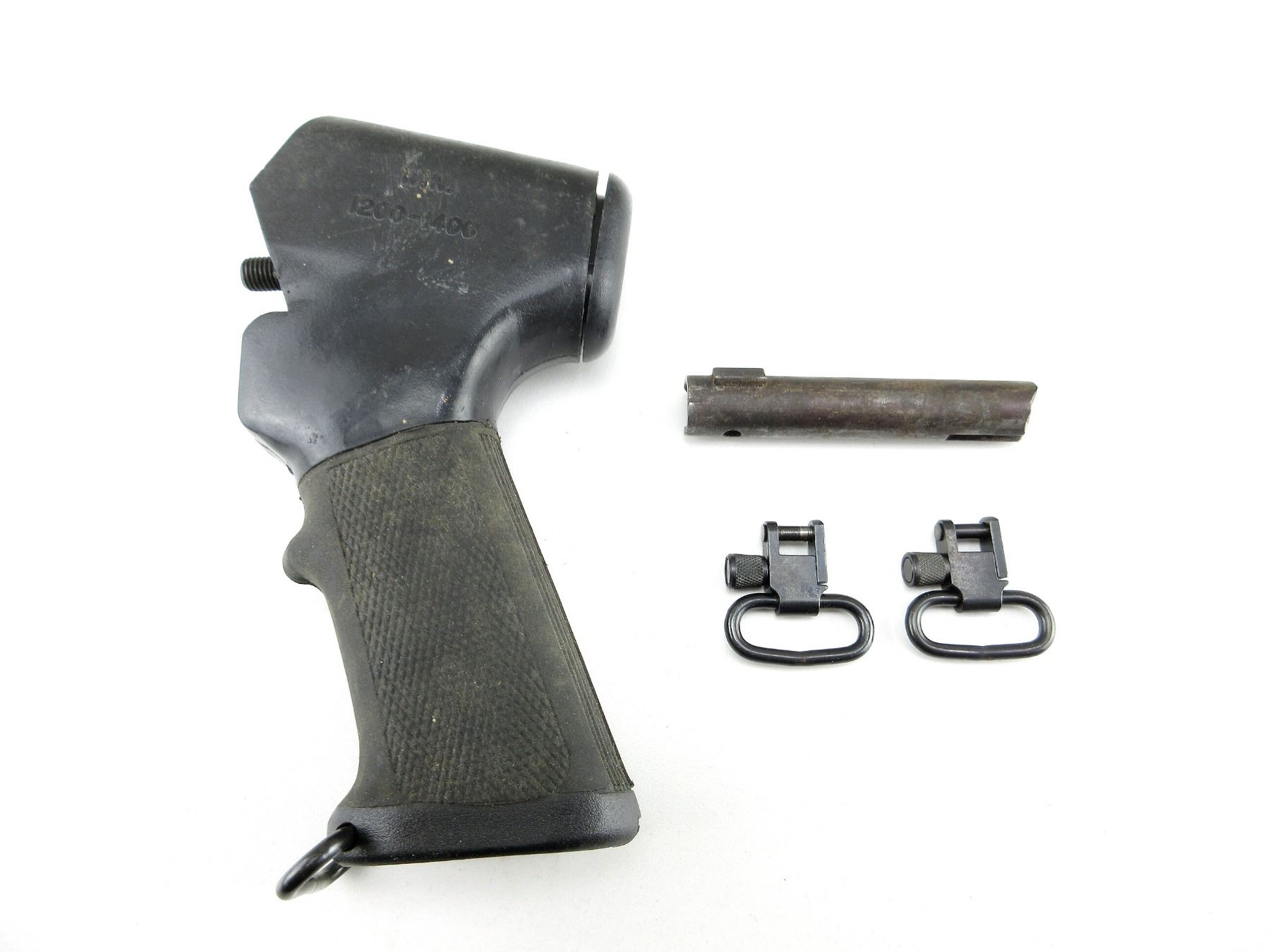 LOT INCLUDES; (1) UNKNOWN WINCHESTER 1200 PISTOL GRIP, BLACK POLYMER CONSTRUCTION, MARKED: "WIN", "1200-1400", ETC., (2) 1" SWIVELS, & (1) BROKEN M1 CARBINE BOLT, INCOMPLETE. MAY REQUIRE FITTING. SEE PHOTOS.