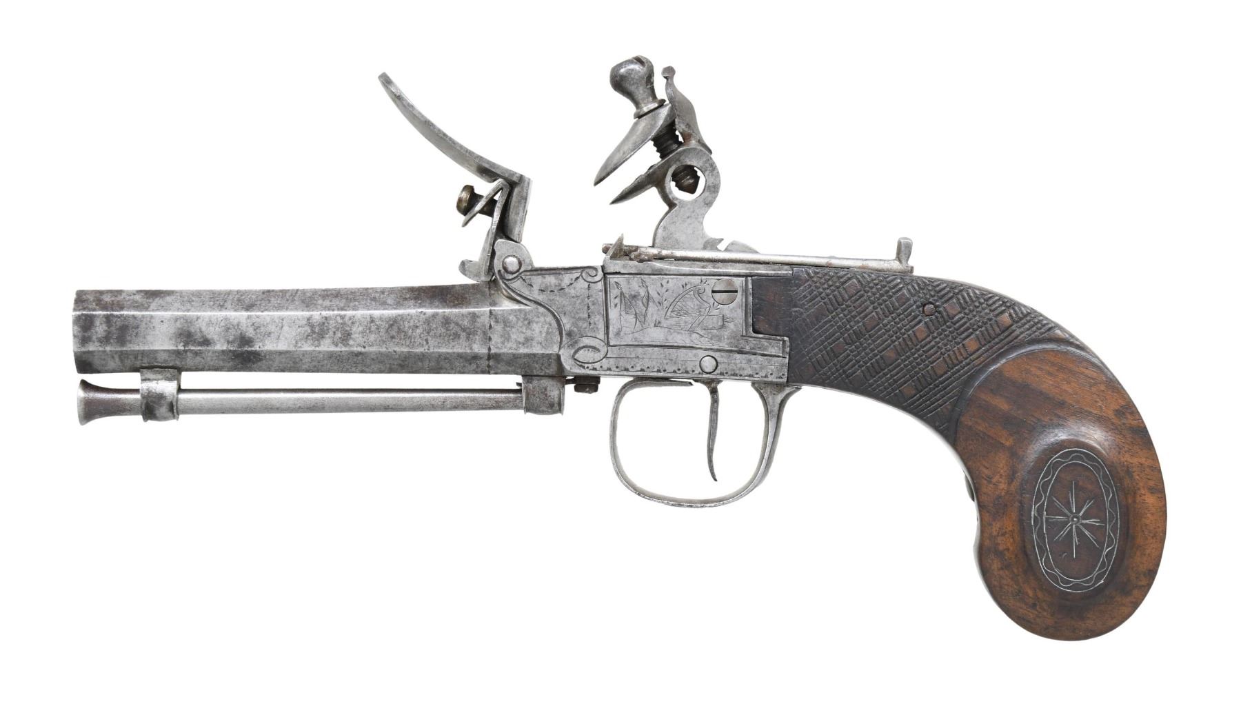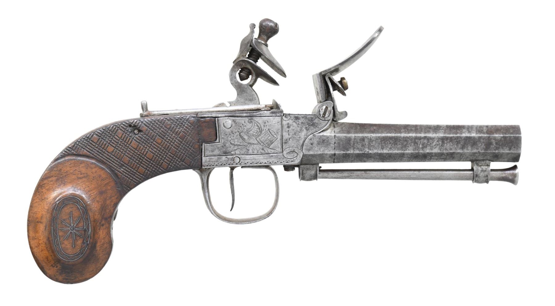 Cal. 48. NSN. Bbl. 4" octagon of Damascus steel w/ smoothbore. Boxlock action w/ center-mounted hammer & sliding bar top tang safety. Frame has patriotic theme engraving. 1 piece bag type walnut grip w/ skipline checkering at wrist having raised oval butt sections w/ highlights of silver wire inlay. Button tip iron ramrod. CONDITION: metal finish has faded to mottled gray showing spots of corrosion. Grips show light wear & handling marks. Functioning action w/ very stiff trigger pull. Lightly pitted bore. PROVENANCE: from the renowned collection of quality sporting arms from Lewis Drake together with inventory of Lewis Drake Associates. (01-26152/DS). ANTIQUE. $250-450.