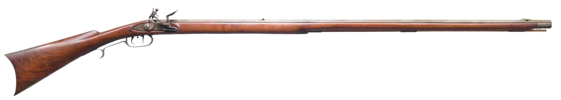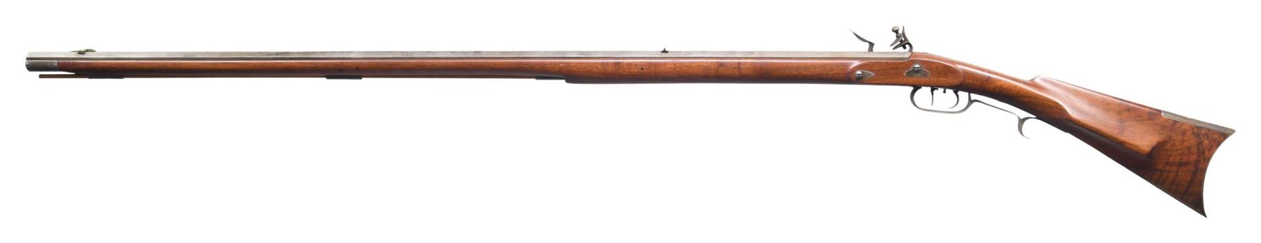 RIFLE. Cal. 28. NSN. Appears to be made from Dixie Gun Works "Squirrel" style kit. Oct. 41.5" barrel with brass blade front sight & notch rear sight. Unmarked lock. Double set triggers; rear is set & allows hammer to hold at full cock. Full length hardwood stock with crescent buttplate, hardwood ramrod, left side cheekpiece & finger curl triggerguard. CONDITION: Metal work has artificially aged gray patina with handling marks. Very god wood finish. Very good bore with strong rifling & light residue. PROVENANCE: from the renowned collection of quality sporting arms from Lewis Drake together with inventory of Lewis Drake Associates. (01-26176/MD). ANTIQUE. $400-600.