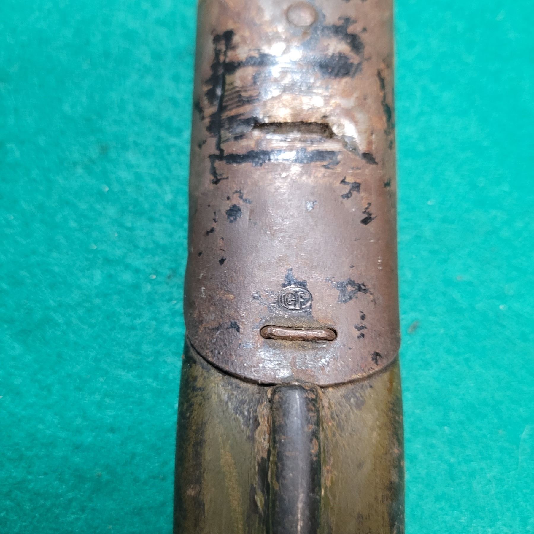 Complete with leather scabbard , but missing belt hooks. Stamped GF in Oval.
