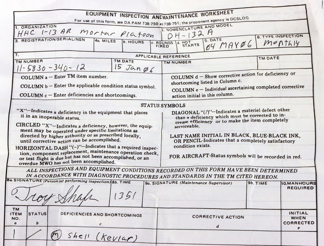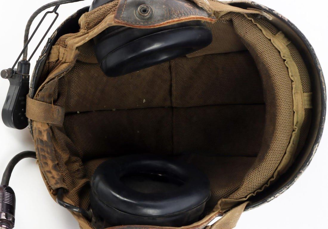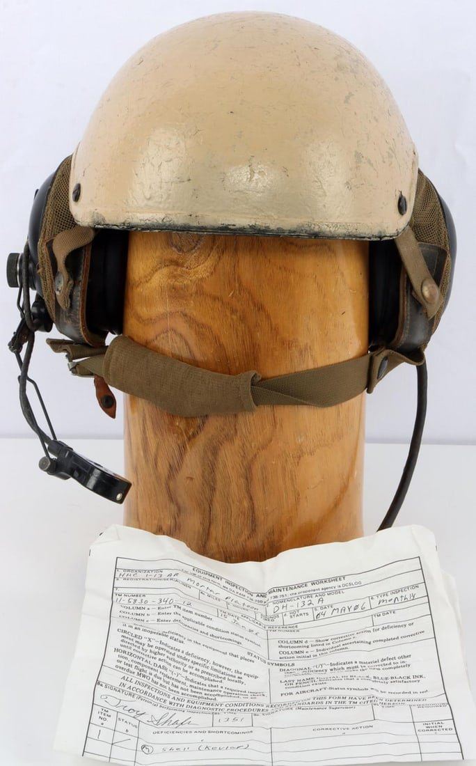 A United States Desert Storm Era, DH-132A Vehicle Crewman Tankers helmet. Elastic chinstrap. Has liner and ear padding. Liner is attached by velcro, helmet is marked 2691. Headset is marked, MK-1697/G. Back of helmet is marked, 83. Helmet also includes an equipment inspection and maintenance worksheet with TM Number 11-5830-340-12. Good condition.
