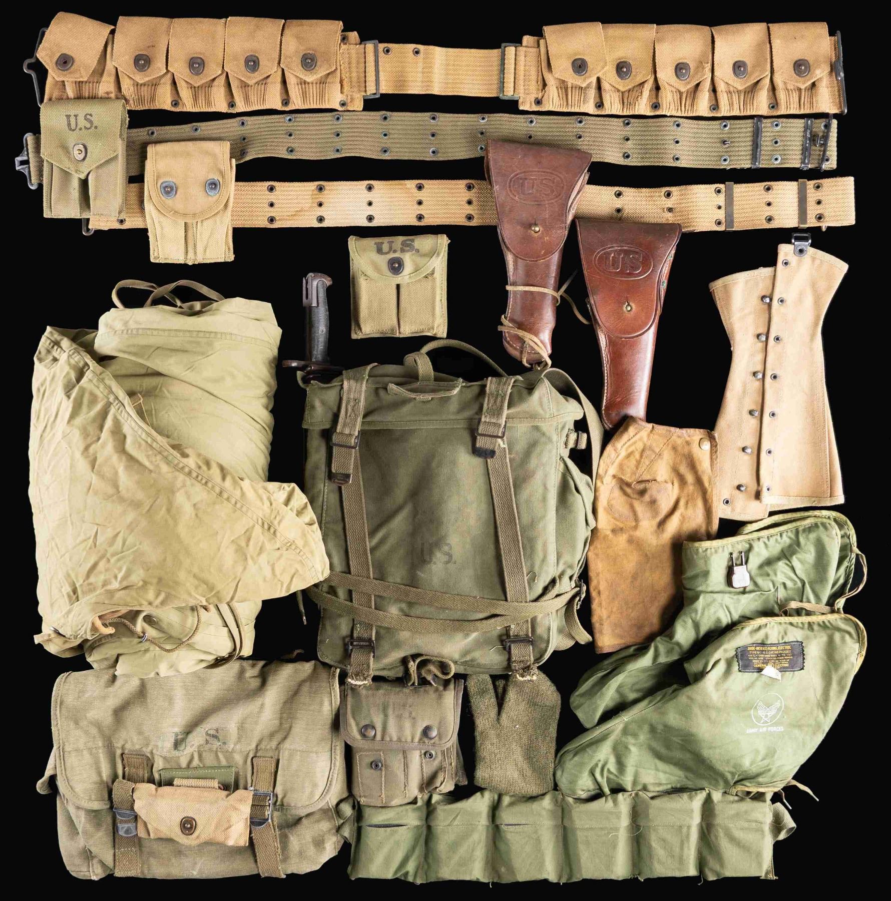 This group consists of 1 / WWII GI sleeping bag. 1 / Dual 30cal carbine clip pouch with clips. 1 / WWII OD backpack with an attached M1 bayonet & scabbard. 1 / Pair of Army Air Forces electric boot liners. 1 / Partial WWII OD first aid kit. 1 / OD WWII pistol belt with clip pouch and a leather 45cal automatic holster. 1 / Khaki OD WWII pistol belt with clip pouch and a leather 45cal automatic holster. 1 / US mussette bag with first aid kit attached. 1 / WW1 M1918 khaki 10 pocket ammunition belt. 1 / Breach cover for a 1903 Springfield. 1 / khaki puttee. 1 / OD wool mitten. 1 / Post WWII 6 pocket disposable 30cal bandolier. CONDITION: all items generally show light wear. Leather holsters are a bit dry. (02-24020-3/BF). $250-450.