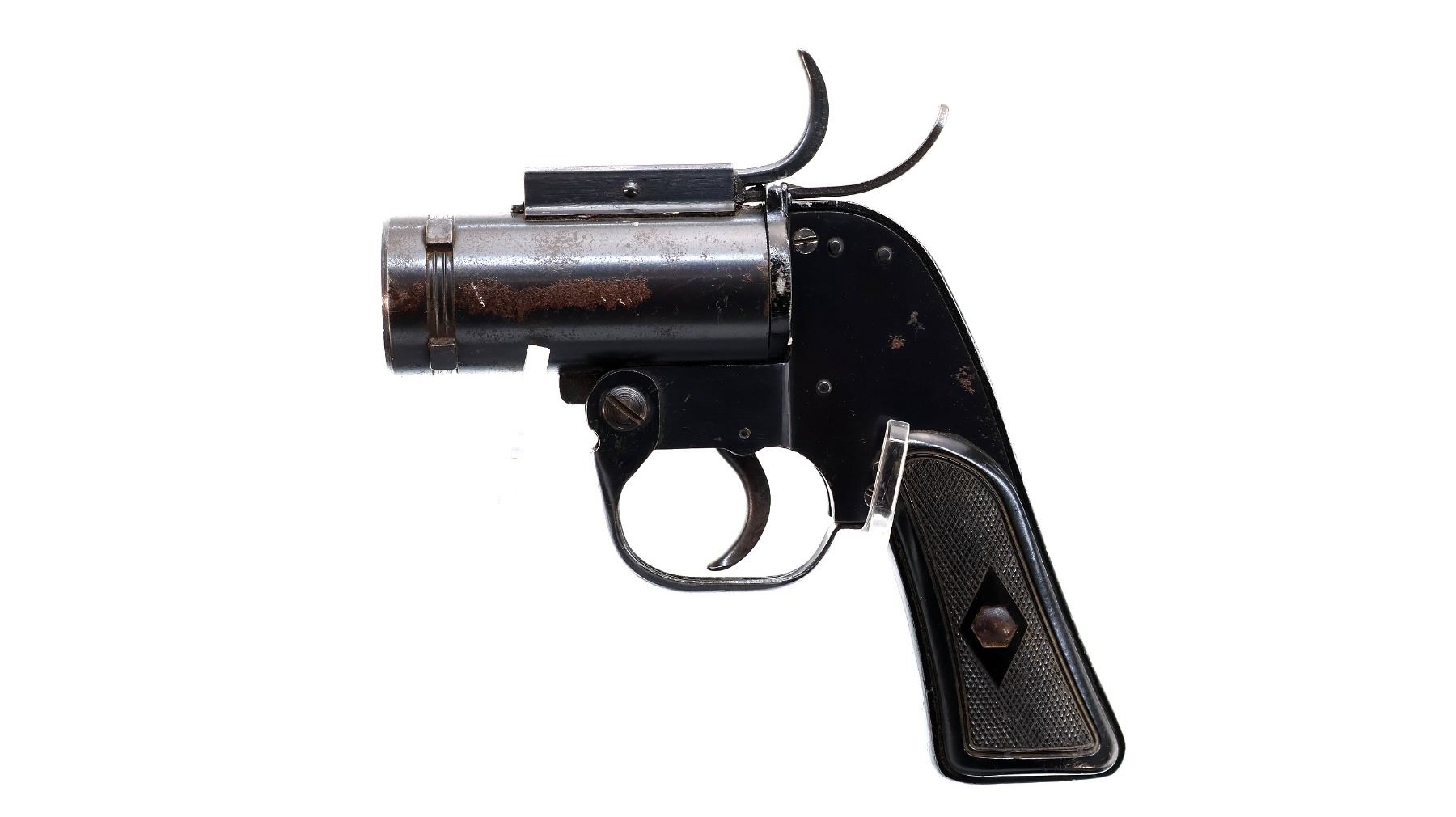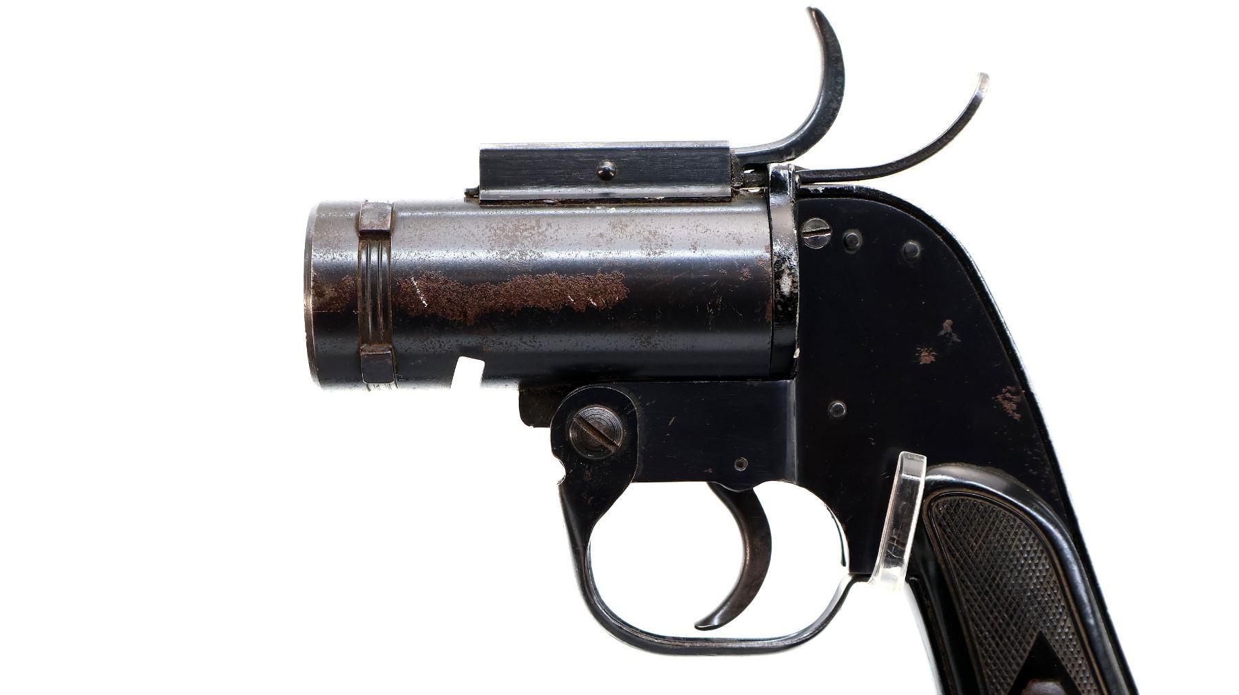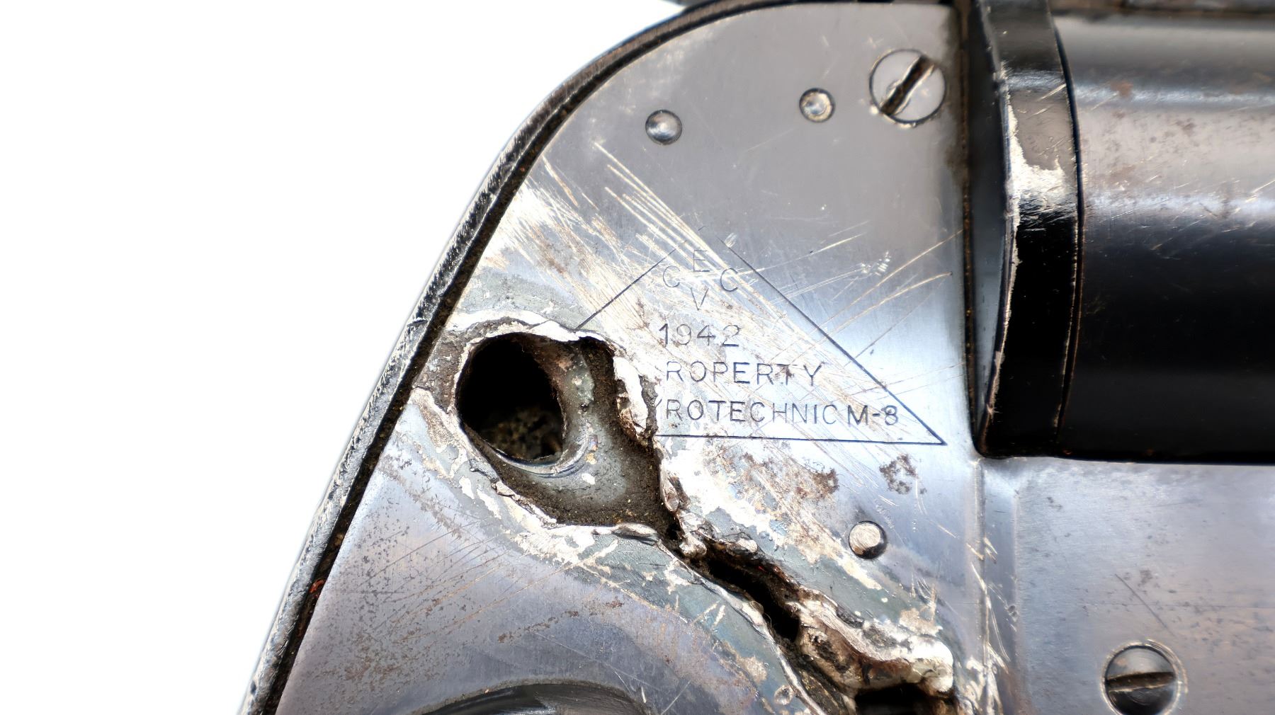 Main Description: Manufactured by ECCB 1942. No sights, blued finish, round barrel with 3 lugs attaches to port in aircraft to fire single flares, grooved opening lever, right side of frame has torch cut area from Military Demilling process. Two piece checkered black polymer grips