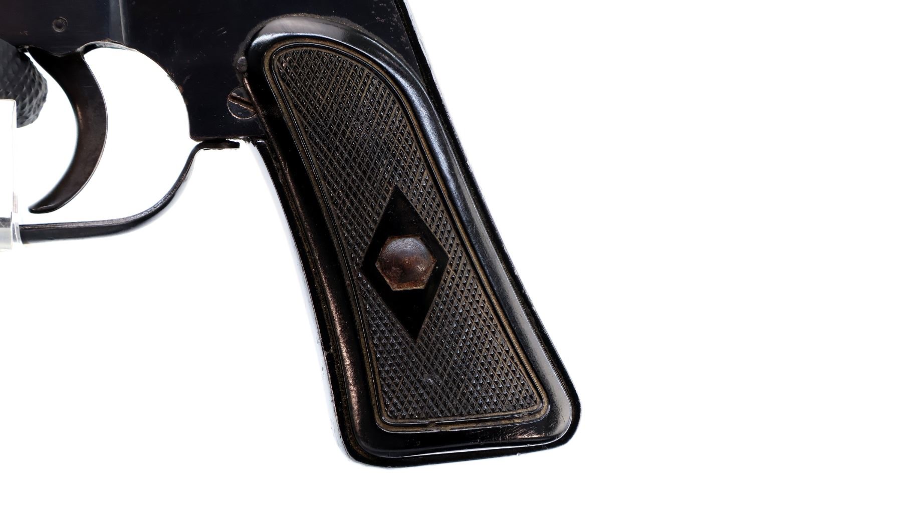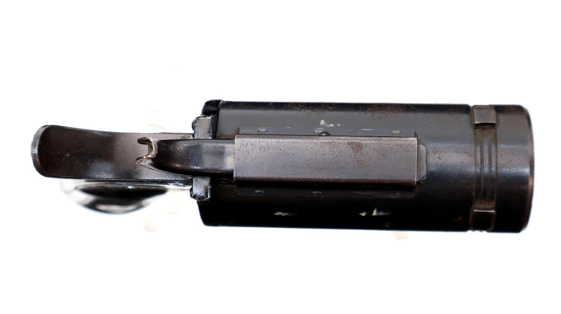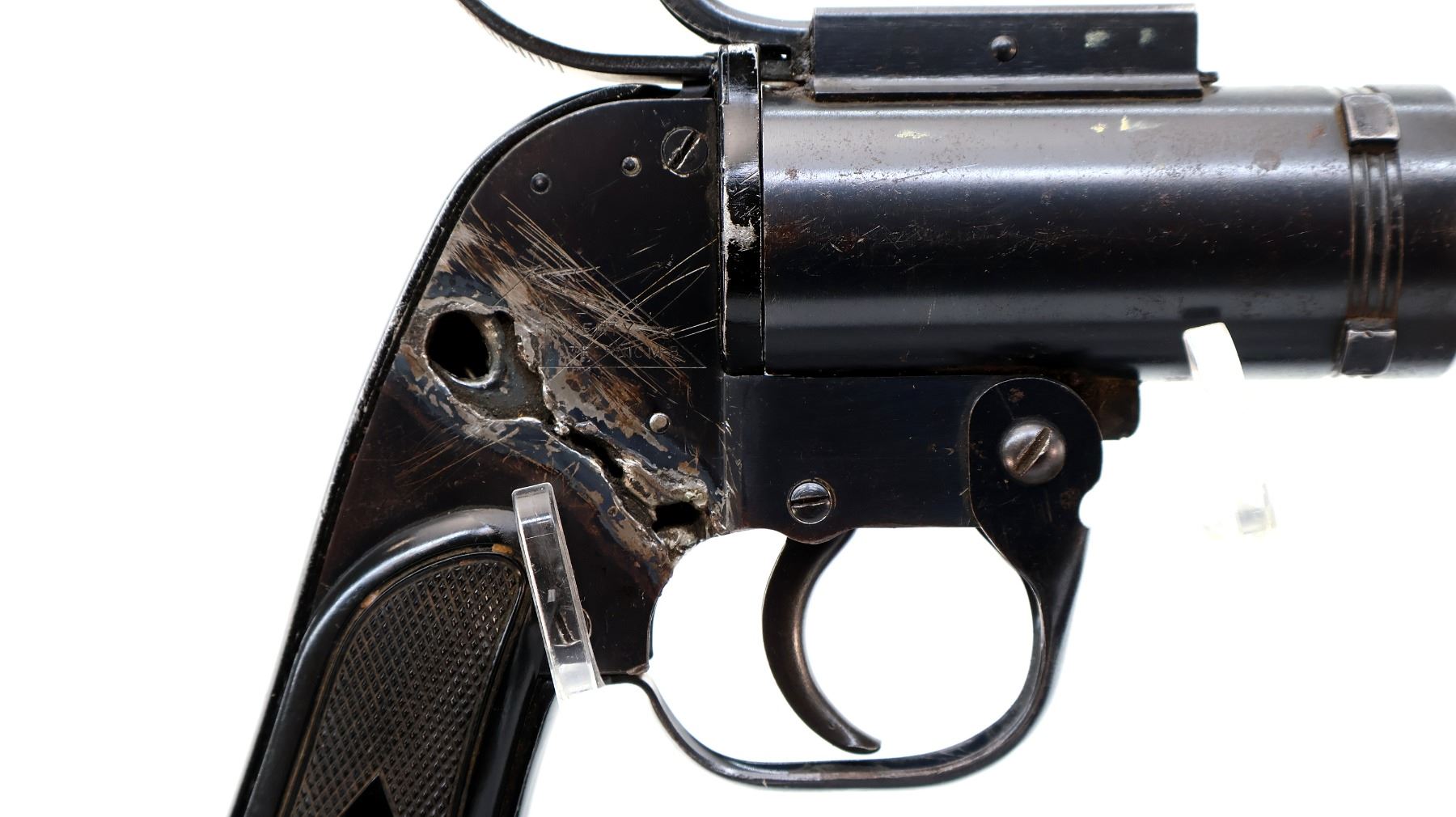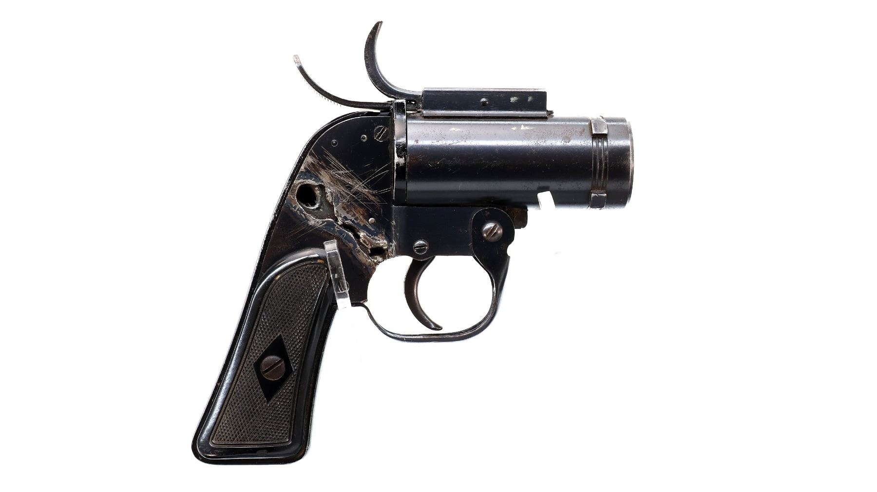 Main Description: Manufactured by ECCB 1942. No sights, blued finish, round barrel with 3 lugs attaches to port in aircraft to fire single flares, grooved opening lever, right side of frame has torch cut area from Military Demilling process. Two piece checkered black polymer grips