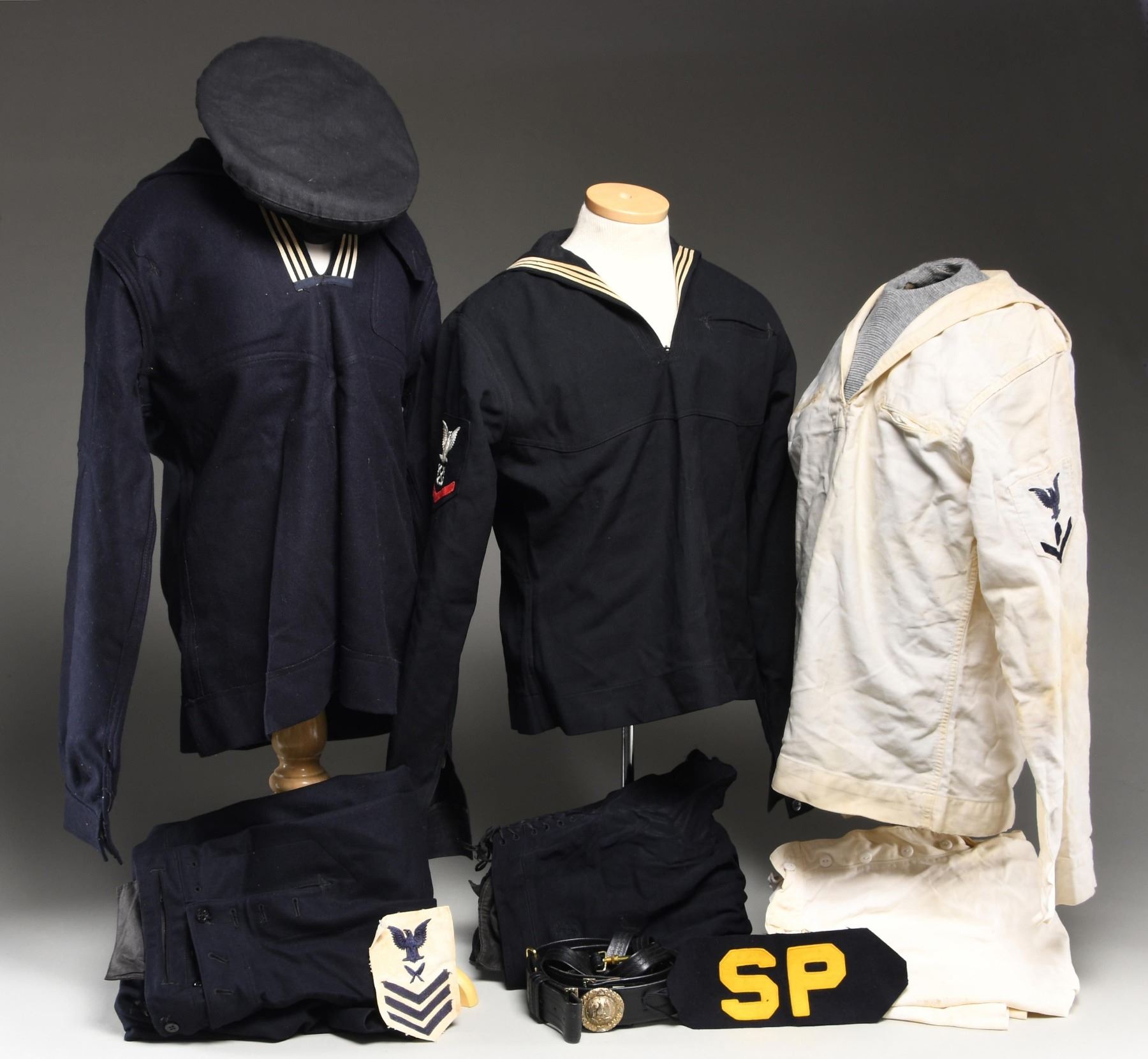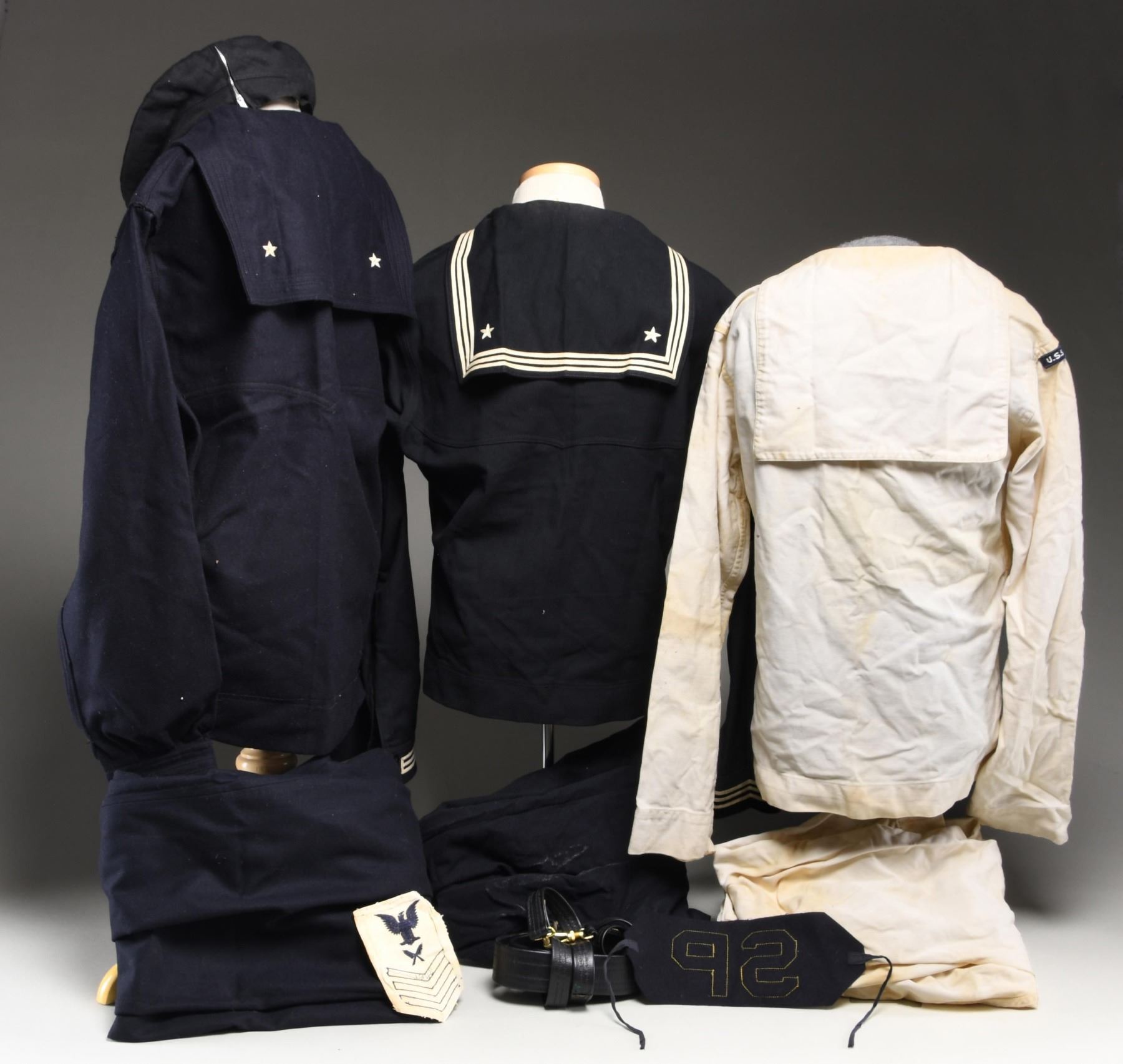 This large lot consists of 1 / Summer white jumper for a 3rd class Electricians Mate on the U.S.S. Cree. 2 / pair of summer white pants. 1 / 1st class Yeoman patch. 1 / "Donald Duck" hat with a tally that reads "U.S.NAVY".with rain cover. 1 / Shore Patrol armband. 1 / Black tie. 1 / Officer's sword belt with sword straps in its issue box. 4 / Pair of enlisted dress blue "crackerjack" pants. 4 / Enlisted dress blue "crackerjack" jumpers. CONDITION: all uniforms and parts are in good serviceable condition. (02-24042/BF). $150-300.
