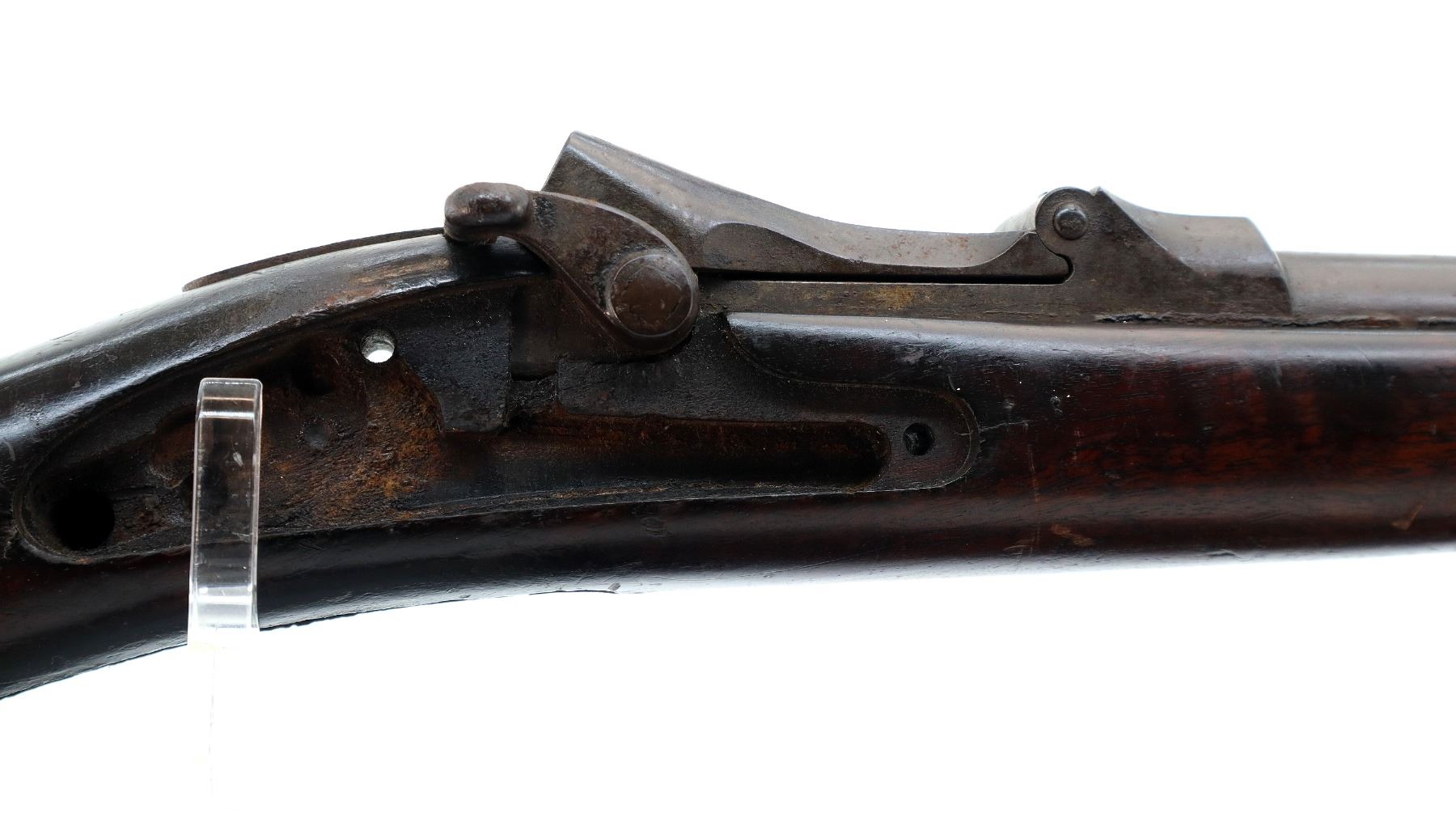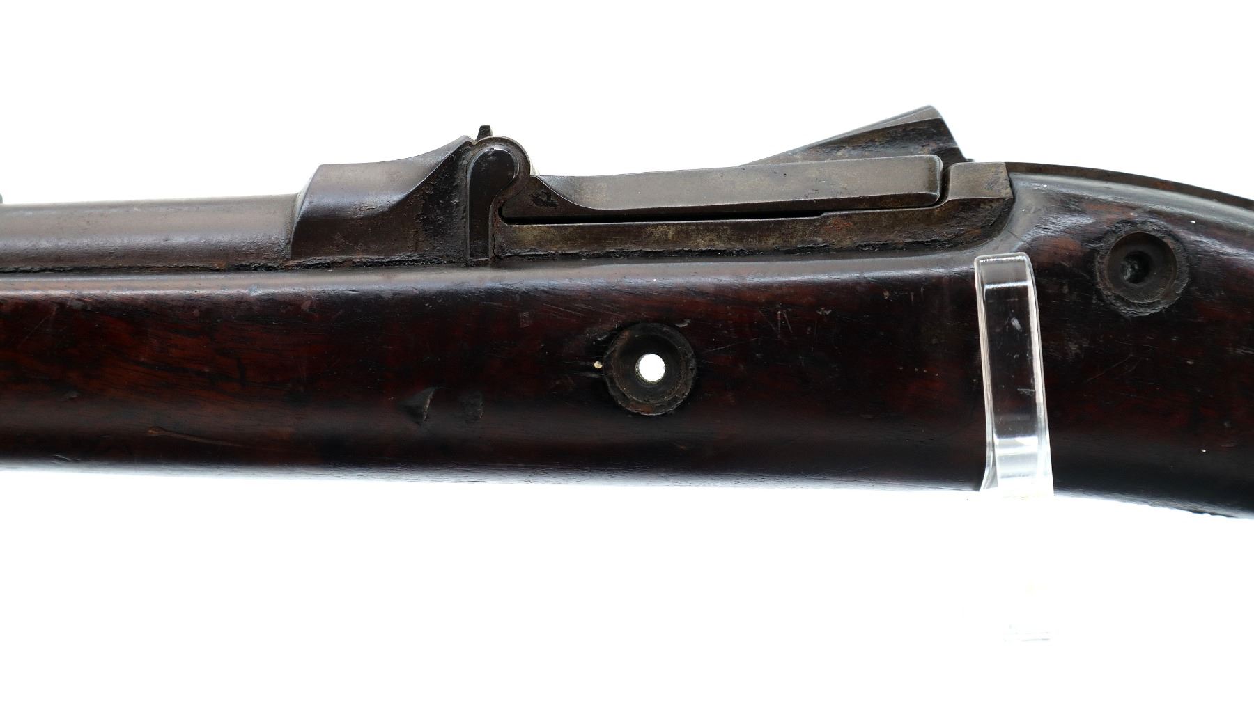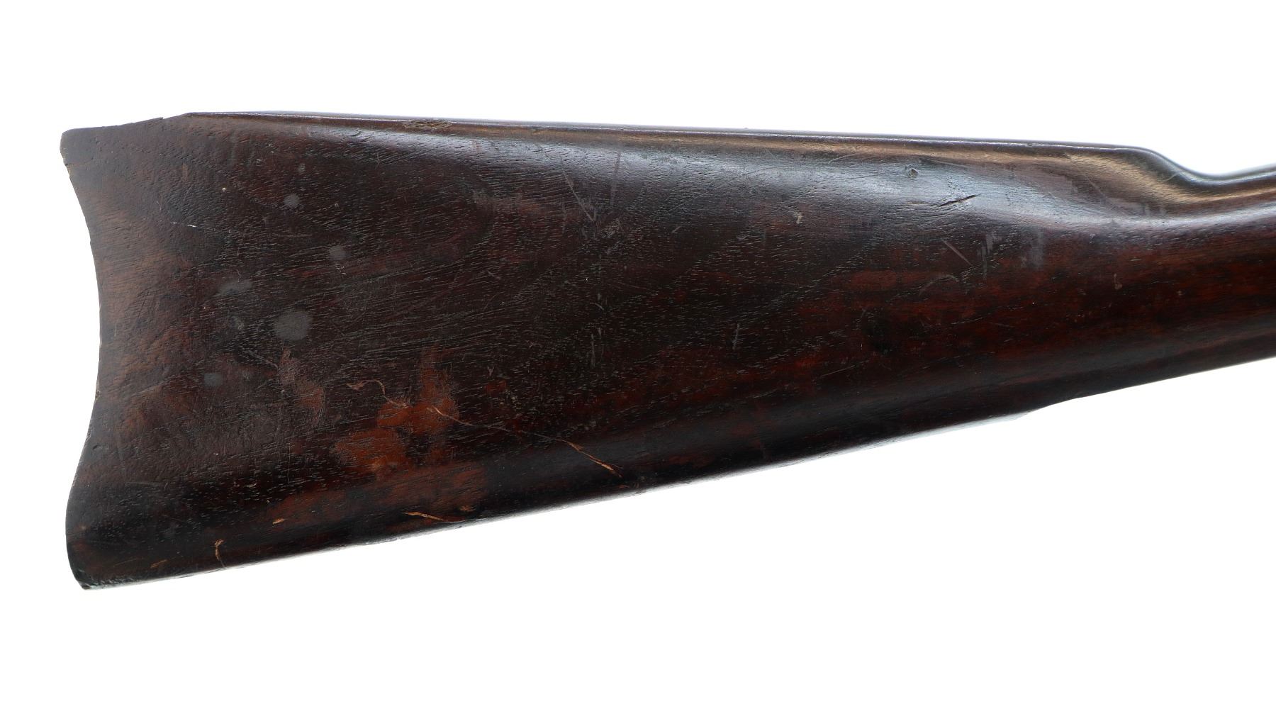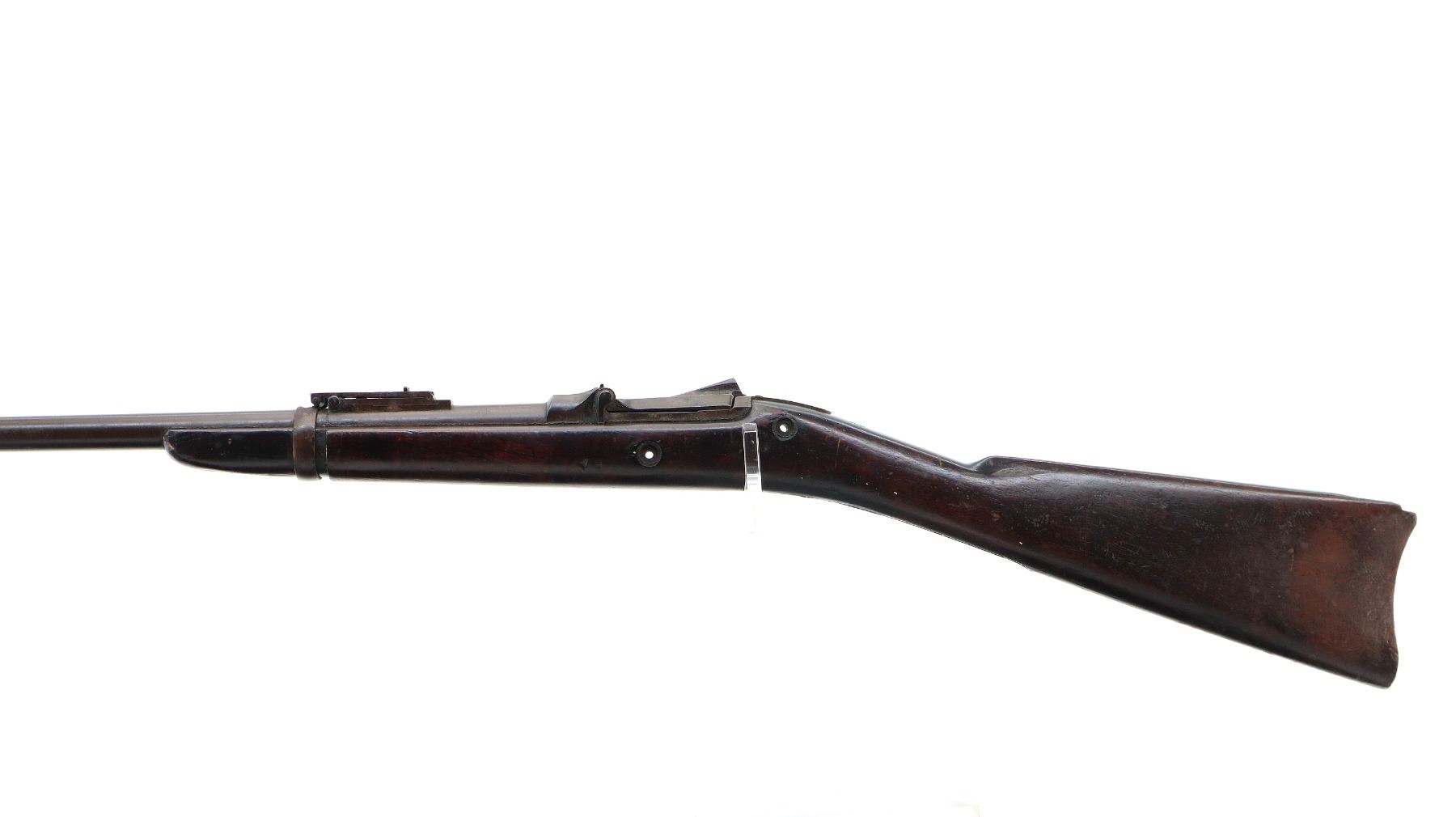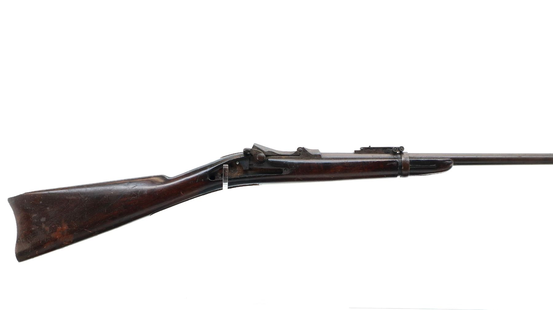 Main Description: Blade front sight with ramp, adjustable u notched ladder rear sight, includes complete breech block, missing side lock, action screws, trigger guard assembly, butt plate and screws. Has a one piece sporterized wood stock, straight grip, stock chipped at heel and toe, single barrel band, front swivels which have been soldered to barrel.