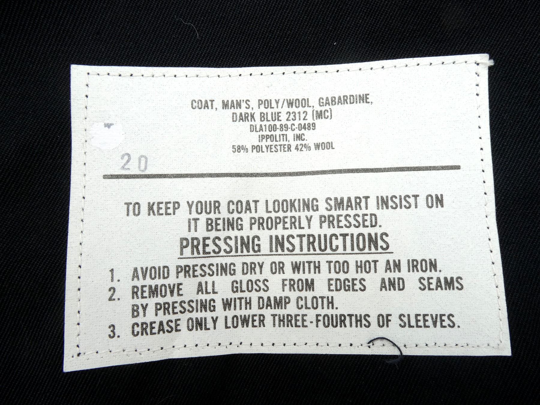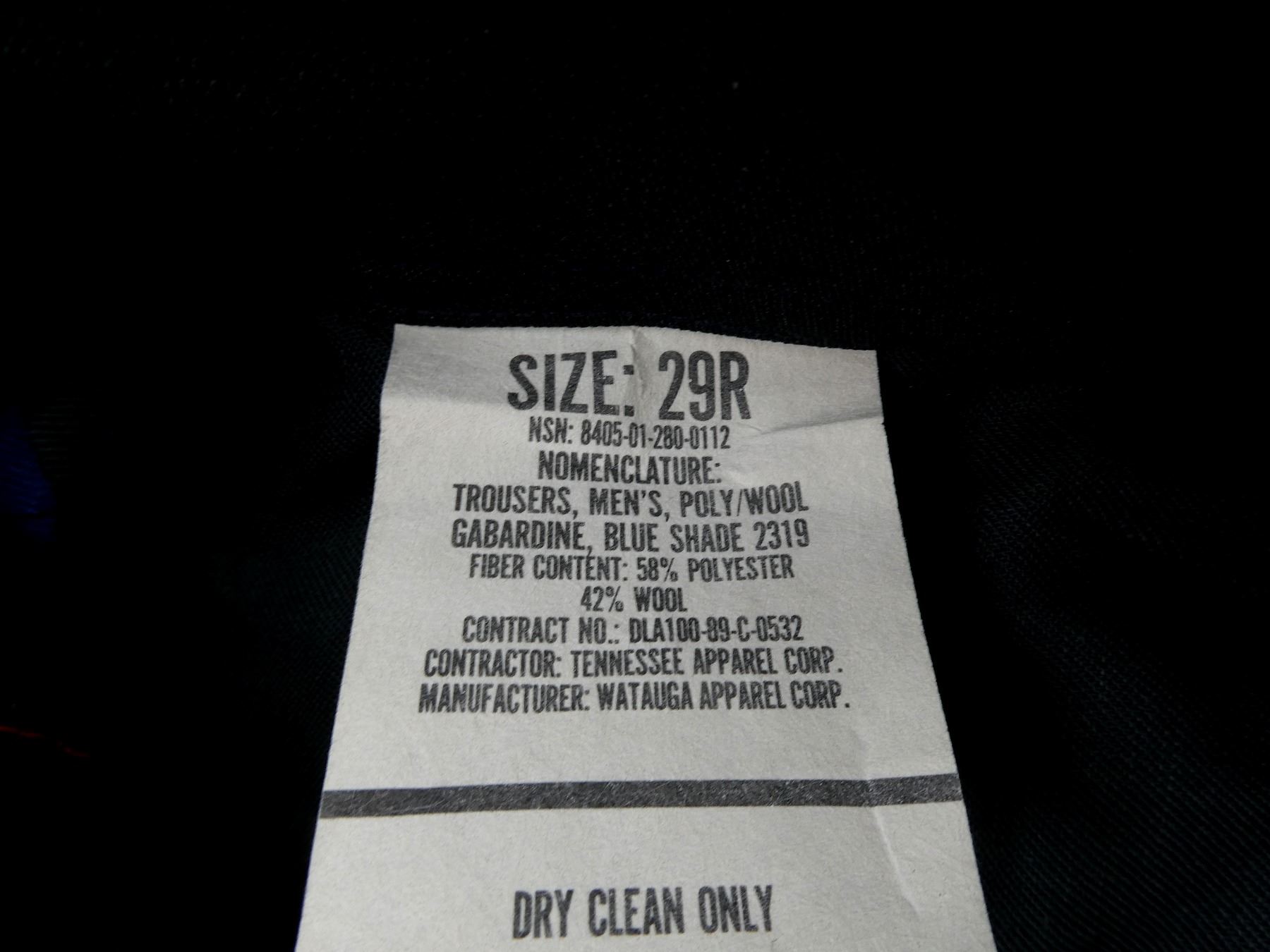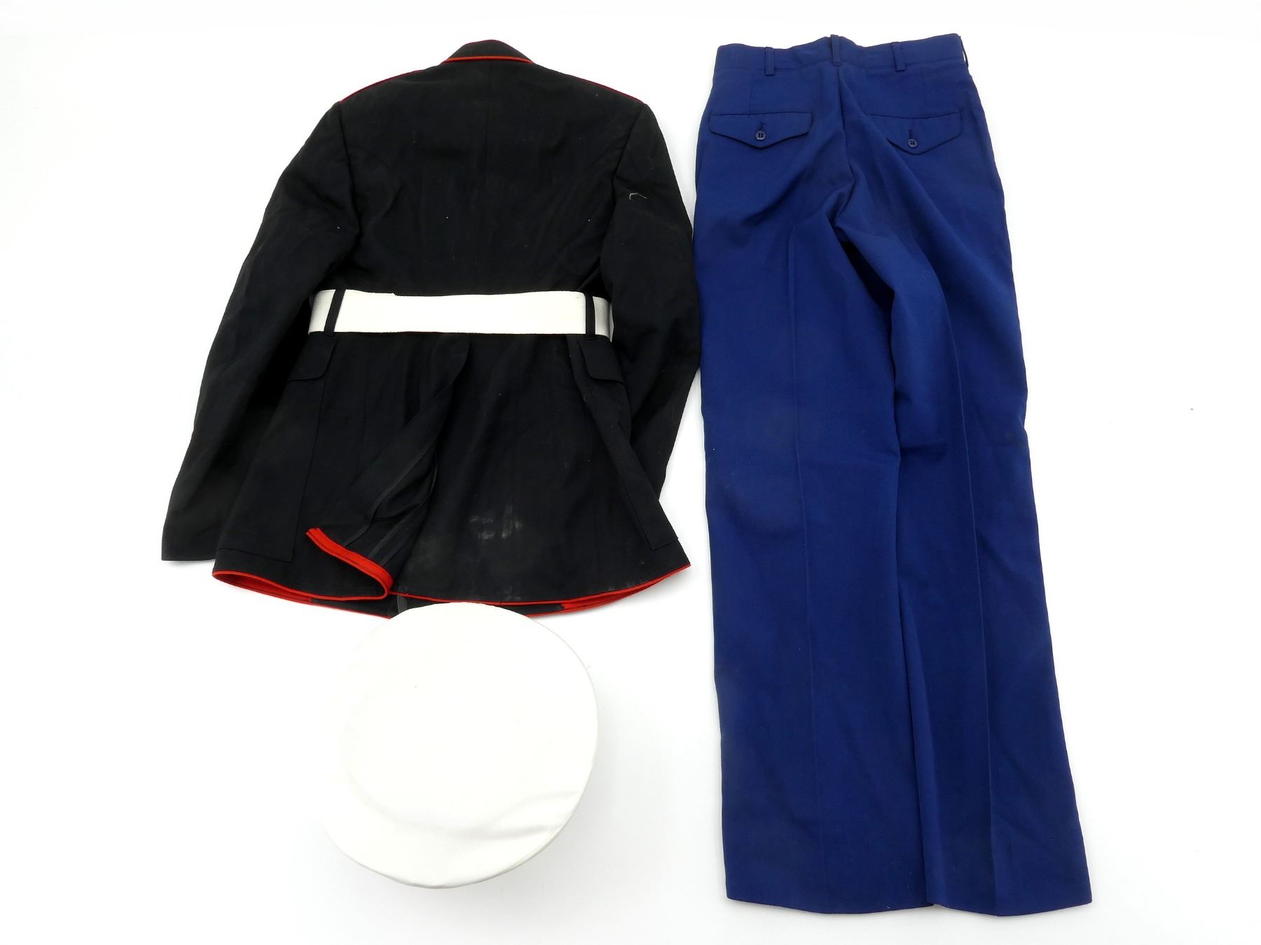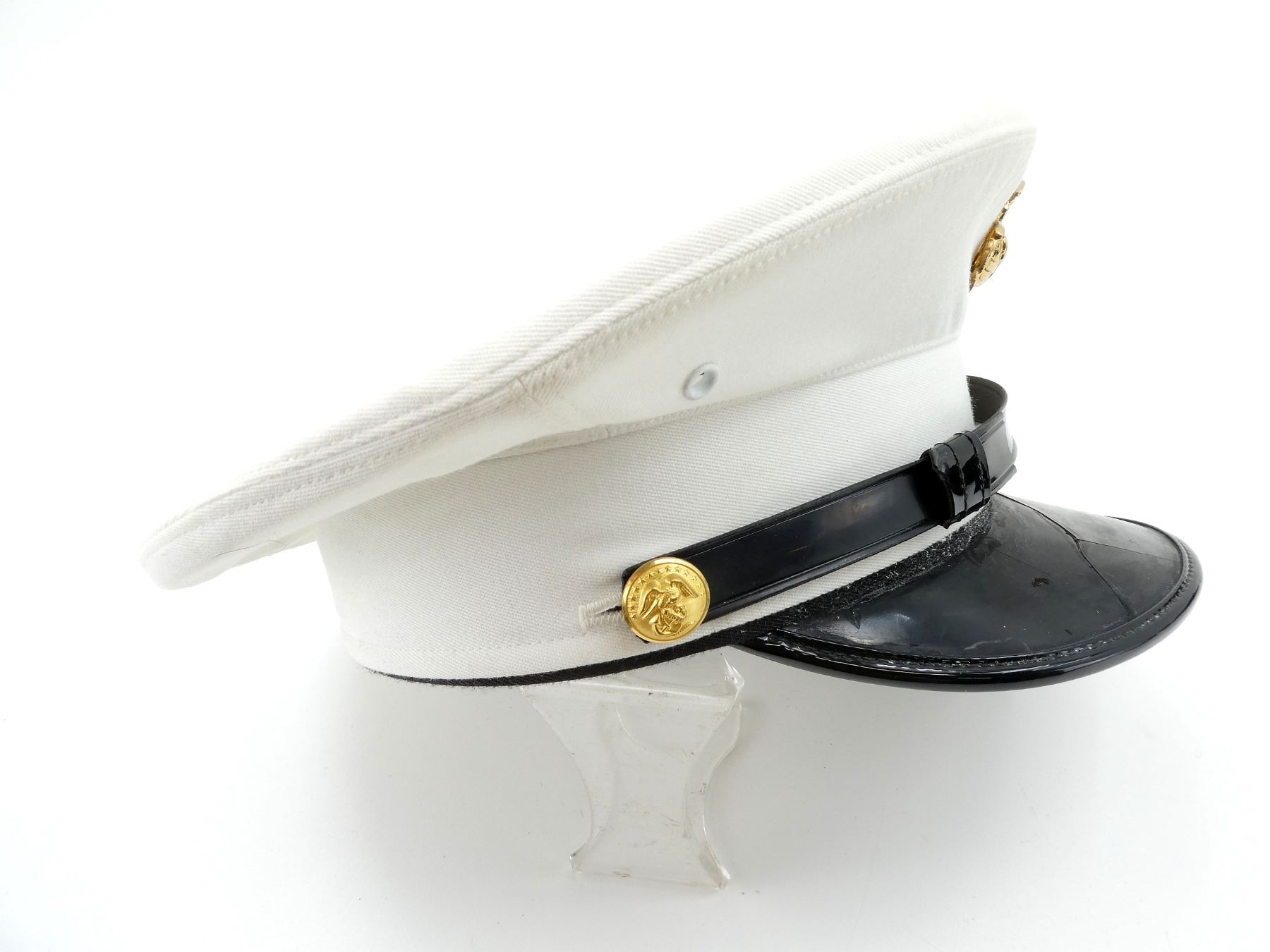 LOT INCLUDES; (1) USMC DRESS BLUES TUNIC WITH WHITE WAIST BELT, NAVY BLUE WITH RED PIPING, CLOSED COLLAR, BRASS USMC BUTTONS, MARKED: "COAT, MAN'S, POLY/WOOL, GABARDINE, DARK BLUE 2312 (MC)" ETC., SIZE 36S, VARIOUS LABELS / MARKINGS, SHOWS SLIGHT WEAR, (1) USMC DRESS BLUES PANTS, BLUE WITH RED STRIPE, SIZE 29R, MARKED: "NSN: 8405-01-280-0112, NOMENCLATURE: TROUSERS, MEN'S POLY/WOOL, GABARDINE, BLUE SHADE 2319" ETC., ZIPPERED-FLY (WORKS), SHOWS SLIGHT WEAR & (1) USMC DRESS BLUES WHITE PEAKED CAP WITH USMC CREST CAP BADGE, POLYMER CHIN STRAP, BRASS USMC BUTTONS, INK STAMP MARKINGS INSIDE, SHOWS AGE / WEAR. SEE PHOTOS.