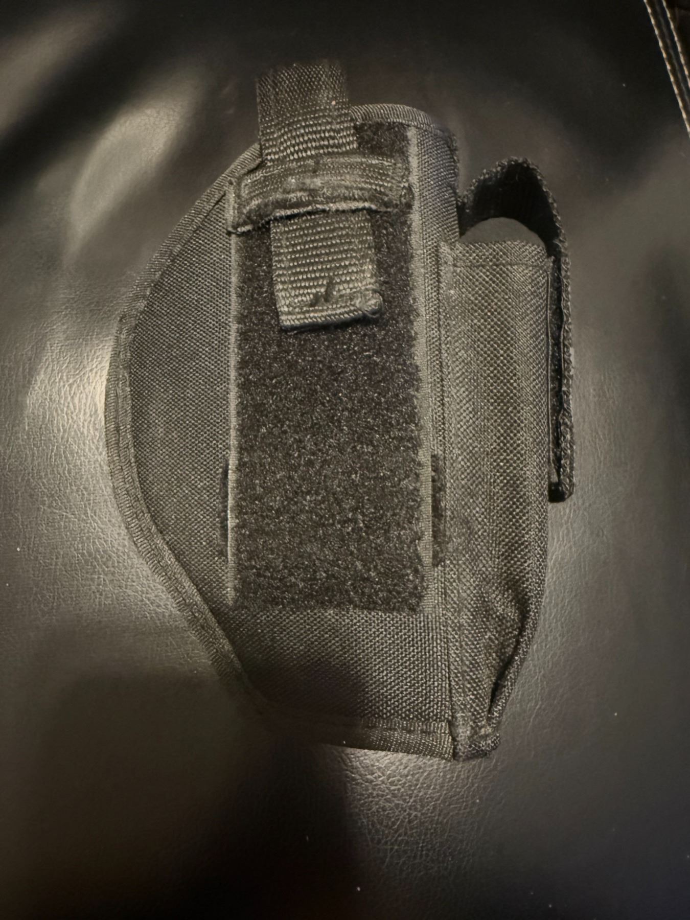 UTG Tactical black nylon pistol holster, designed to fit a wide range of compact to mid-size handguns. This holster includes an integrated magazine pouch and adjustable Velcro retention strap, making it a versatile and practical option for everyday carry or range use. Great as a spare holster, range holster, backpack holster, or entry-level carry option.