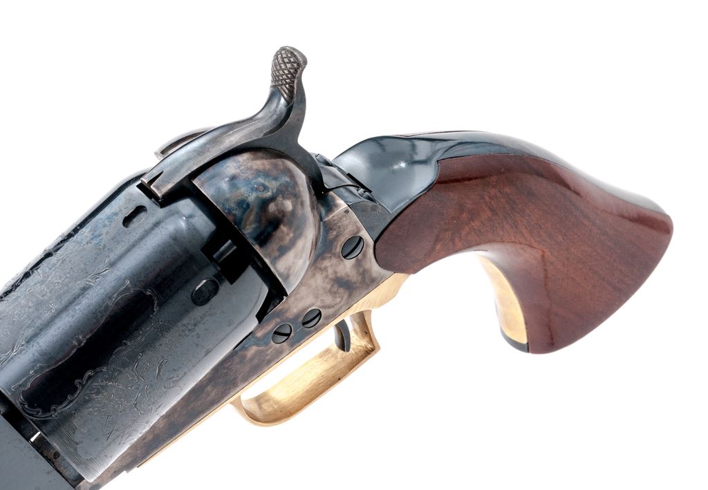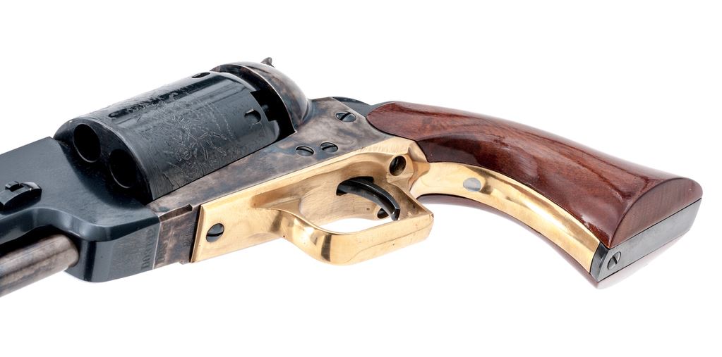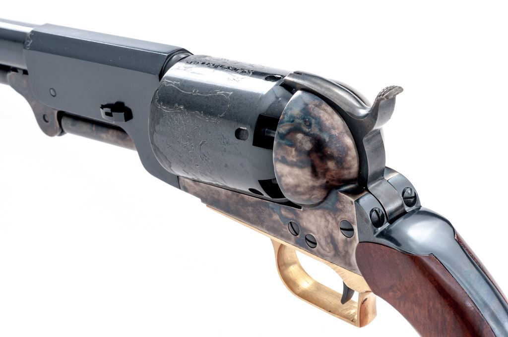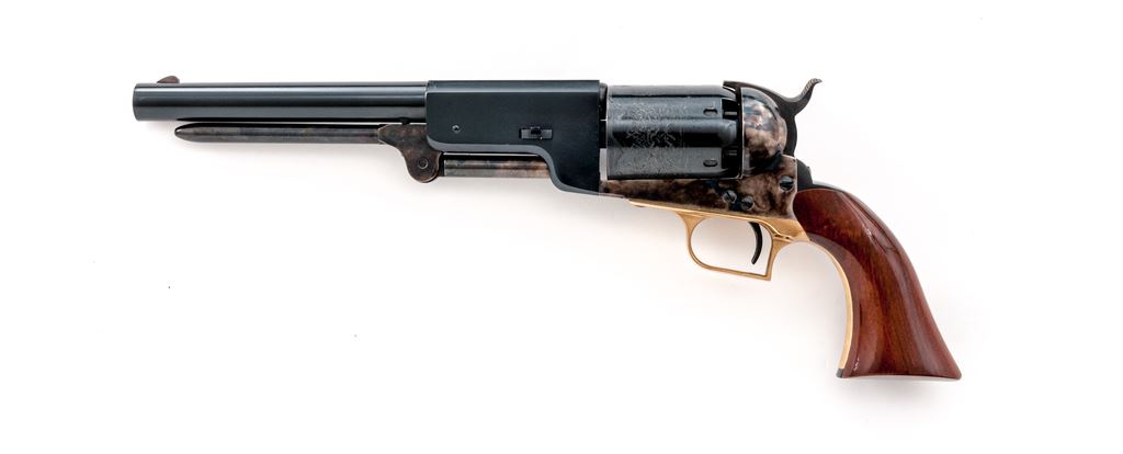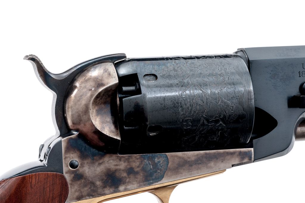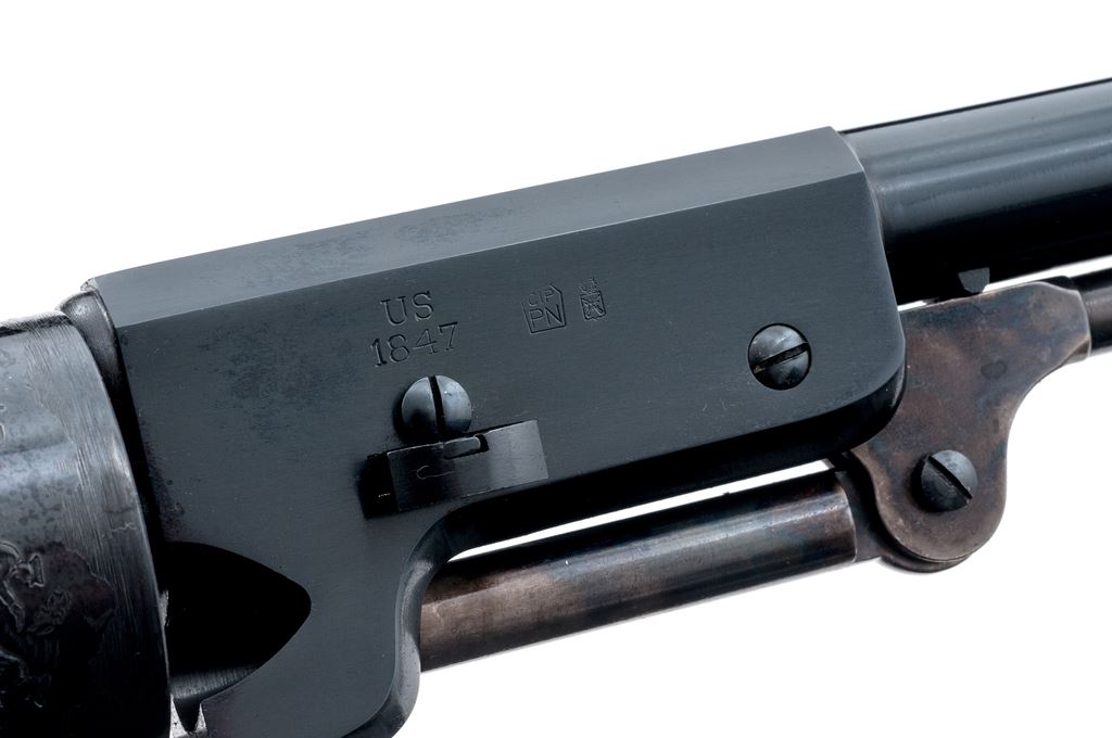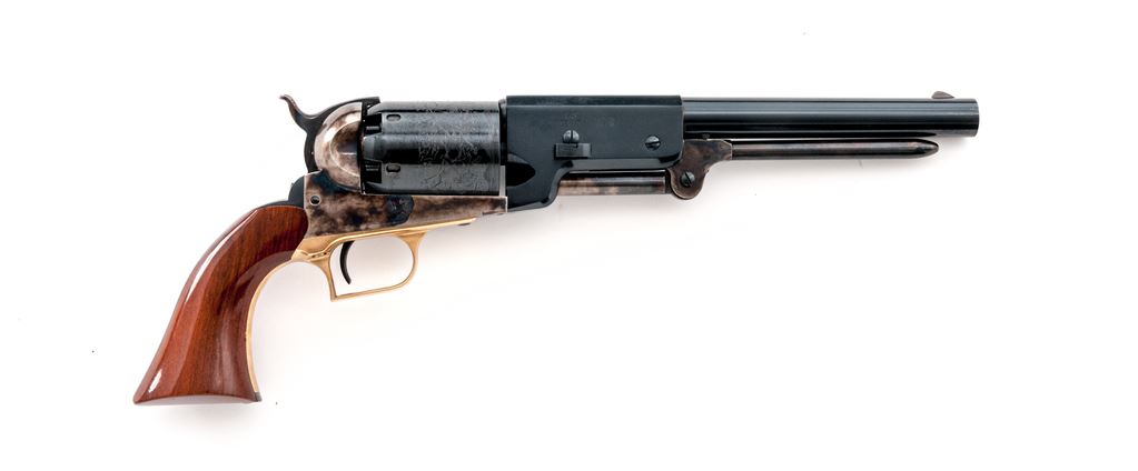 Reproduction Colt U.S. Army Model 1847 ''Walker'' Percussion Pistol, by A. Uberti, #DO3142, .44 cal., blued 9'' wedge-retained round-to-octagonal barrel has maker's info, black powder warning, and case hardened spring-retained hinged loading lever beneath, ''US/1847'' and Italian marks to right side; blued round 6-shot cylinder is decorated with the ''Texas Rangers-Indians fight'' rolled scene and ''Model U.S.M.R.'' within a fancy riband; open-top frame has ser. no. and Italian marks to bottom, central hammer and trigger, brass ''square-back'' trigger guard and steel backstrap, one-piece varnished walnut grips. Condition is as new retaining all of its deep, glossy original finishes. Action is strong and crisp; bore is brilliant retaining 100% blue (as do cylinder bores) and sharp rifling. Est.: $500-$750. (No FFL Required)