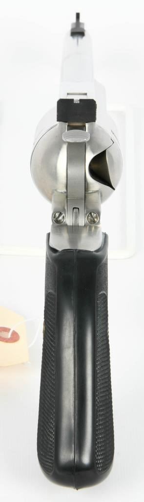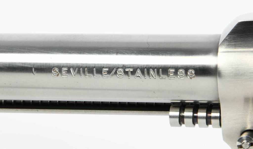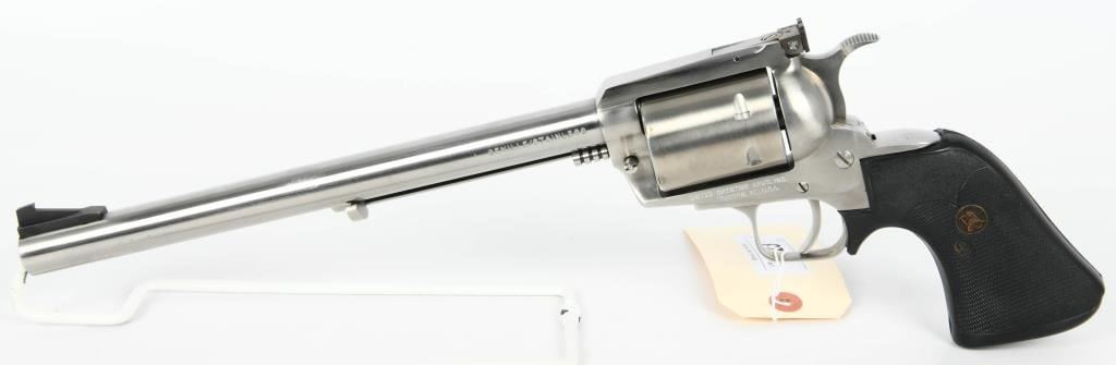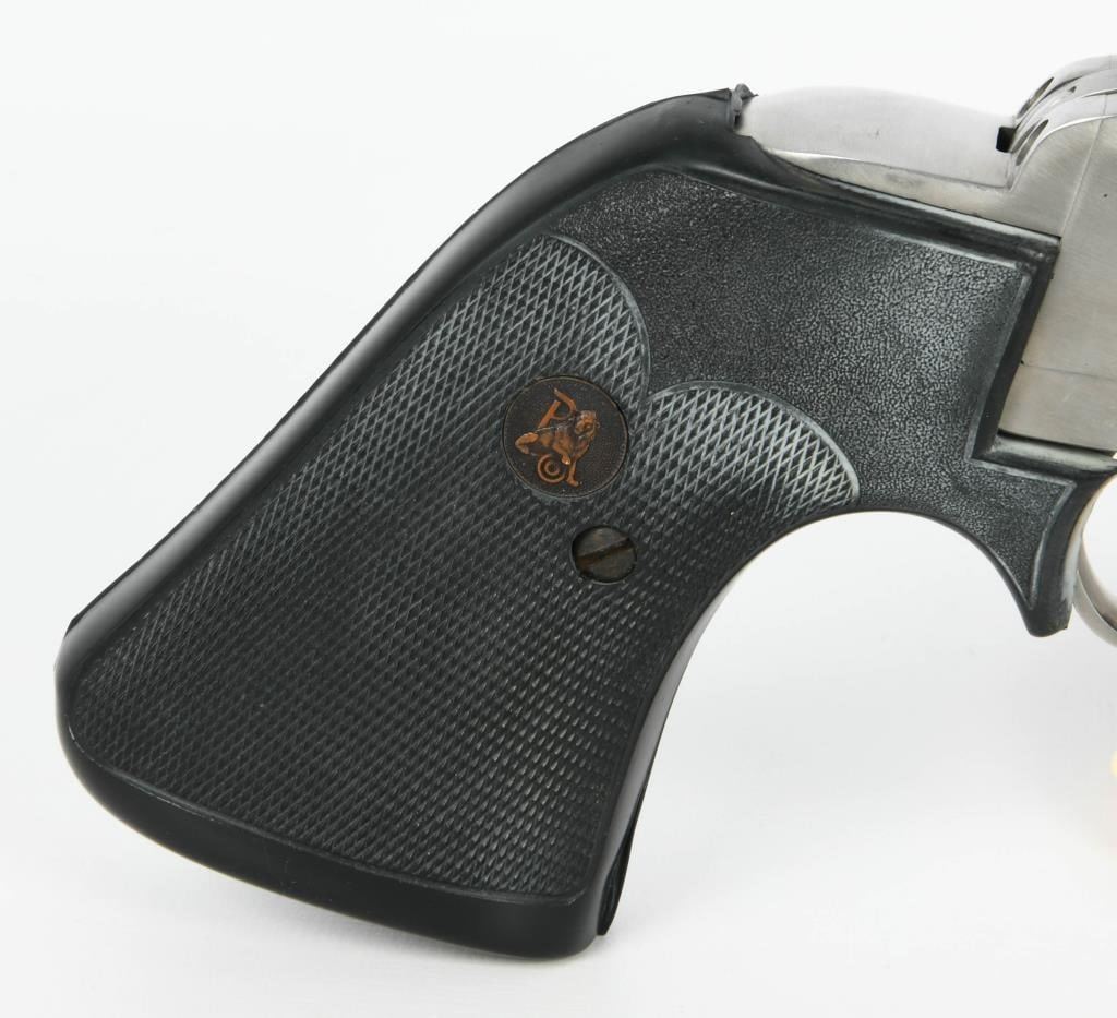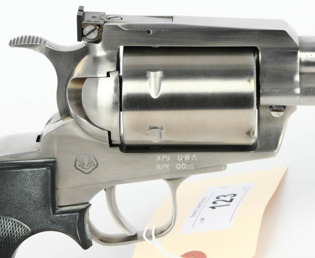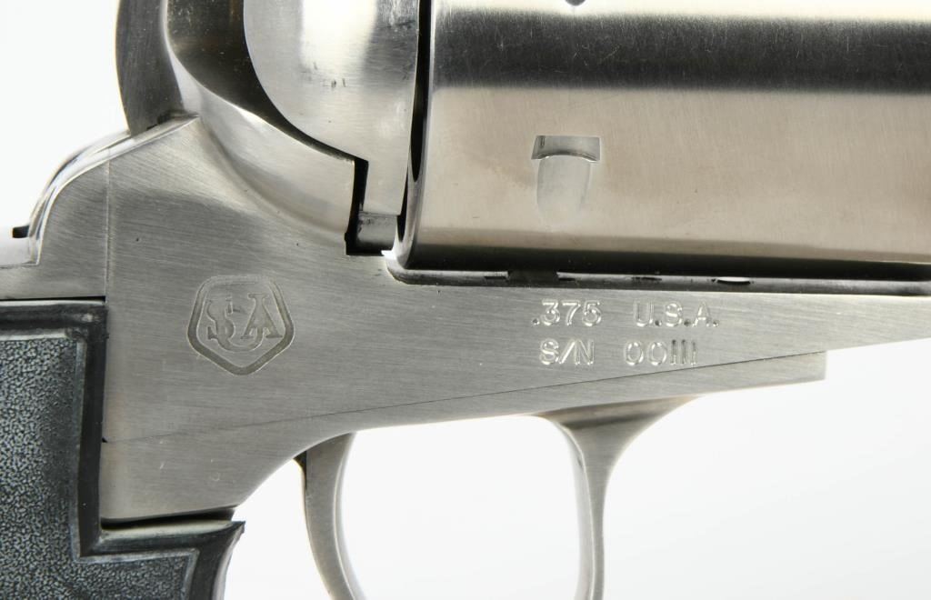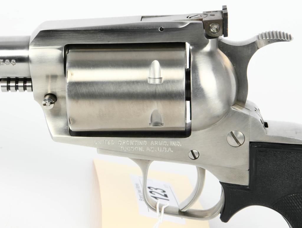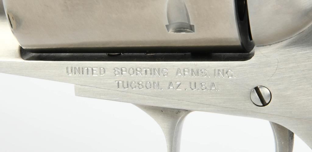 Majestic Power: United Sporting Arms Seville Silhouette Single Action Revolver in .375 Super Mag Embark on a journey into the extraordinary with the United Sporting Arms Seville Silhouette Single Action Revolver, a majestic firearm chambered in the formidable .375 Super Mag. Crafted in Stainless Steel, this revolver boasts a commanding 10 1/2" barrel, setting a new standard for power and precision. The Pachmayr grips, a signature of quality, add both elegance and functionality to this rare find. Designed for comfort and control, they complement the stainless steel construction, creating a harmonious blend of style and substance. What makes this revolver truly exceptional is its early Serial #00111, marking it as a collector's gem. A rare find indeed, it speaks to the exclusivity of this Seville Silhouette, making it a coveted piece for enthusiasts and collectors alike. In the realm of firearms, the .375 Super Mag is a symbol of uncompromising power, and this Seville Silhouette Single Action Revolver embraces that legacy. Whether displayed as a collector's pride or taken to the range for an unparalleled shooting experience, this rare find is a testament to the craftsmanship and innovation of United Sporting Arms. Secure your place in history with the United Sporting Arms Seville Silhouette, where each shot fired echoes the power and precision of the mighty .375 Super Mag. This revolver is not just a firearm; it's a rare discovery that elevates your collection to new heights.