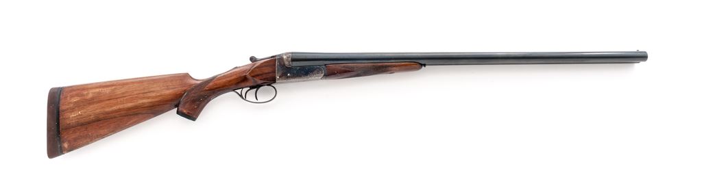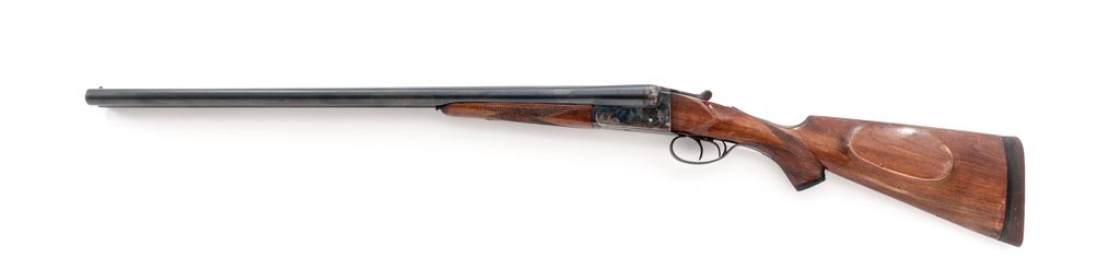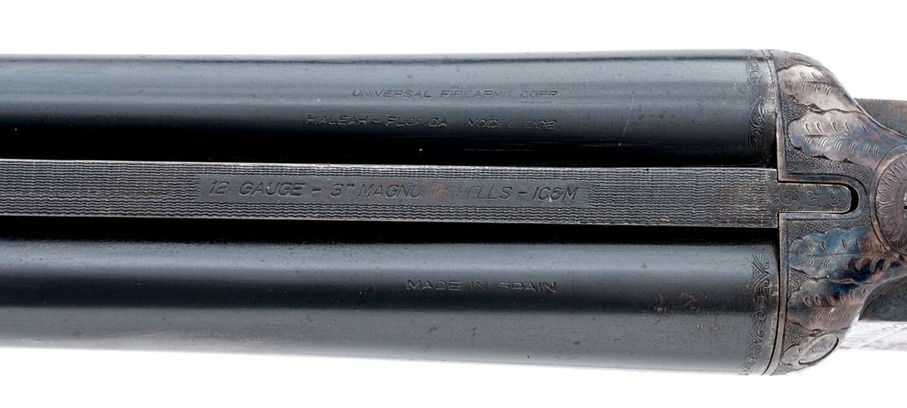 Universal Firearms Model 308 Field Grade Side-by-Side Shotgun, #65727. 12 ga. 26'' barrels have 3'' chambers and are choked IC./Mod. Boxlock action uses a Greener crossbolt lockup and features double triggers, auto safety, and plain extractors. Receiver is case hardened and lightly engraved. Field Grade walnut used on slender forend and pistol-grip buttstock, which includes a grip cap, cheekpiece and uncommon Hillock recoil pad. Mfg'd approx. 1970 by Zabala in Spain. Condition is good, with numerous handling marks to wood. Action does not stay locked open, but otherwise functions well; bores are dirty. Est.: $250-$350. (Modern)