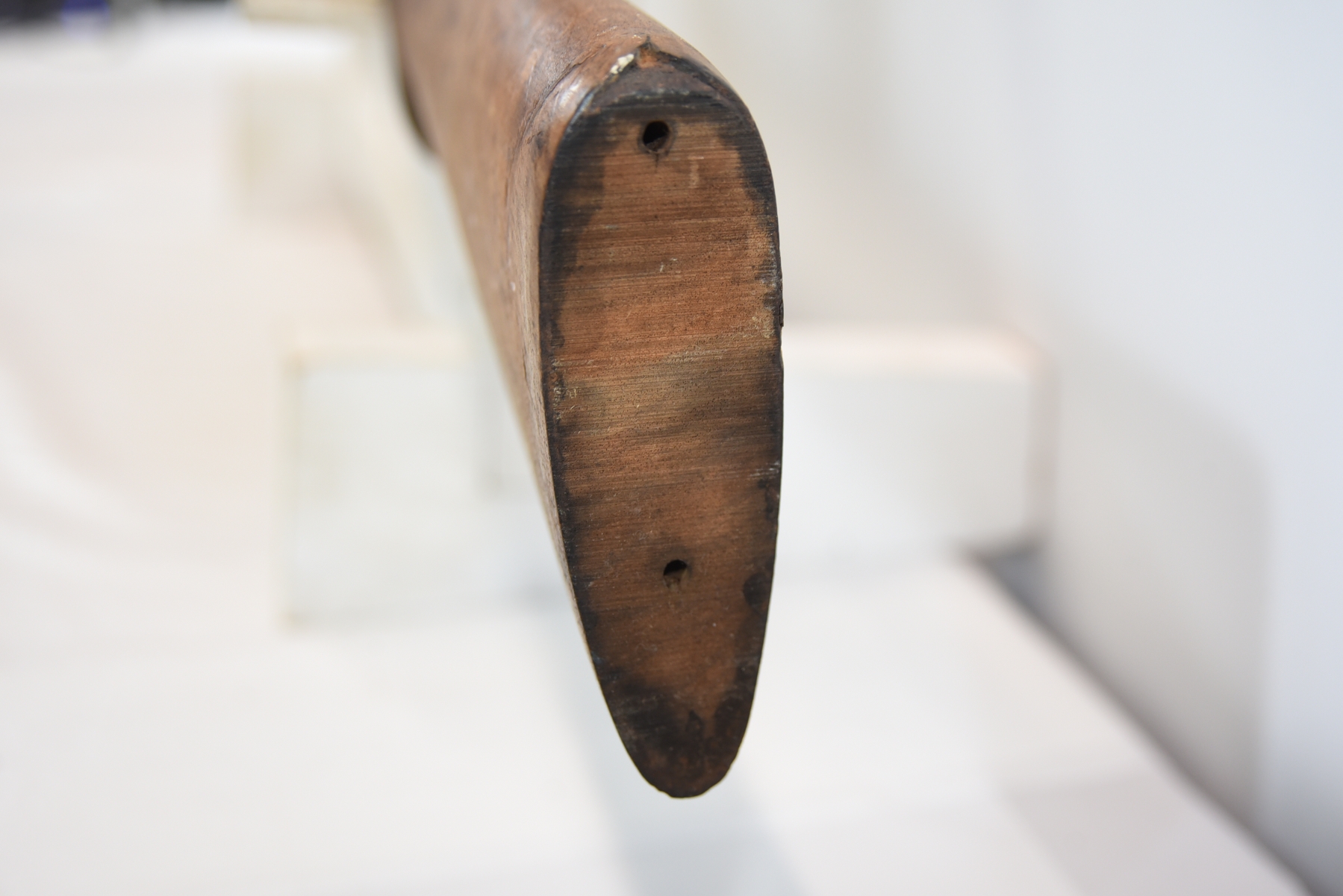 Wood shows worn finish, scratches, scuffs, light dents; condition is less than fair.