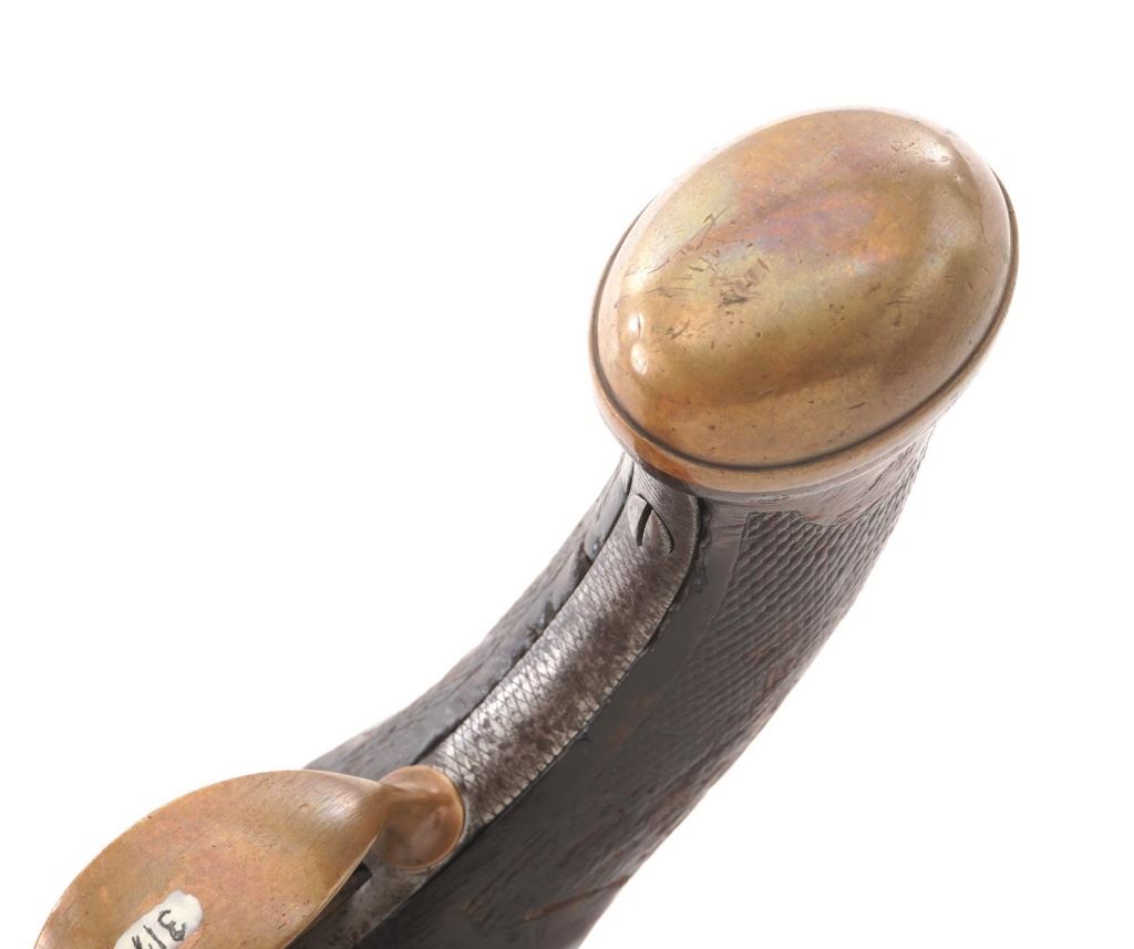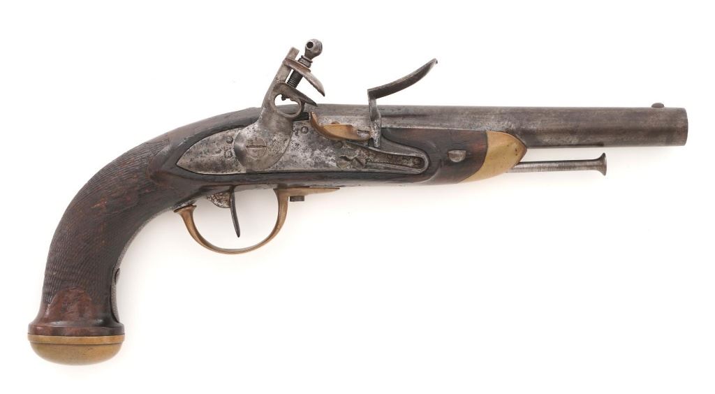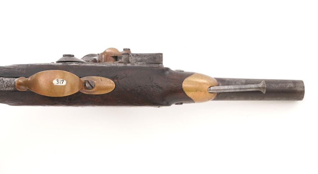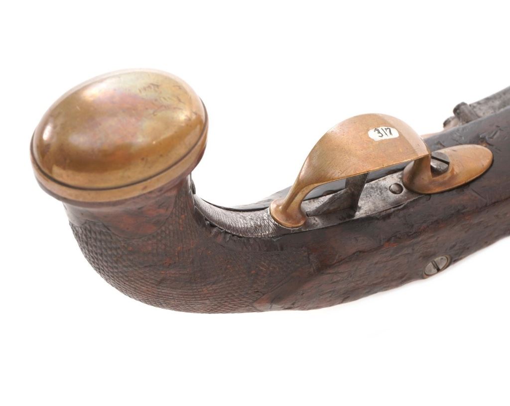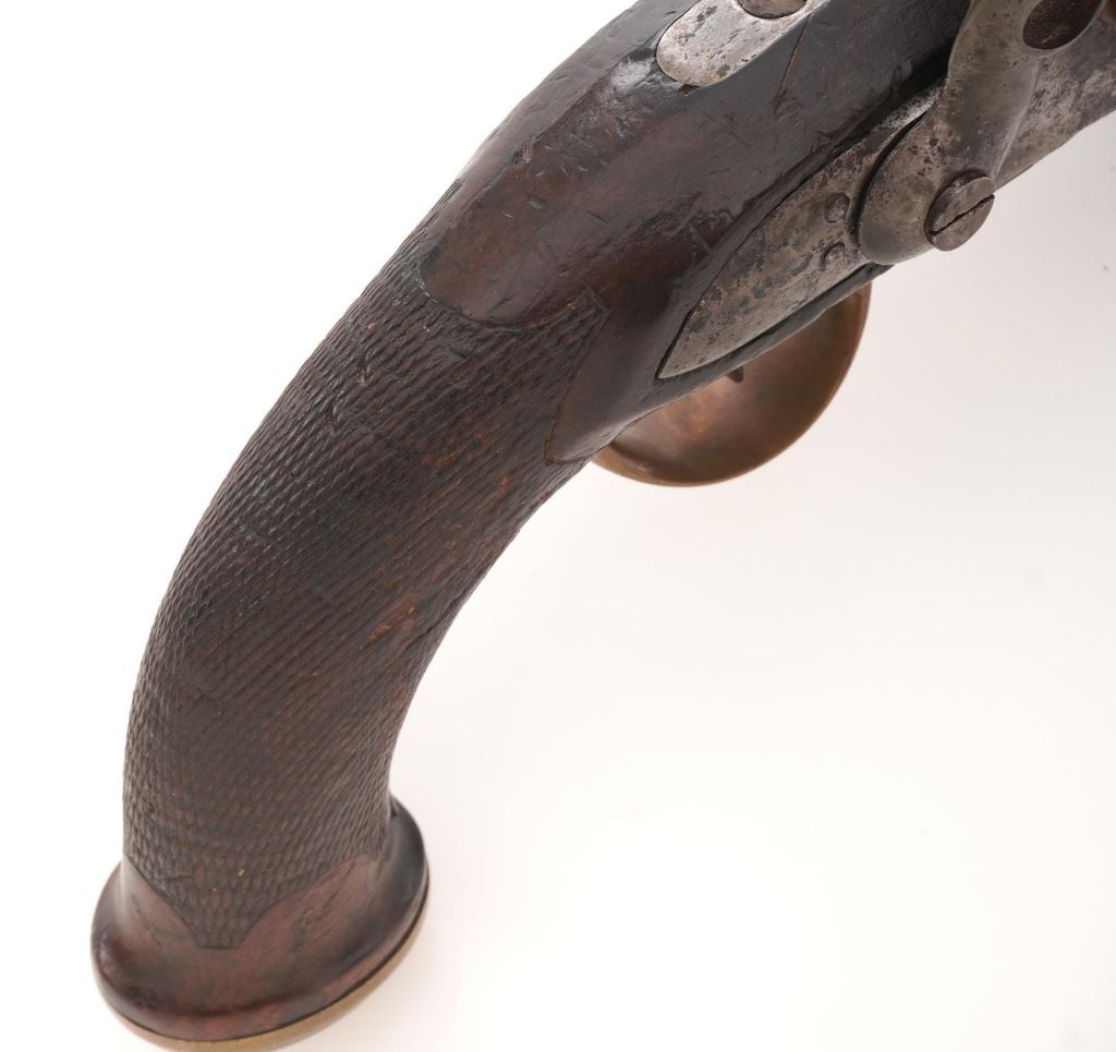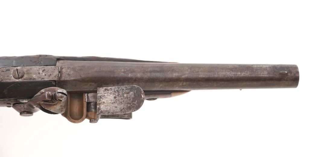 Unmarked Antique Flintlock Pistol, #NVSN, .69 cal., 8" barrel, dark gray patina to the iron parts. Trigger guard, forend cap, buttcap, and pan are brass. Checkered hardwood stock is fair, displaying considerable old dings and scratches. There are no visible markings. Overall condition of this pistol is fair to good. Action is crisp, bore shows moderate erosion. Est.: $500-$700. (Antique)