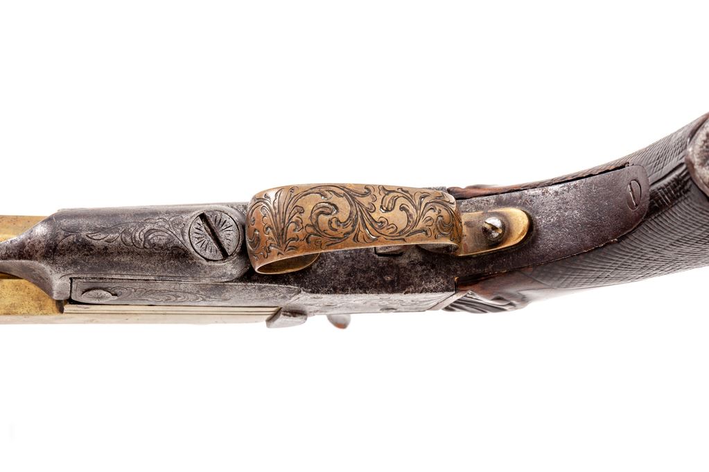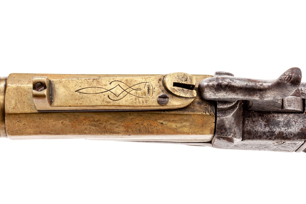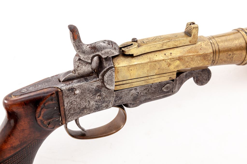 A Most Unusual Antique Brass-Barrel Breechloading Pinfire Blunderbuss Pistol, NVSN, approx. .76 cal. (10ga.), 6.625'' round-to-octagonal tip-up barrel with cannon rings at muzzle and midpoint, has odd adjustable separate sighting plane, bells to 2'' at muzzle; frame has Belgian ''view'' mark and a ''(star)/M'' proof mark at inner breech, raised panels at both recoil shields, central hammer, shotgun-style underlever barrel release, separate brass trigger guard, integral saw-handle gripstraps, checkered one-piece walnut grips with flat buttcap. Frame, underlever and trigger guard show floral engraving; grips have raised floral-carved panels on both sides at frame juncture. Condition is very good, the steel parts retain no original finish (may have originally been bright) but an overall frosted gunmetal gray with good engraving and markings, brass with light toning. Grips are solid with lightly worn checkering and carving, the steel buttplate with overall pitting and a possible replacement. Action is strong and sure; bore is clean with a 1'' section of near-straight, deep rifling at midpoint. Est.: $800-$1,200. (Antique)(John Ackerman collection)