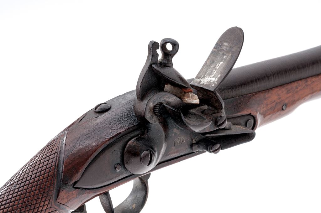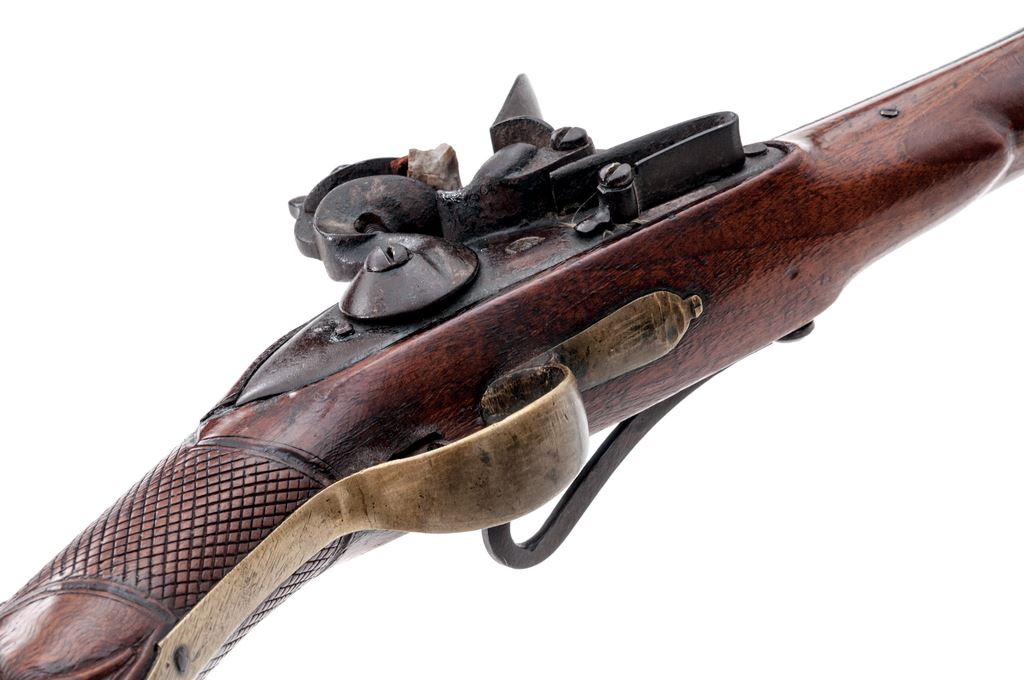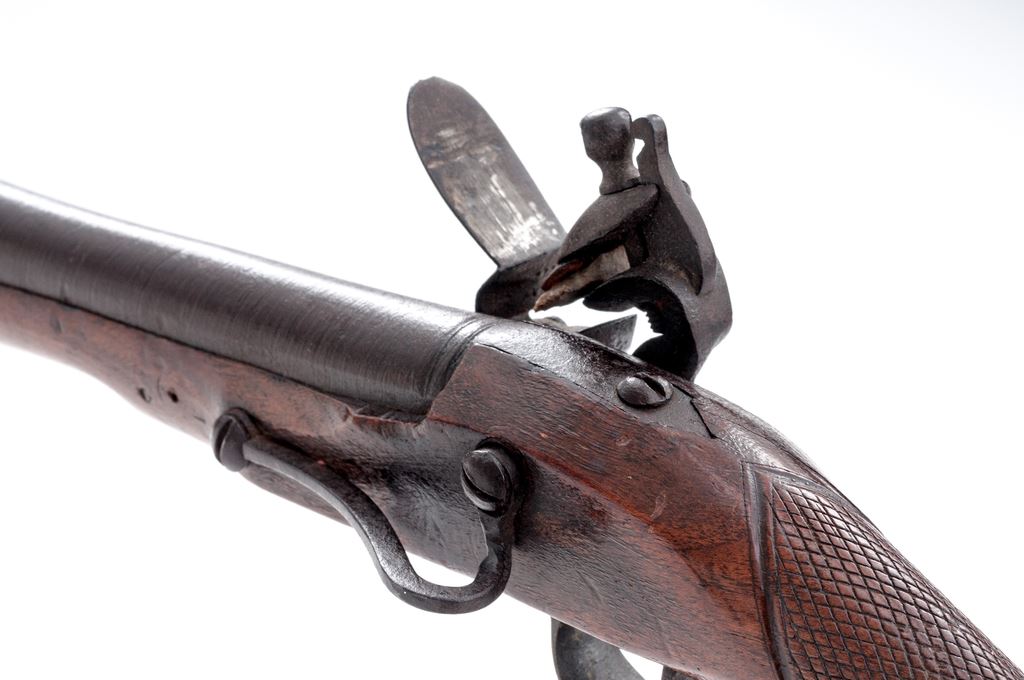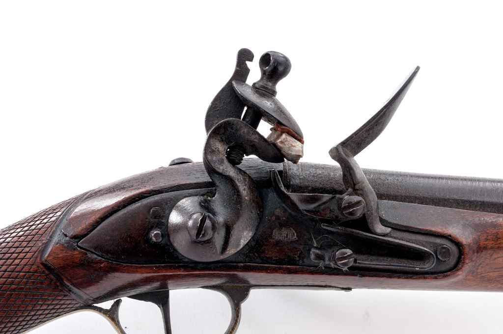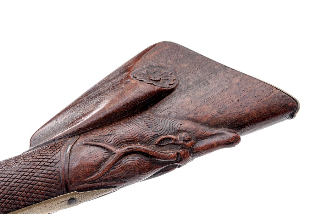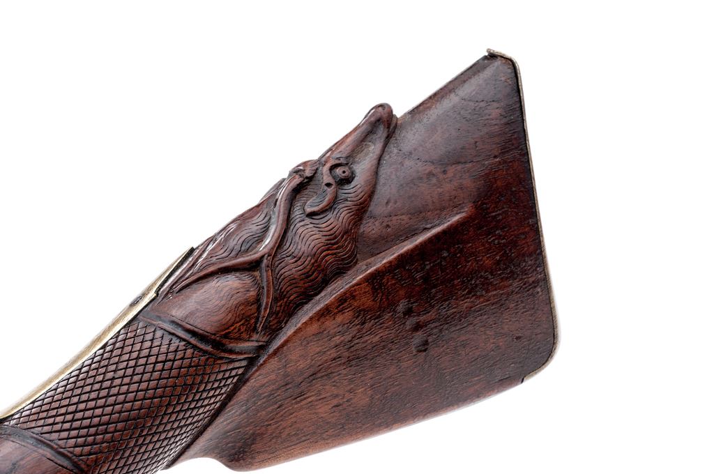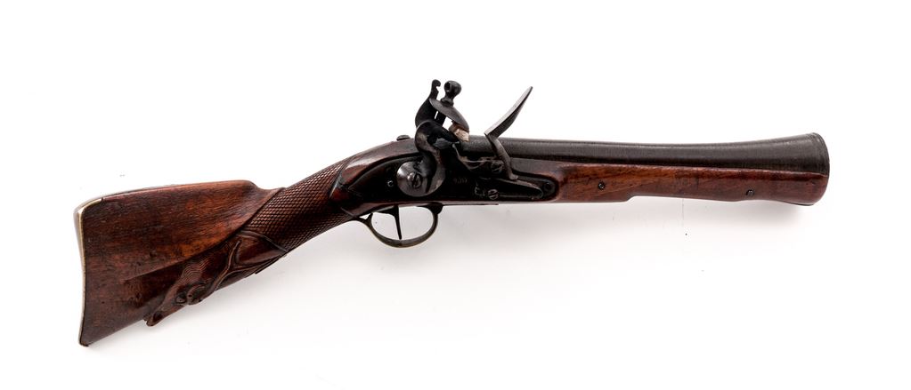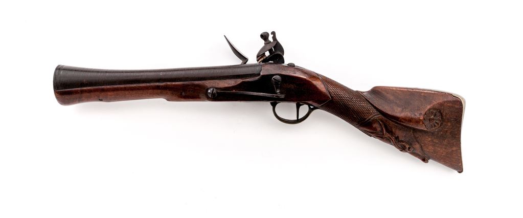 Unusual European Single-Shot Flintlock Blunderbuss Pistol, NVSN, approx. .60 cal., pin-retained 9.875'' round barrel bells to 1.875'' at cannon-turned muzzle, has unusual turning/grooved marks (to resemble twisted steel?) along its full length but is otherwise unmarked; military-style rounded lockplate with teat at rear shows a bear silhouette ahead of reinforced flint cock; brass furniture includes loop trigger guard with long-finial tangs and buttplate with stepped top tang; varnished hardwood fullstock has checkering at wrist, a carved pronghorn-type antelope head along belly, raised cheekpiece with circular flower motif at rear, and steel lanyard loop at left side. Overall length is 20.25''. Mfg'd ca. 1790-1825. Pistol appears to be in original flintlock configuration, with unbushed touchhole and original parts. Condition is very good, the steel parts showing no original finish but an overall deep brown patina, brass moderately age-toned. Stock is solid and smooth with good checkering and carvings, a minor wood loss behind lock teat, light marks, and most original varnish. Action is very strong; smoothbore shows deep black powder etching. Est.: $700-$900. (Antique)(John Ackerman collection)