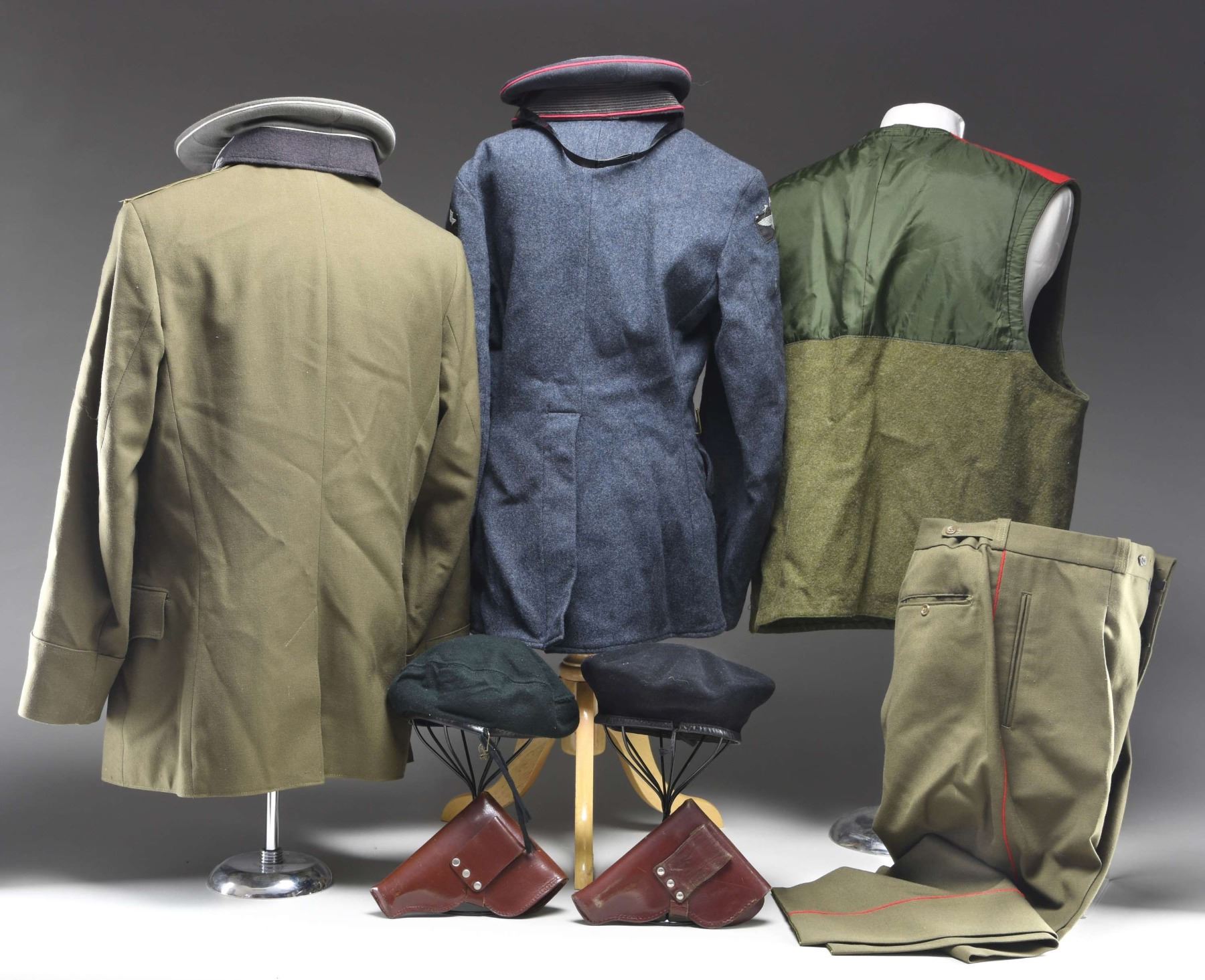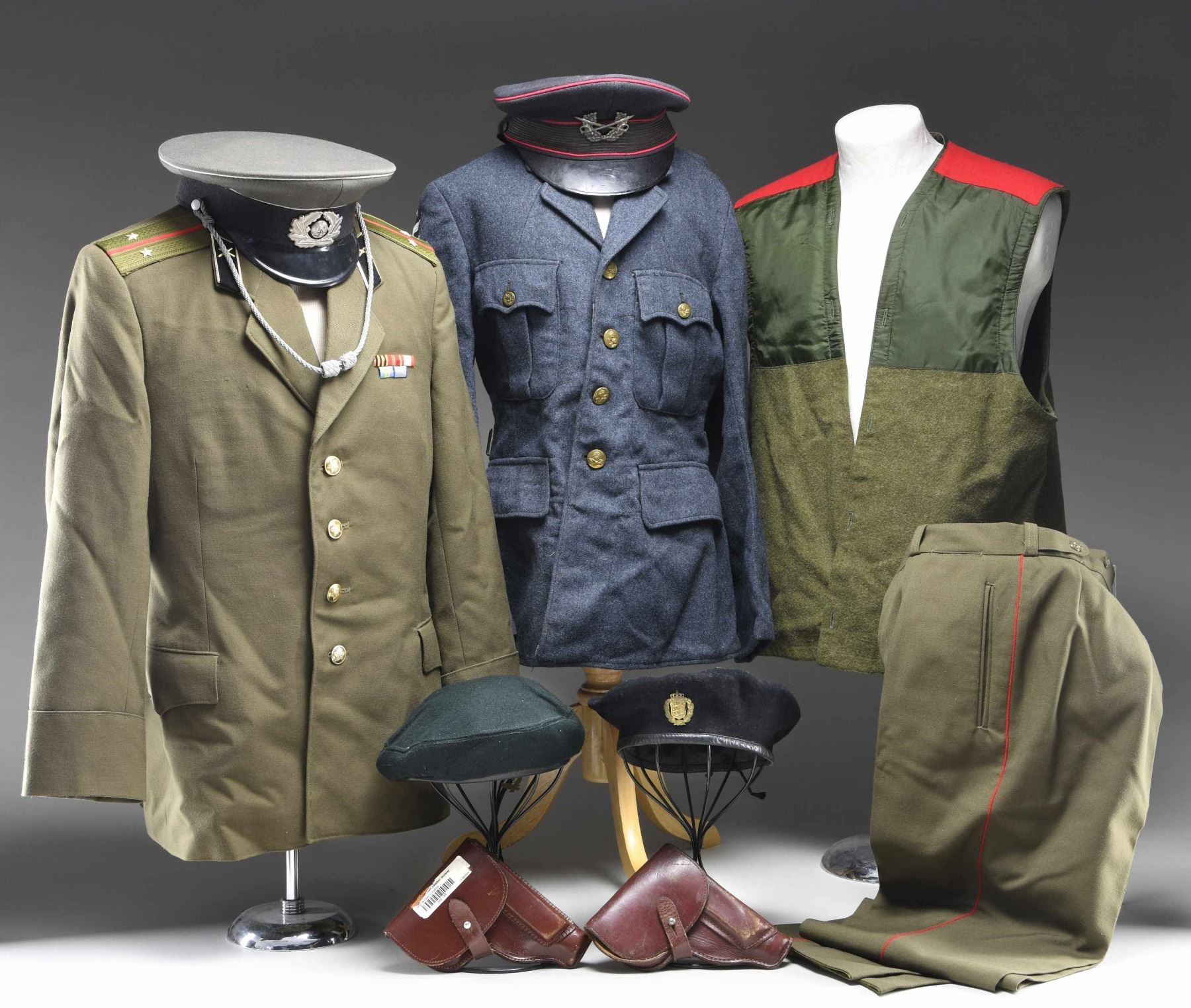 This eclectic group includes 1 West German visor cap. / 1 East German visor cap. / 2 holsters for Makarov pistols. / 1 black beret of Danish origin. / 1 dark green beret, possibly of US origin. / 1 Canadian WWII era Airforce enlisted uniform coat. / 1 Russian Army tunic and pants. / 1 overcoat liner for a South African uniform. CONDITION: all items show light wear. One holster has a sticky-tag on the outside that, when removed, may effect the finish. (02-24041/BF). $150-300.
