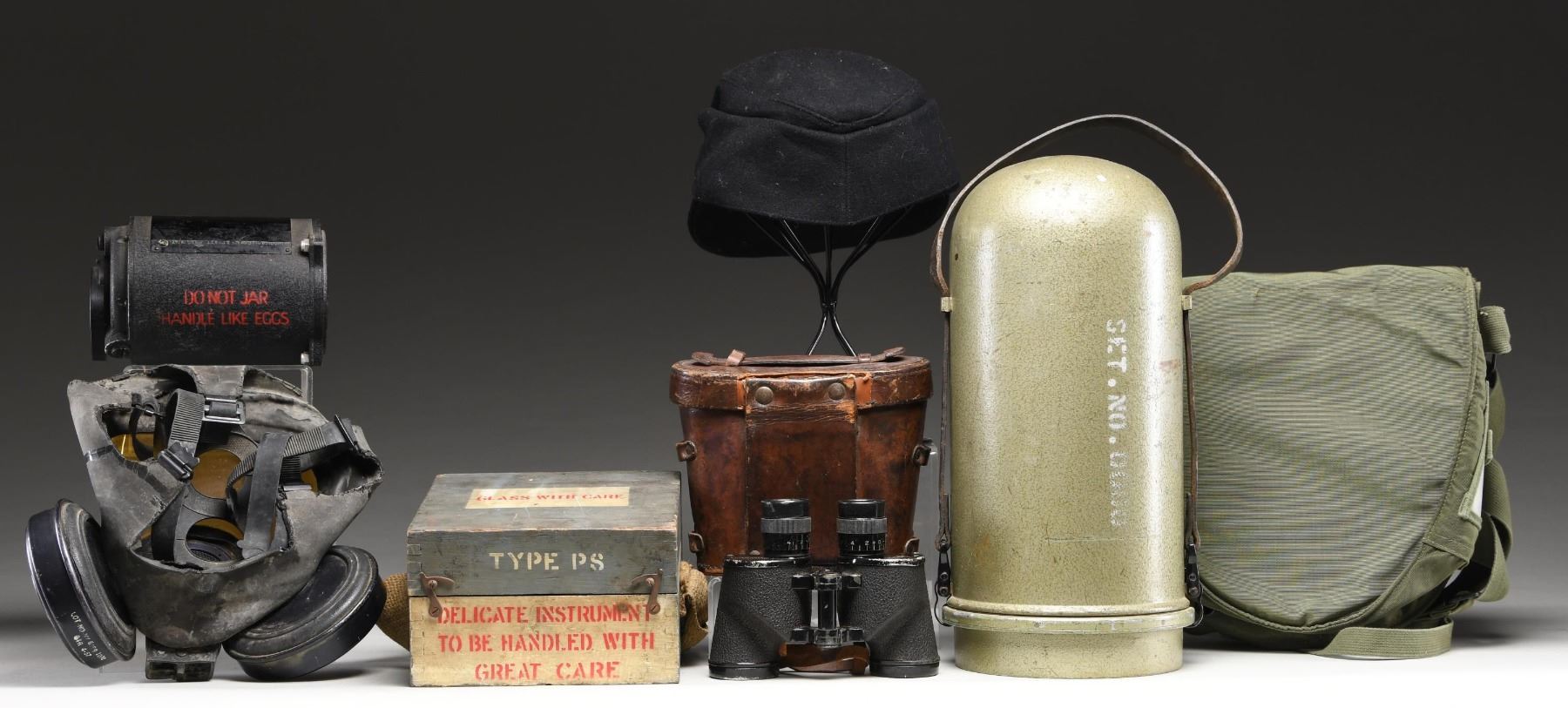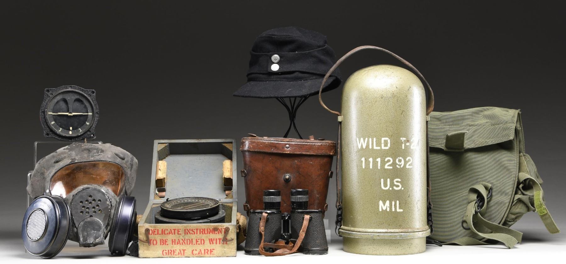 AND MORE. This varied lot includes 1 / T2 survey device marked on its metal case "WILD T-2 111292 U.S. MIL". The apparatus inside reads "FSN 6675-988-5225 CONTR DAAE-13-67-C-0687" & "WILD HEEBRUGG SWITZERLAND T-2 111292 MIL". It is further marked on the front "US 1967" and is painted sage green overall. 1 / Spitfire level finished in black that reads 6A/1519 18461/43" & "DO NOT JAR HANDLE LIKE EGGS". 1 / Spitfire compass in a gray wooden case that reads "GLASS WITH CARE", "TYPE PS" and "DELICATE INSTRUMENT TO BE HANDLED WITH GREAT CARE", twice. The interior has a black finished liquid filled compass. 1 / Pair of binoculars finished in black. It is marked "BINOCULAR M3 6 X 30" & "WESTINGHOUSE 1942 H.M.R.". It is housed in its original leather case. 1 / Green nylon carrying bag with shoulder strap. 1 / Gas mask marked "LOT.NO.NY 6159 1070 GTR 4.57". 1 / Reproduction WWII German SS M43 style soft cap in black with 2 SS buttons on the front; CONDITION: All items show light wear. Instruments have not been tested but appear fully functional. Hat shows slight wear. Binoculars are functional. (02-24497-6/BF). $500-800.