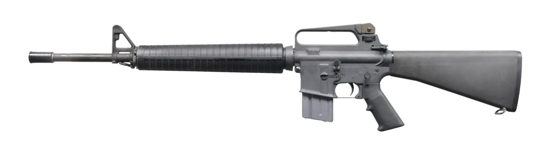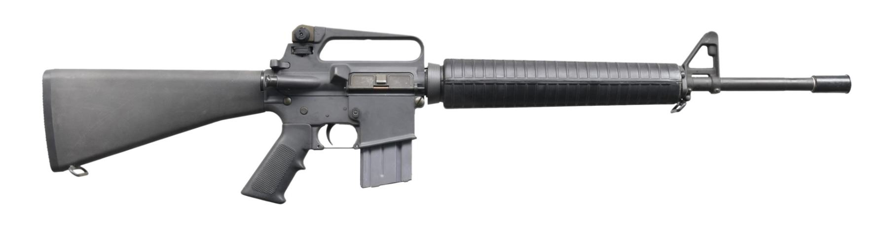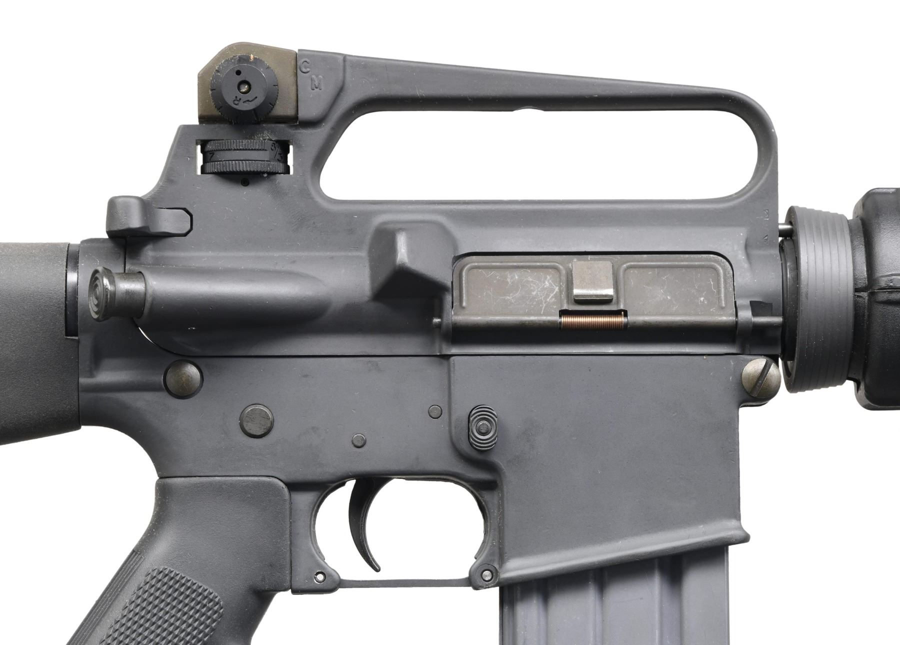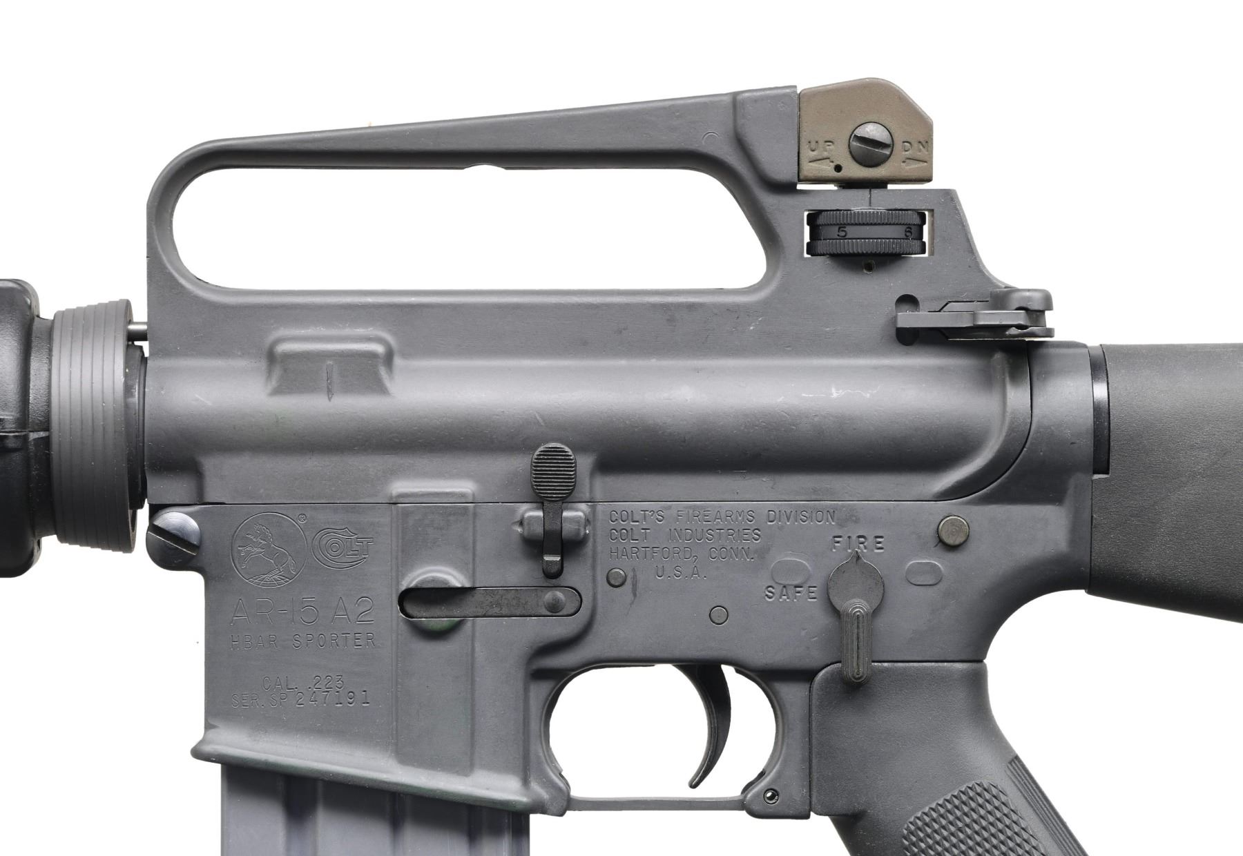 SUBCALIBER CONVERSION KIT. Cal. 223. S# SP247191. Bbl. 20". A nice transitional era Colt H-Bar Sporter. Threaded, heavy 1/7 barrel terminated w/ A2 flash hider. Protected post front sight / gas block w/ no bayonet lug. Full length A2 rifle handguards retained w/ tapered delta ring. Duel screw front takedown pin. Carry handle upper receiver w/ round forward assist & brass deflector. Dual aperture, windage & elevation adjustable rear peep sight. Full length shoulder stock w/ trap door for cleaning kit. No block in lower receiver but utilizes full slot cut bolt carrier. MAGS: 2 factory 5 rd. UNATTACHED ACCESSORIES: Original green label box, black nylon sling, .22 LR subcaliber kit w/ 10 rd. mag. & owners manual. CONDITION: All aspects indicate very little use. 22LR subcaliber kit also remains in its original factory packaging. No marks on brass deflector from ejection, which happens almost immediately. Bright bore w/ strong rifling. Fire control mechanism appears to function correctly when cycled by hand. PROVENANCE: The Estate Collection of Charles Wagner. (24-4675/JZ). MODERN. $800-1,200.