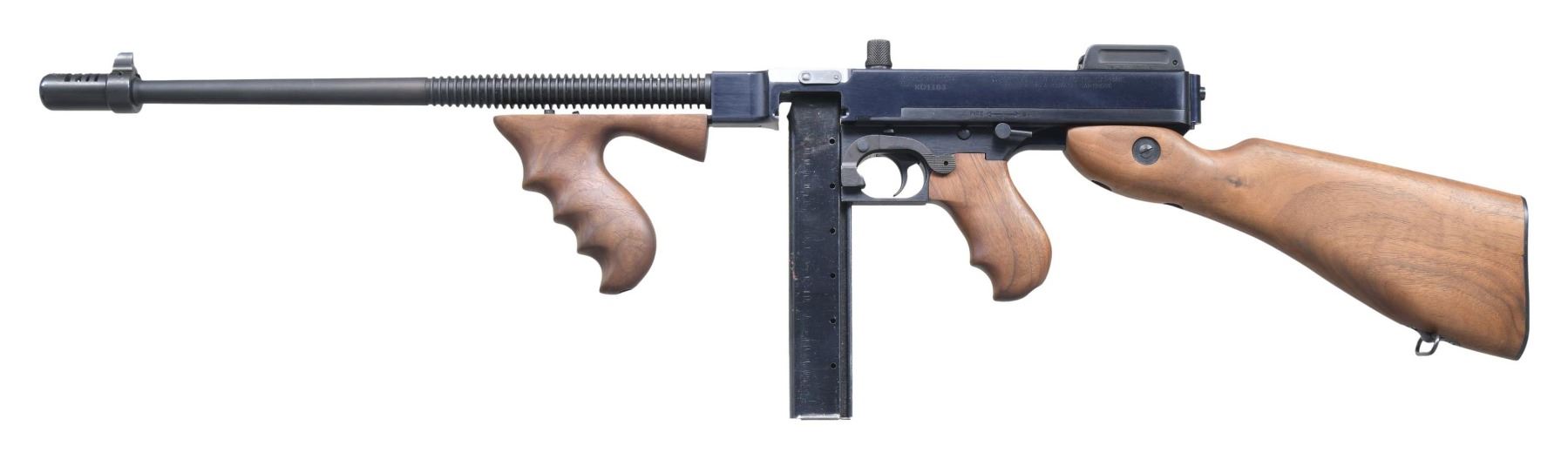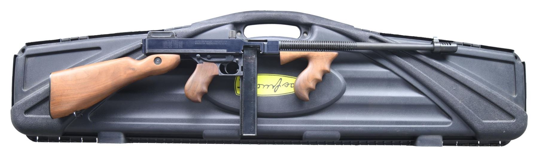 Cal. 45acp. S# KD1183. Bbl. 18" over slotted muzzle brake. Exposed blade front sight. 7.5" finned barrel section w/ 35 ribs in front of receiver. Vertical pistol grips w/ matching hardwood shoulder stock. Knurled, slotted, top mounted charging handle to accommodate sight view. Rear folding sight marked out to 600 meters w/ CQB peep. Left side of receiver marked; "MODEL OF 1927A1 / THOMPSON SEMI-AUTOMATIC CARBINE / CALIBER .45 AUTOMATIC CARTRIDGE" & serial number. Top of receiver marked w/ Thompson bullet logo. Right side marked: "AUTO-ORDNANCE COPRORATION / WORCESTER, MASSACHUSETTS U.S.A.". MAGS: (3 total) 1 steel 50 rd. "L" drum & 2 steel 30 rd. stick mags. UNATTACHED ACCESSORIES: Black plastic, foam lined "Thompson" transport case, gun lock. CONDITION: Exterior finish complete & consistent w/ some gentle thinning in areas of mechanical intervention & some light scratches on lower receiver visible under close inspection. Bright bore w/ strong rifling. Fire control mechanism appears to function correctly when cycled by hand. (25-2169/JZ). MODERN. $800-1,200.